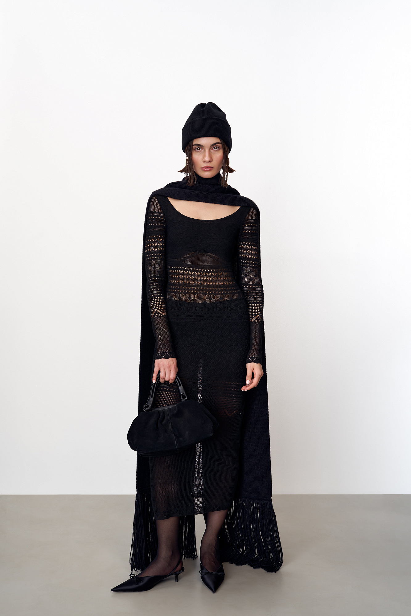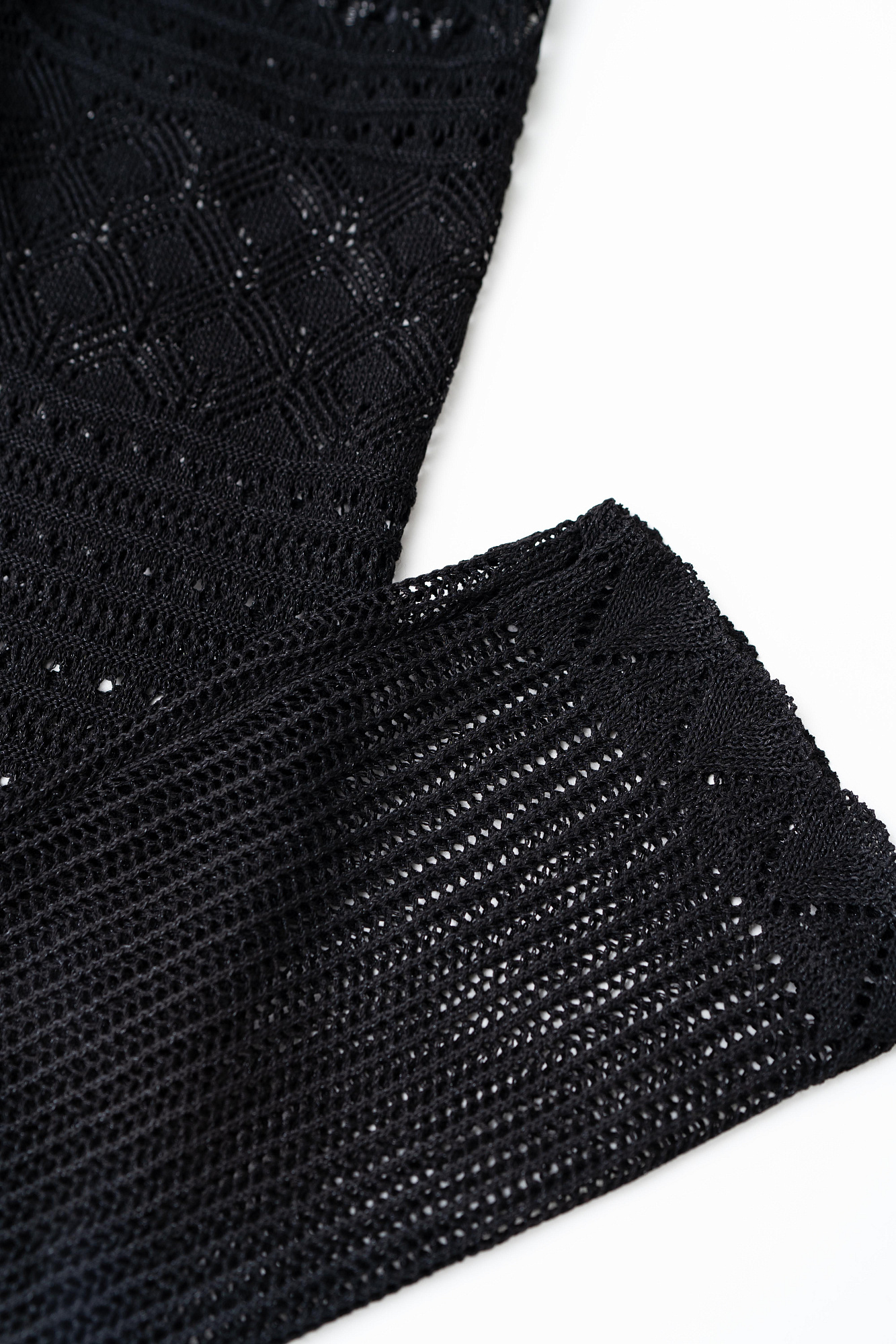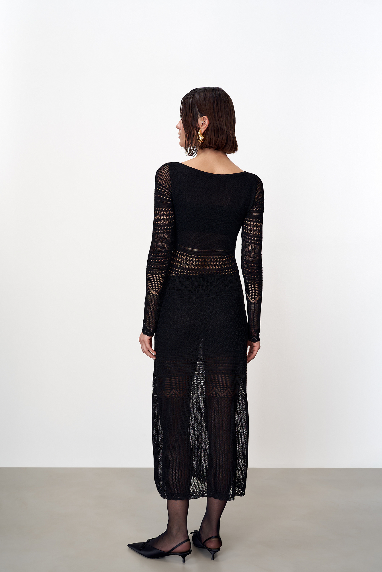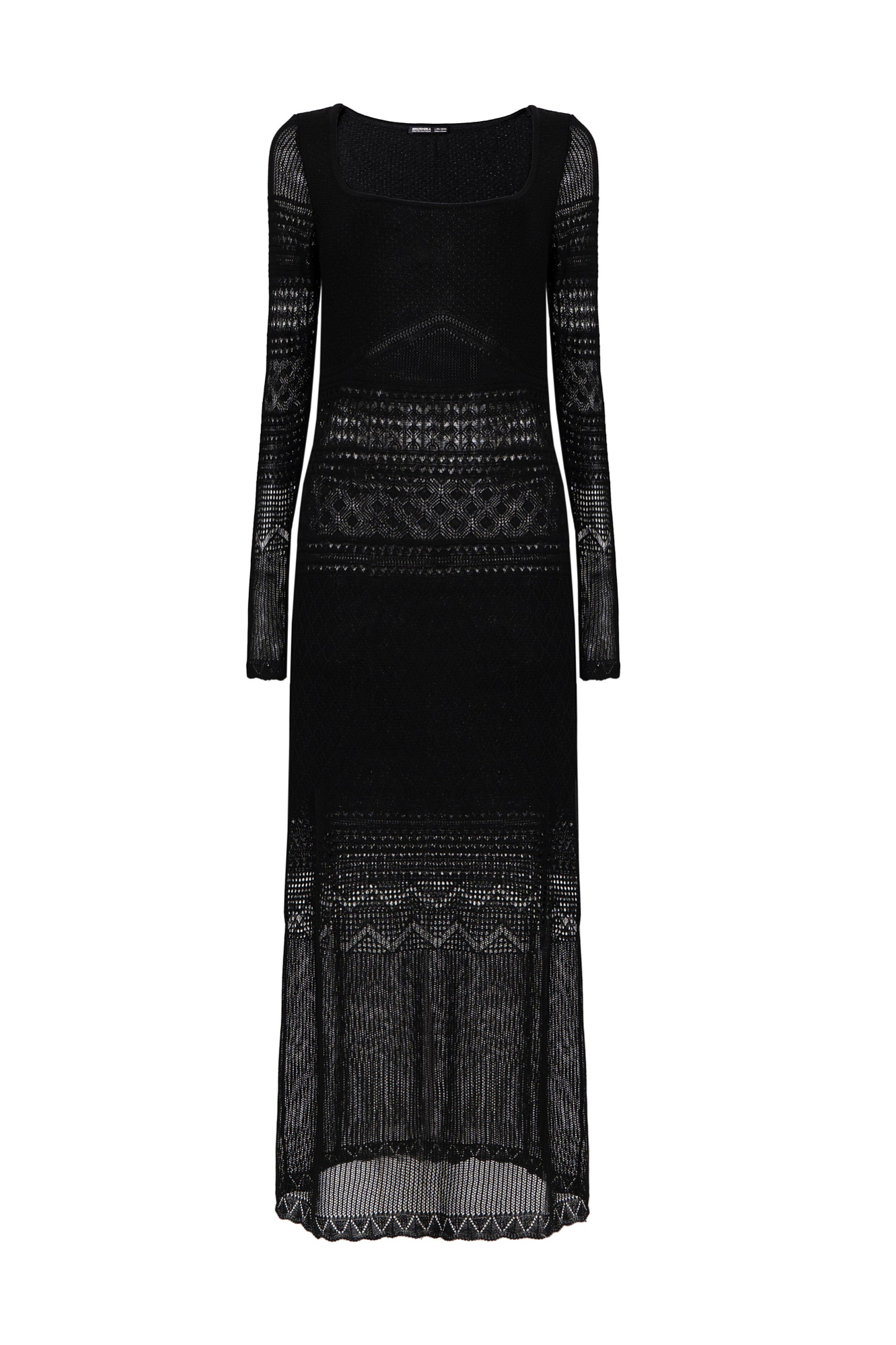 Трикотажное ажурное платье с геометрическими узорами длины миди. Модель с глубоким вырезом лодочкой, открывающим линию ключиц и длинными рукавами.