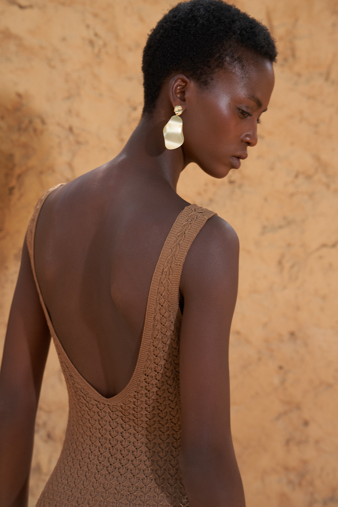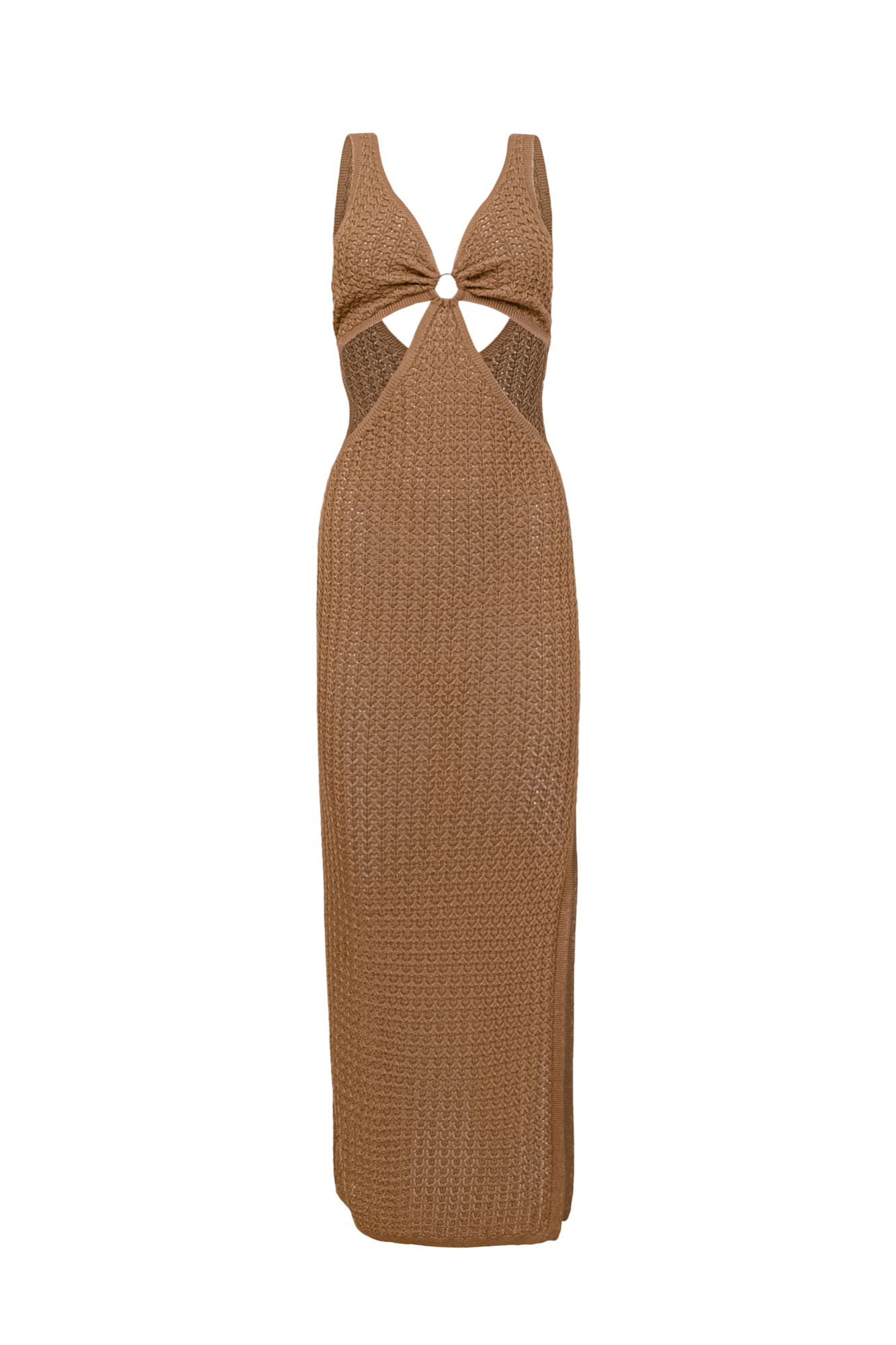 Трикотажное платье из вискозы с разрезом сбоку, кольцом на груди и открытой спиной.
