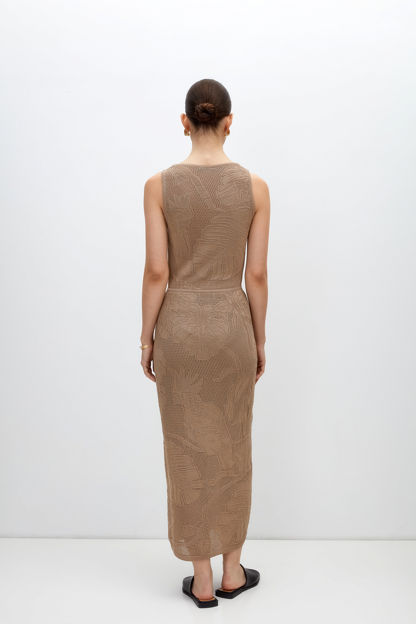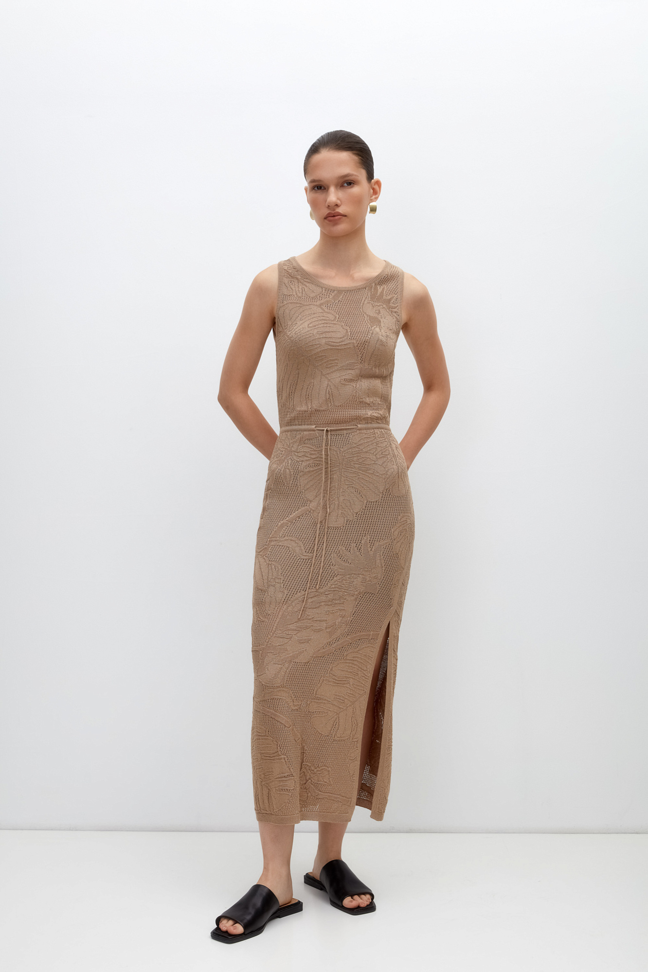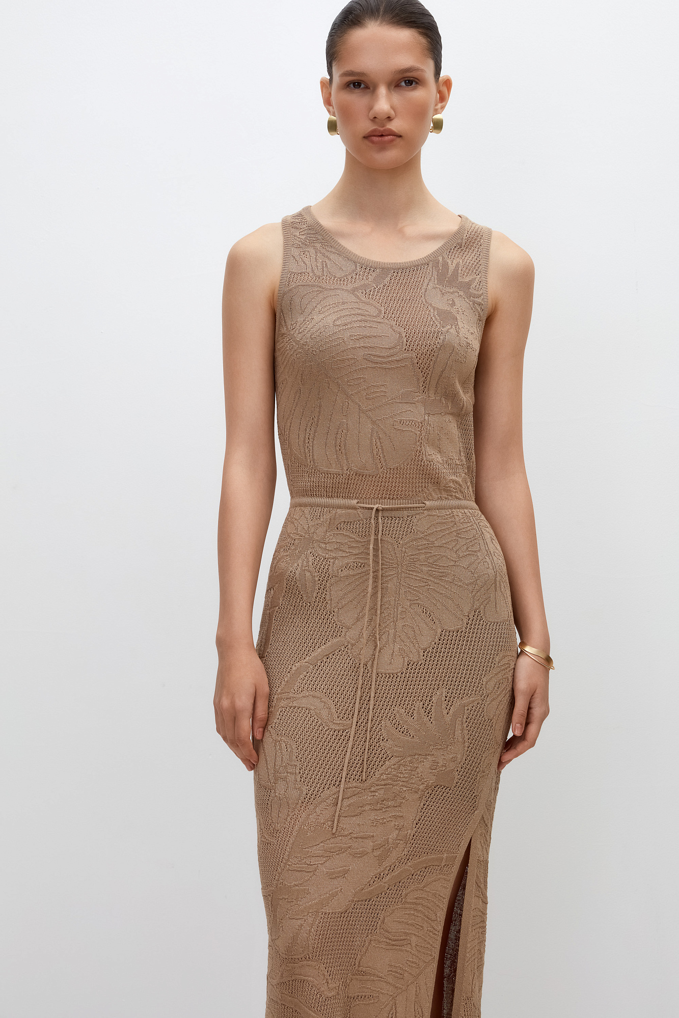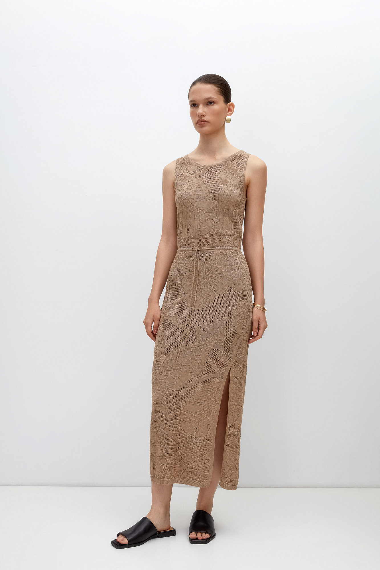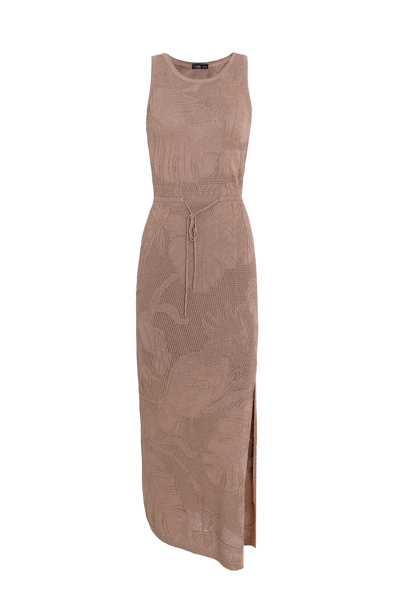 Ажурное платье длины миди из вискозы с растительным орнаментом. Модель приталенного силуэта, без рукавов, с круглым вырезом горловины.