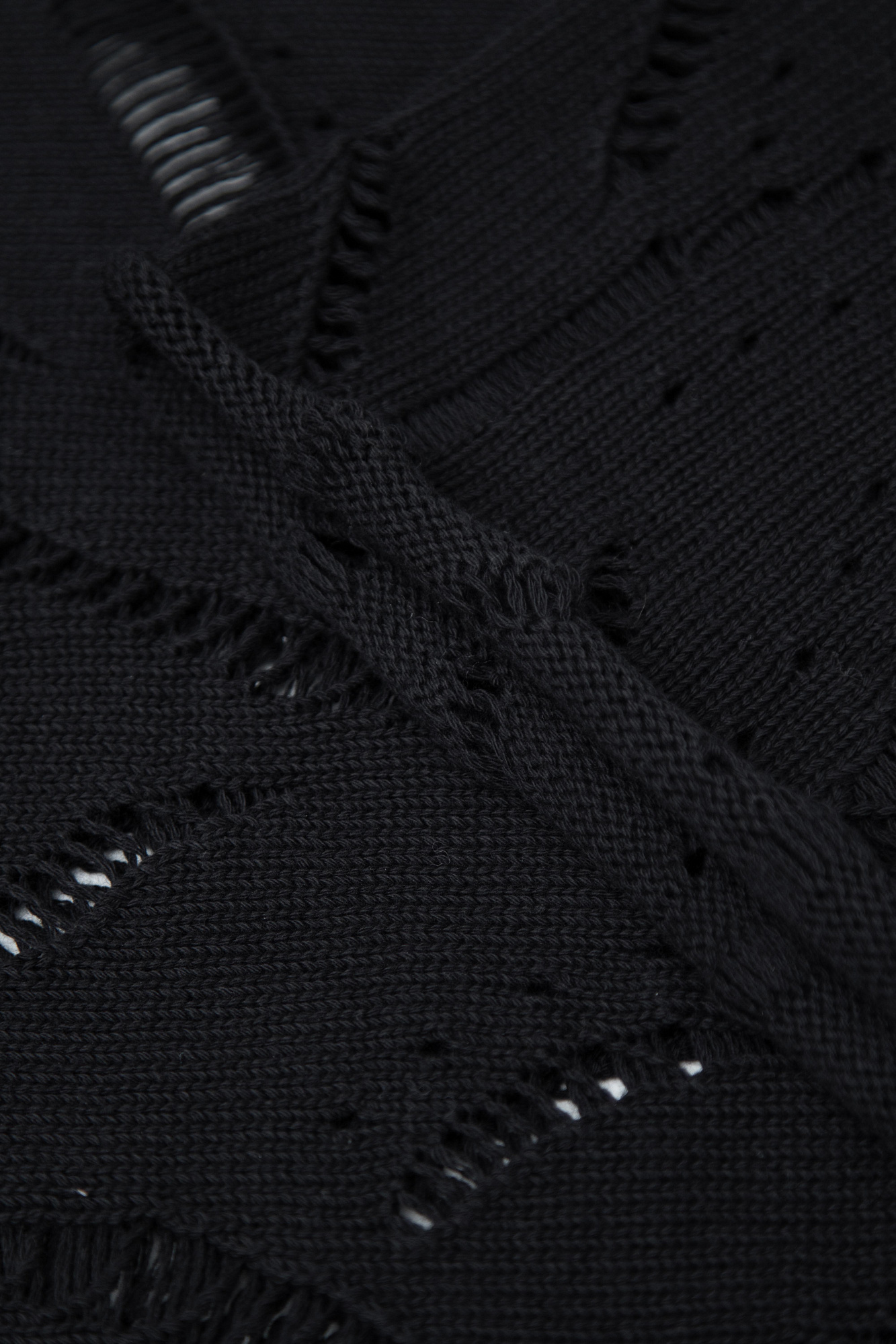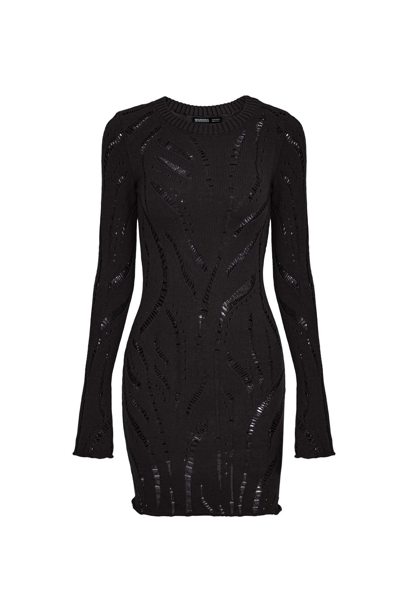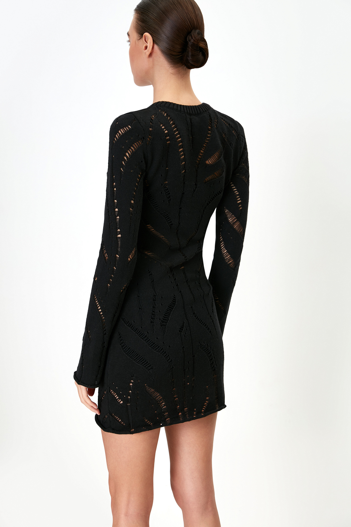Облегающее трикотажное платье мини с расклешенными рукавами и ажурным узором на основе 100% хлопка. Край изделия выполнен с имитацией закручивания.