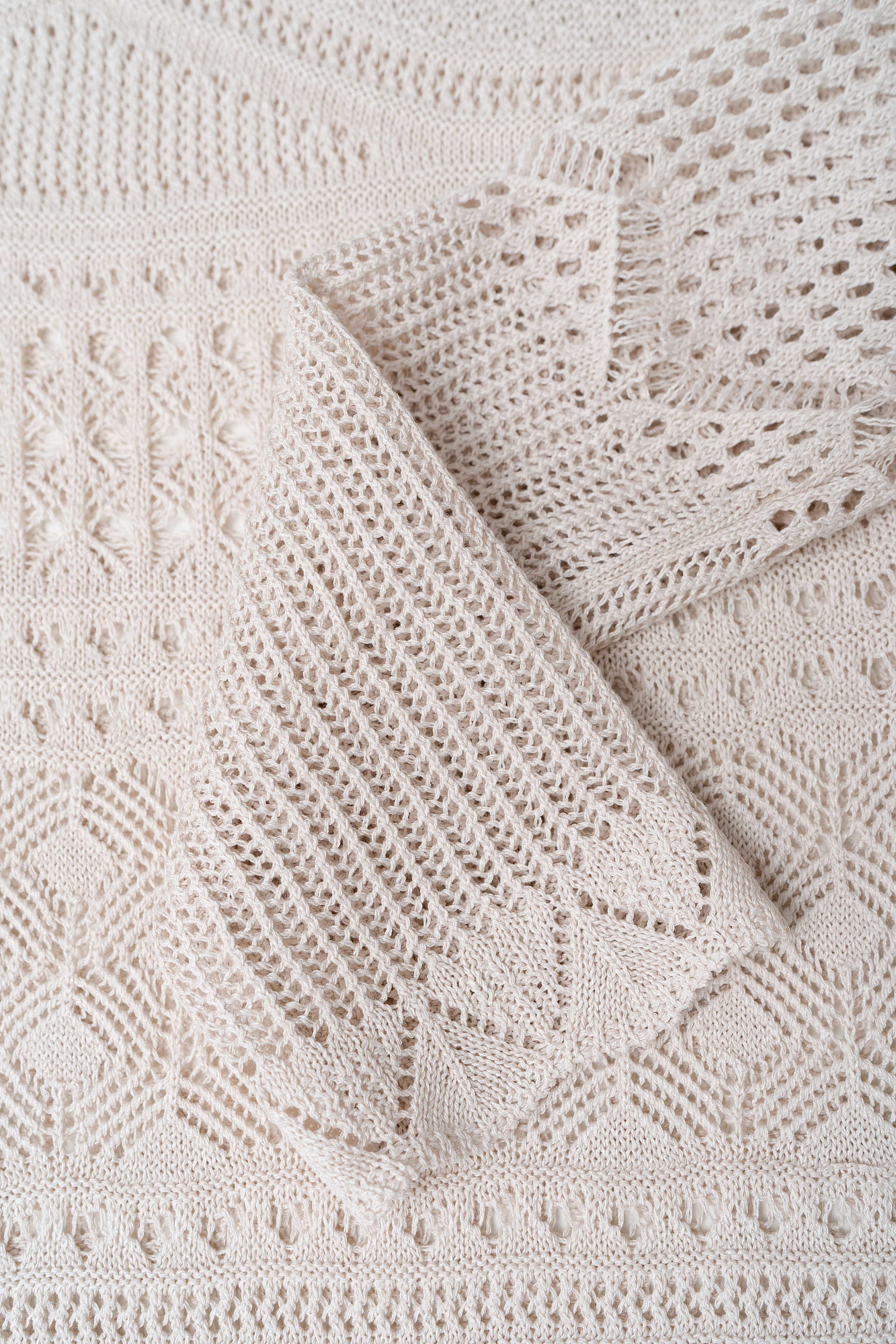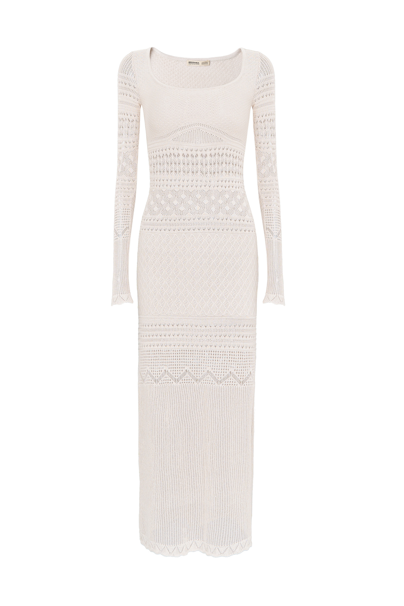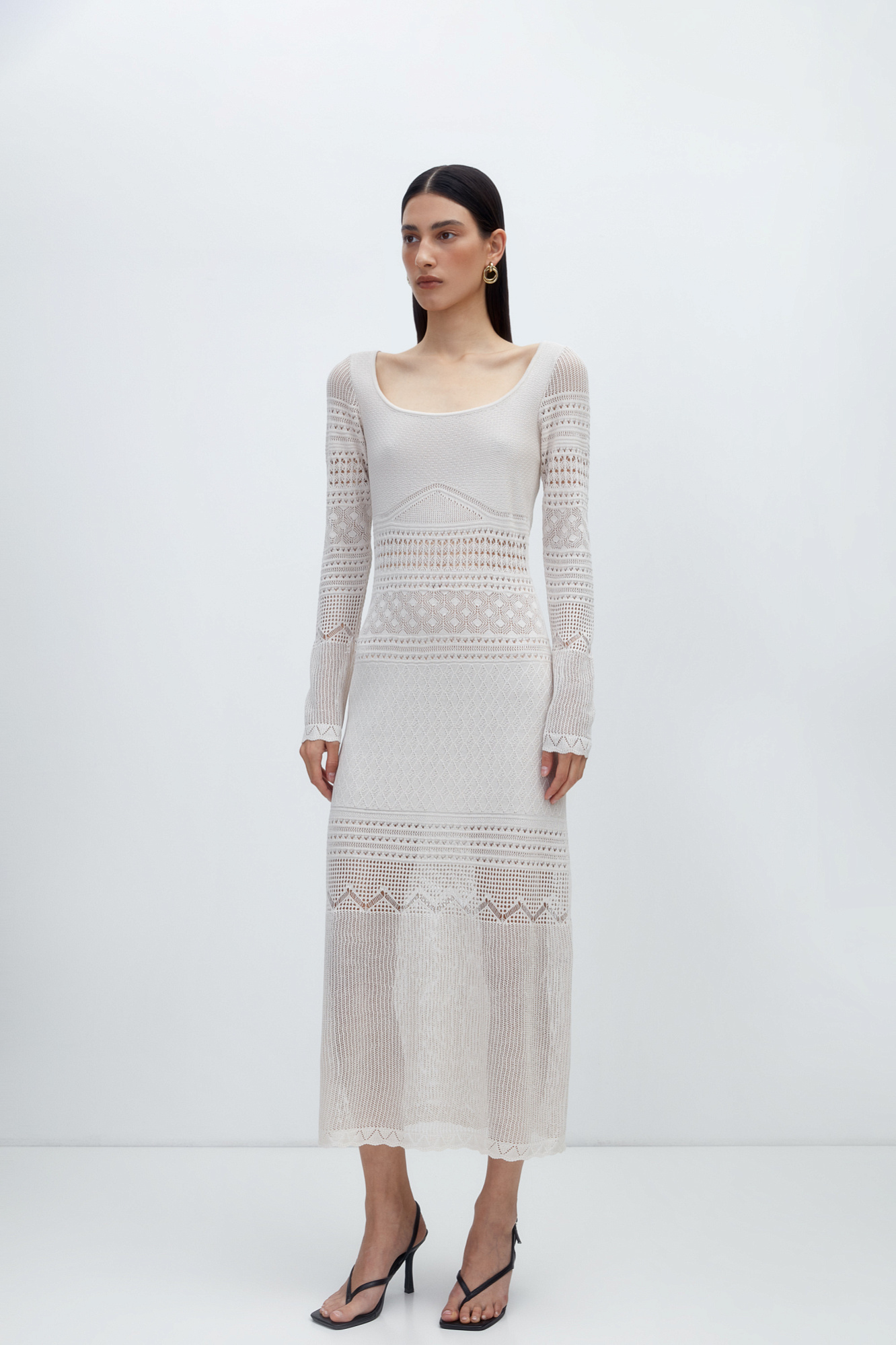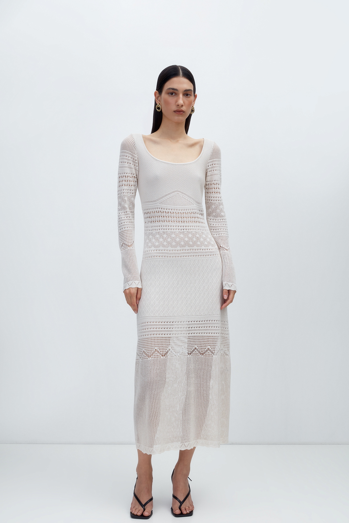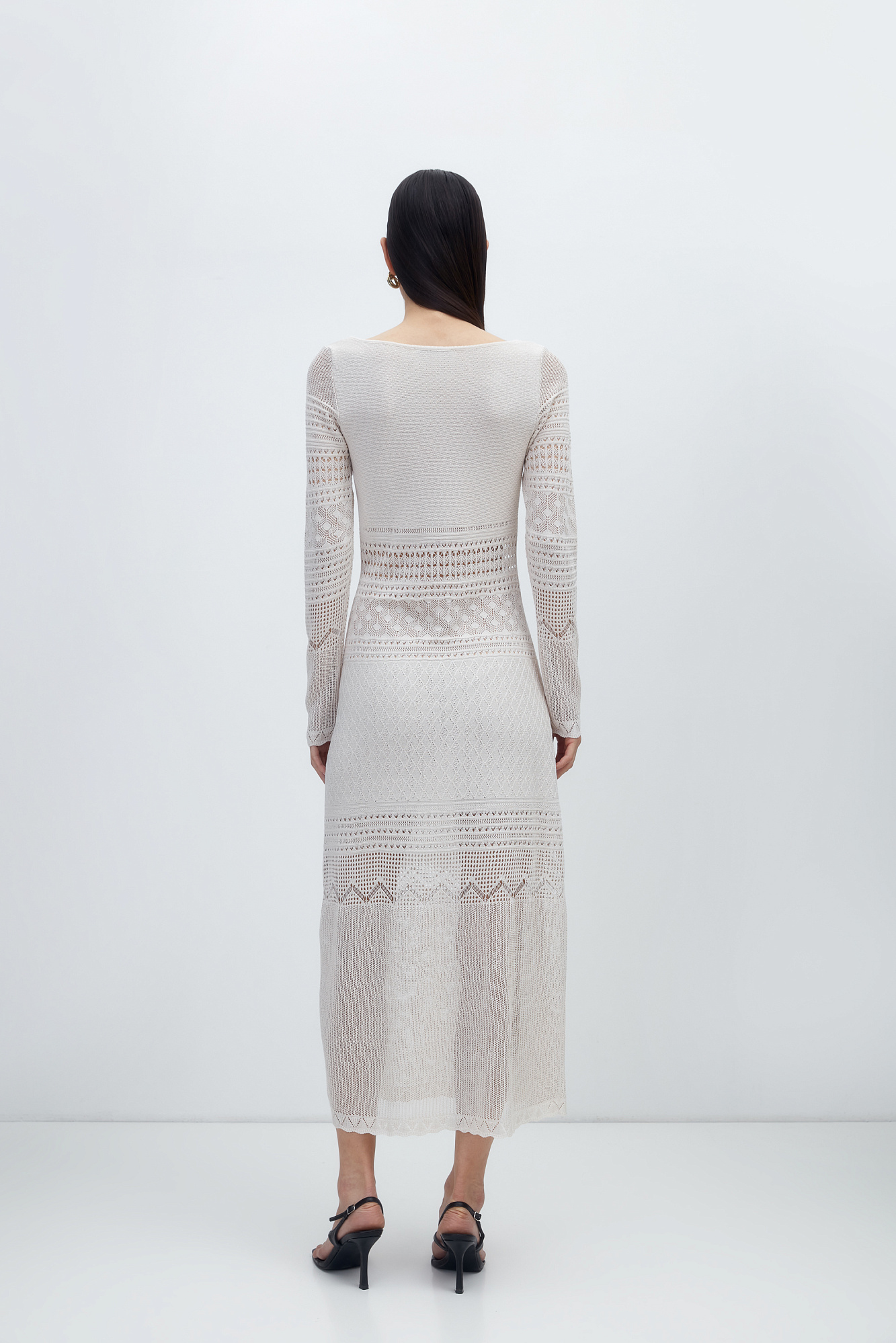 Трикотажное ажурное платье с геометрическими узорами длины миди. Модель с глубоким вырезом лодочкой, открывающим линию ключиц и длинными рукавами.