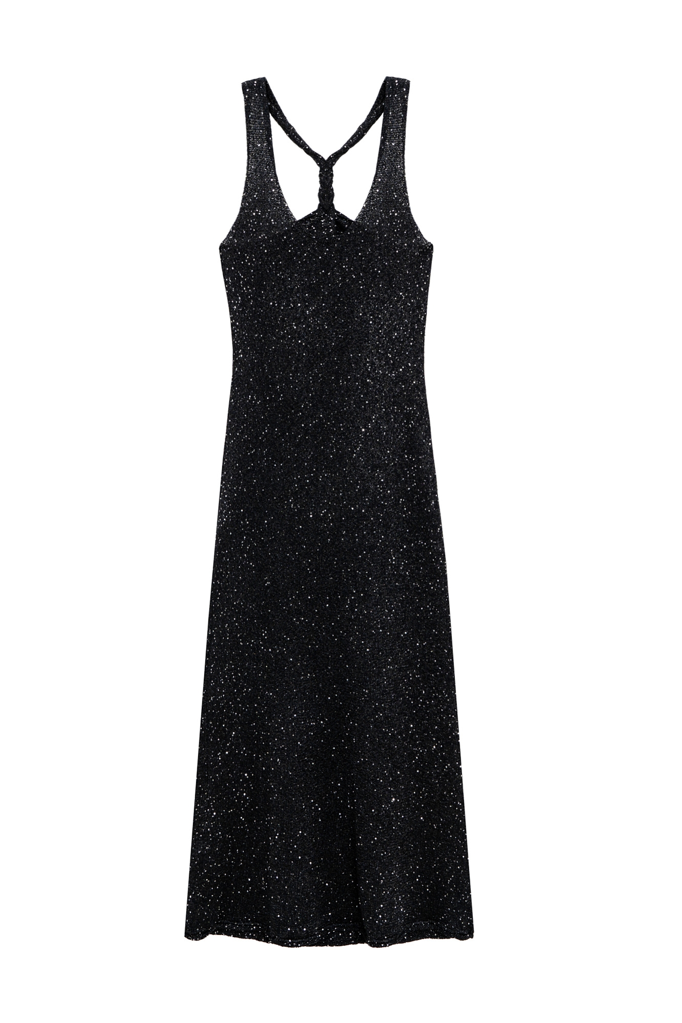 Трикотажный сарафан длины макси из хлопка с пайетками. Модель свободного кроя, на широких бретелях с перекрутом на спине и глубоким U-образным вырезом.