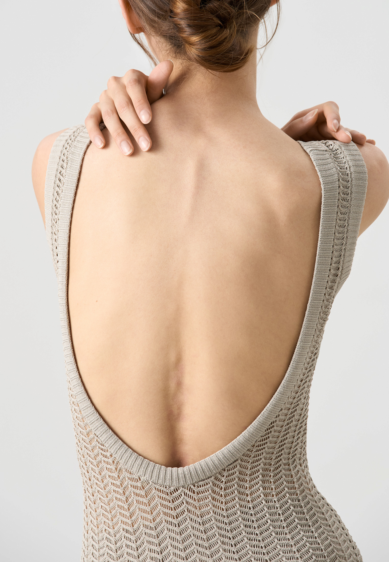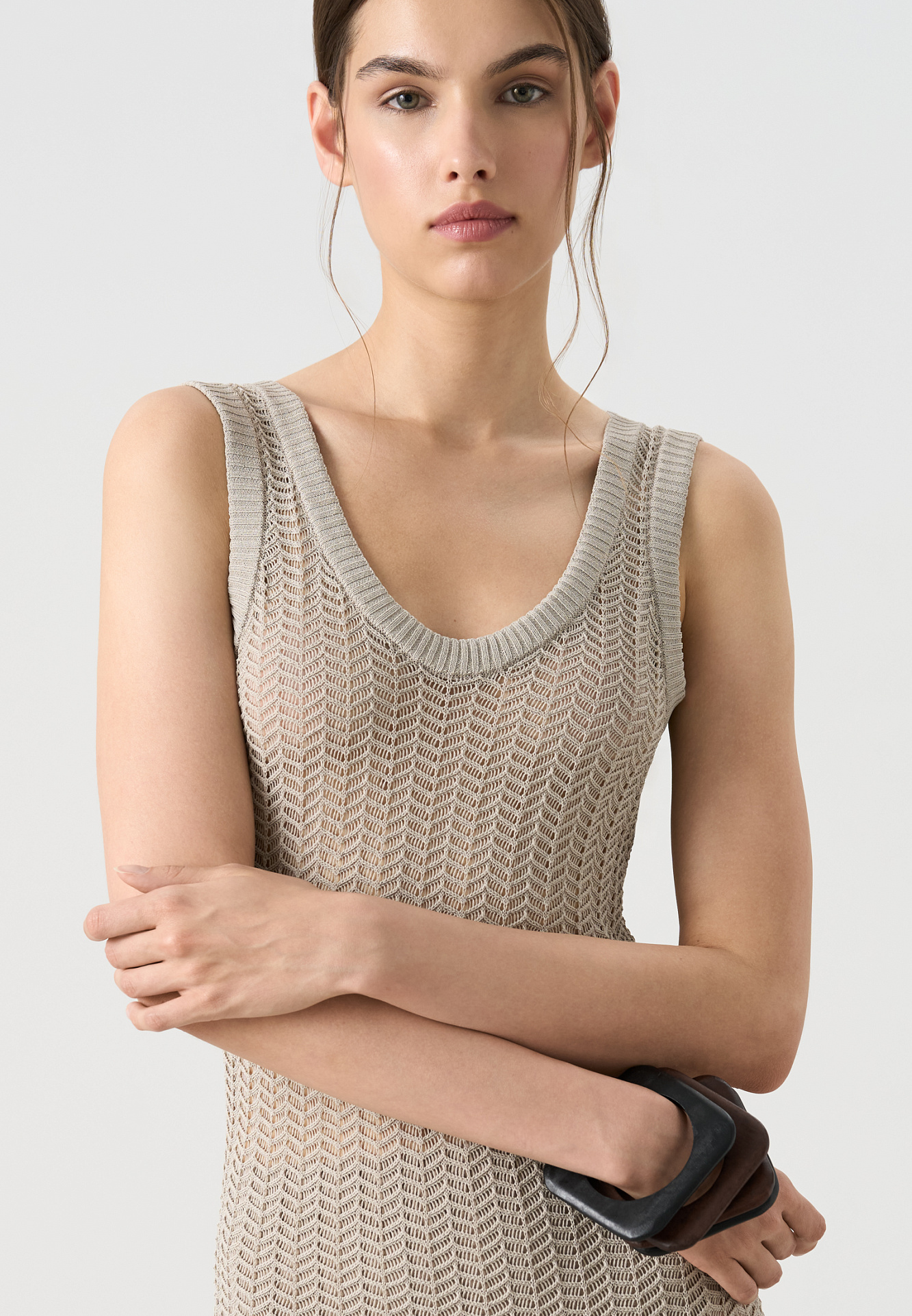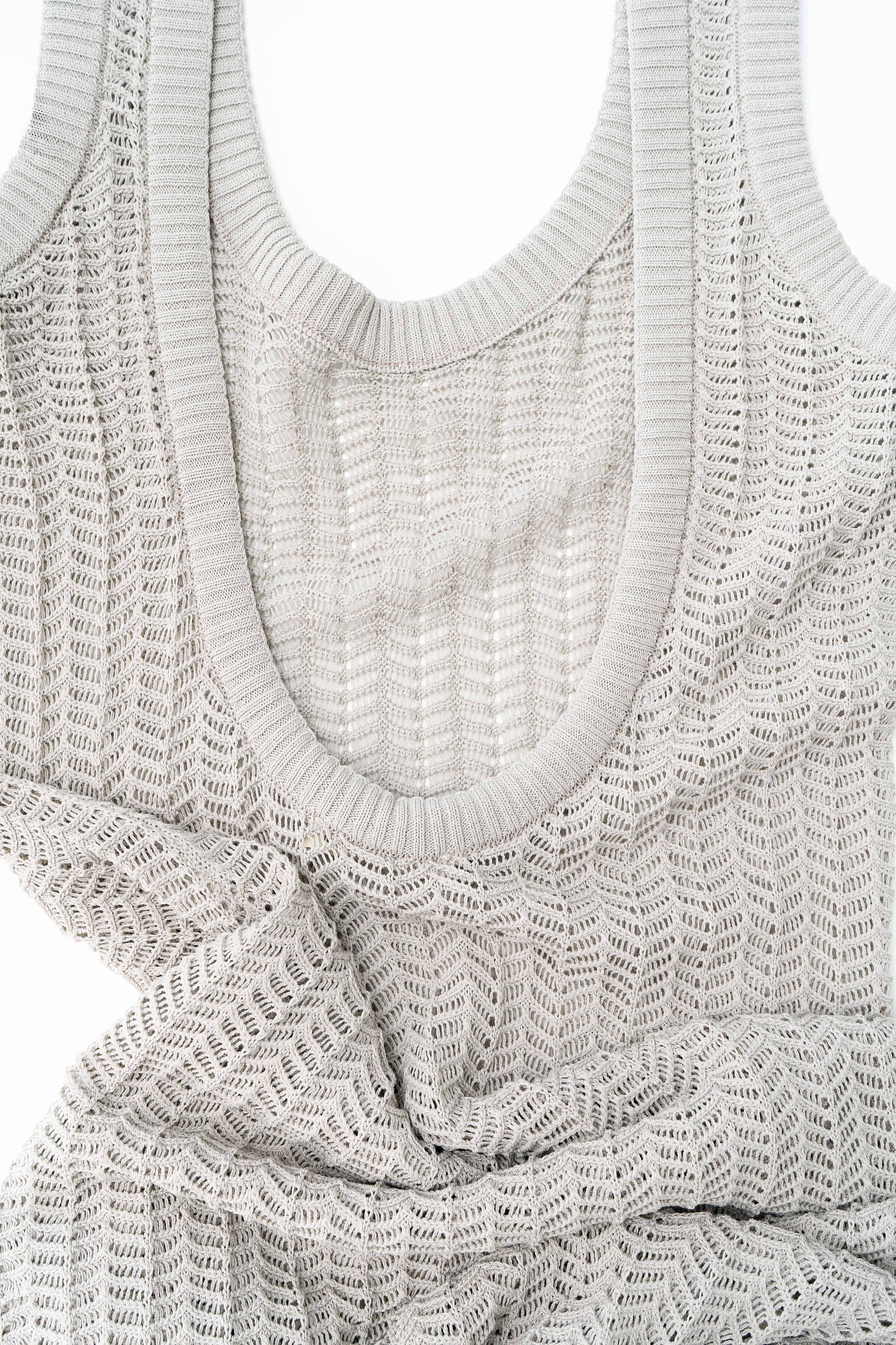 Трикотажный ажурный сарафан из вискозы. Модель свободного силуэта, без рукавов, на тонких бретельках и открытой спиной. Вязка выполнена узором "ёлочка", края изделия выполнены в рубчик.