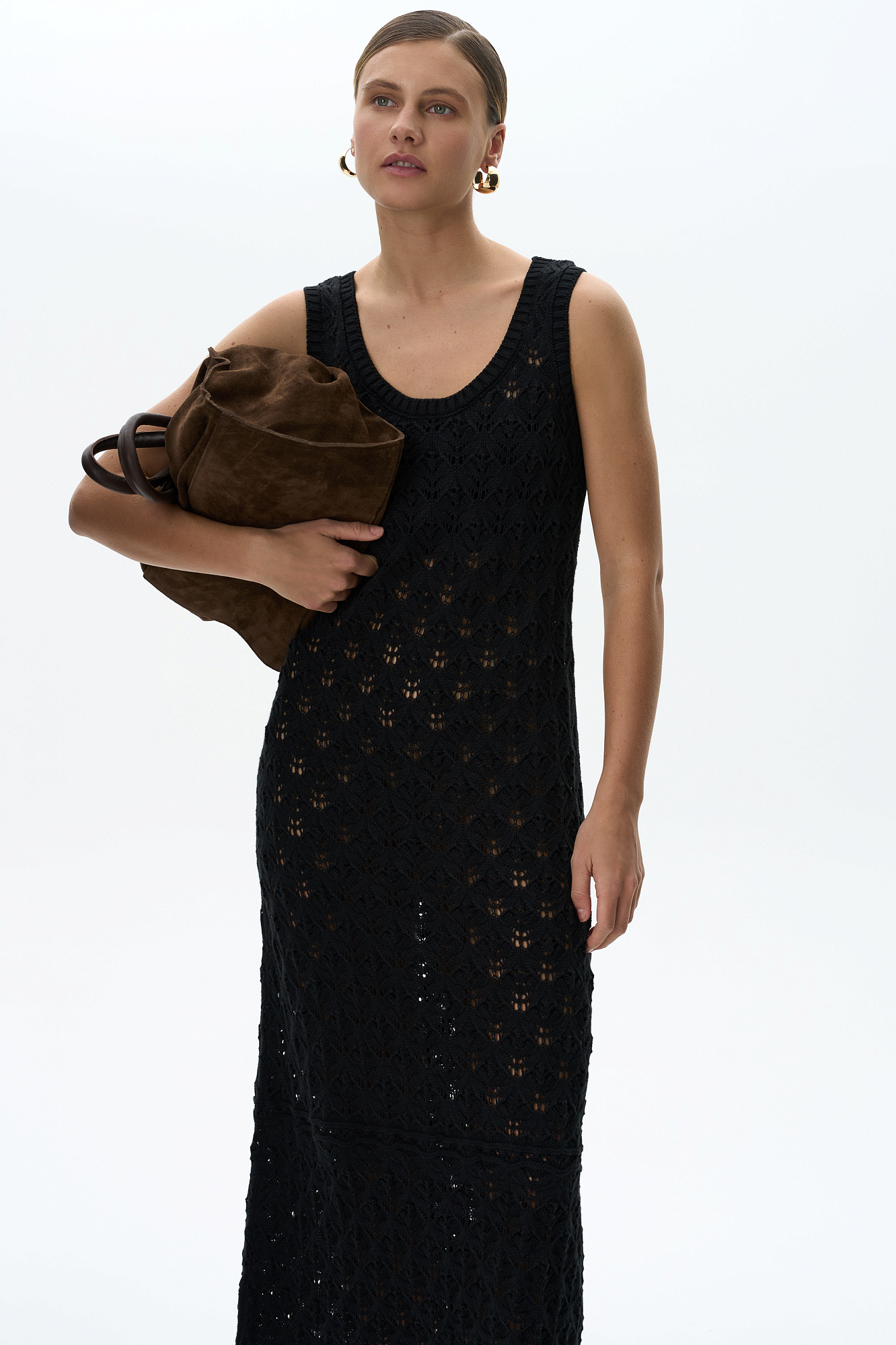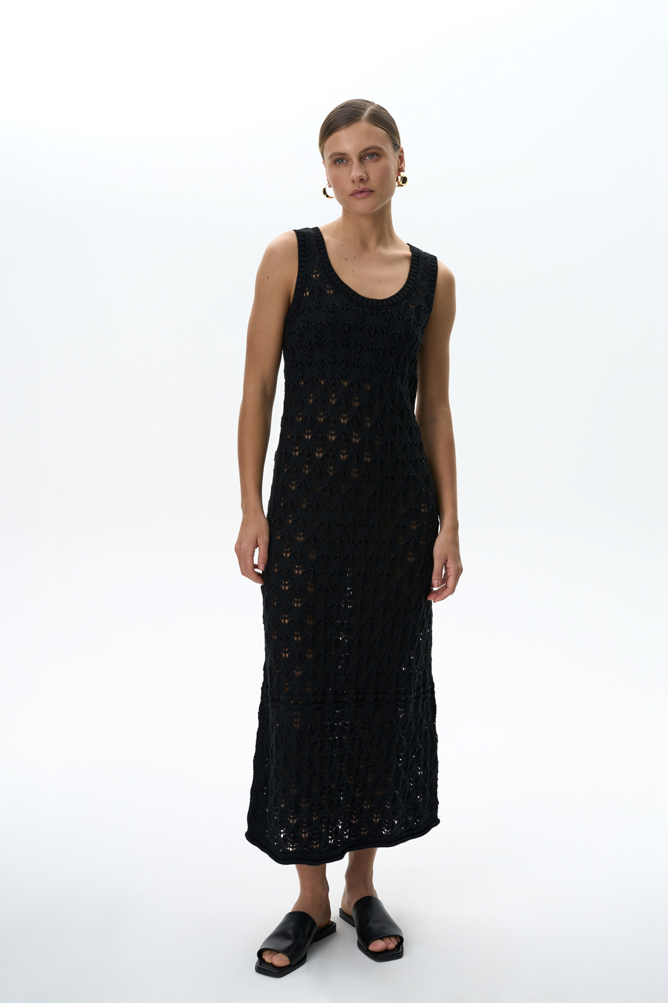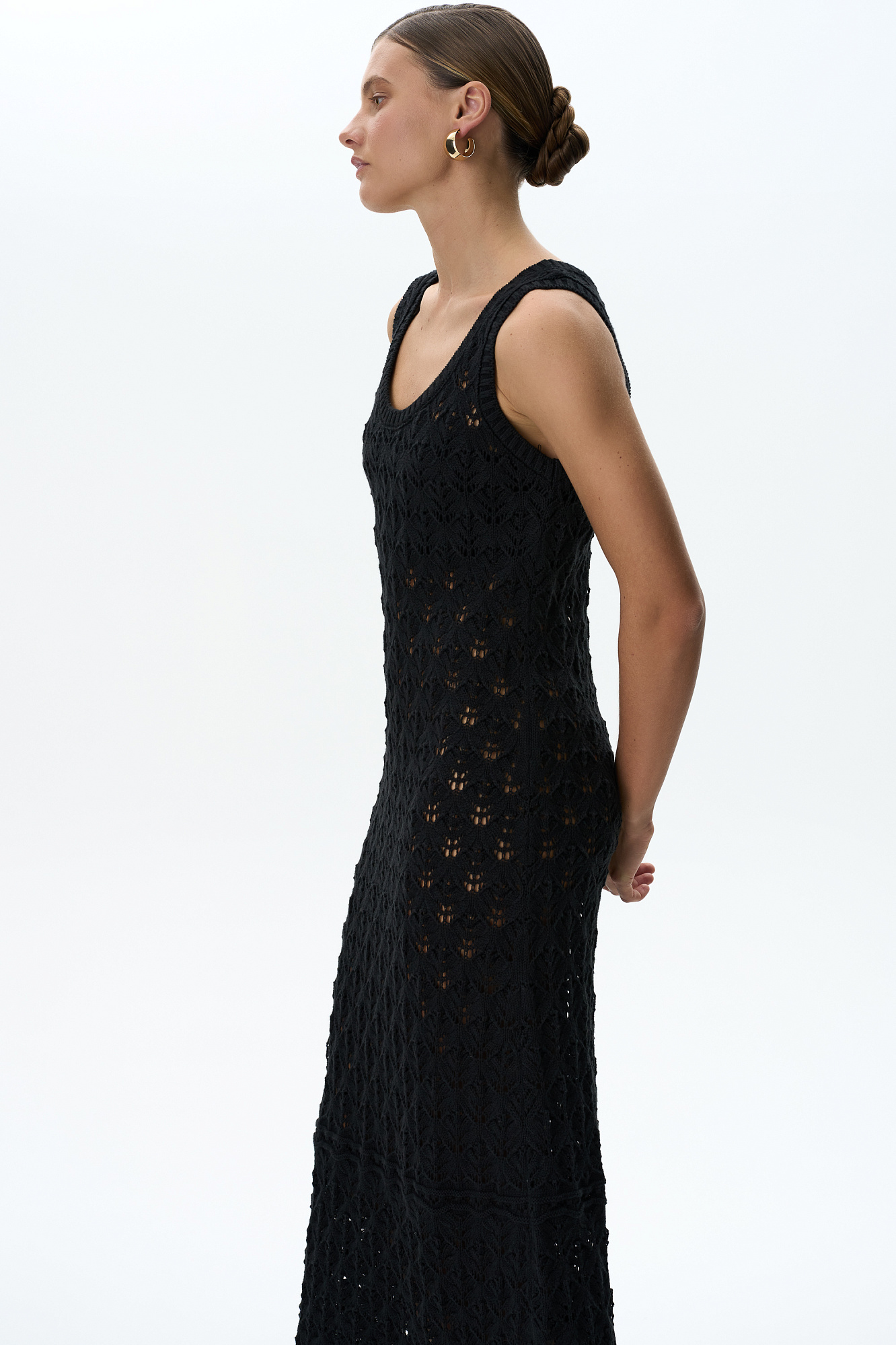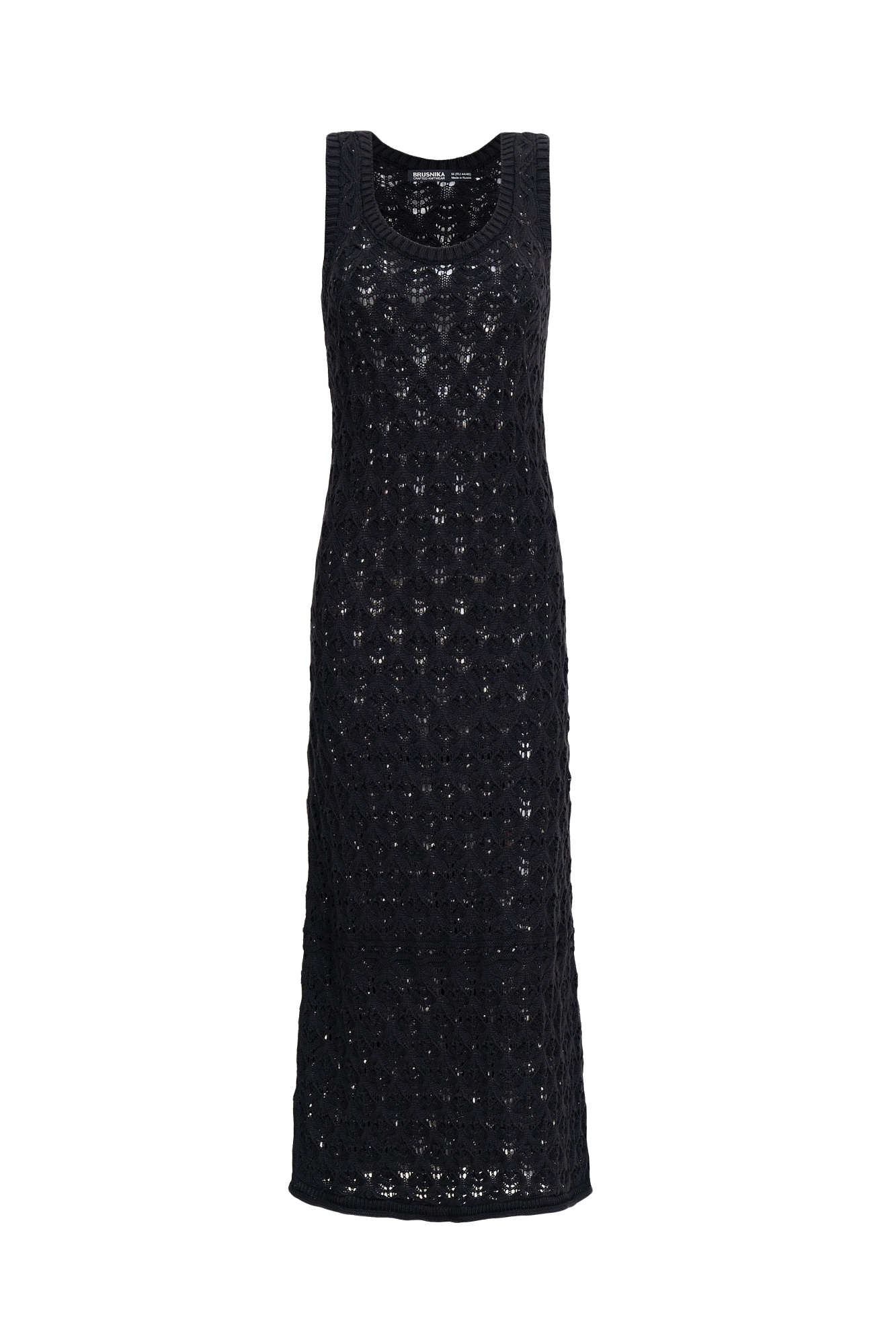 Облегающий ажурный сарафан из 100% хлопка. Модель с круглым вырезом горловины и небольшим расклешением юбки к низу. Изделие декорировано валиком с эффектом закручивания по краю подола. Края пройм и горловина выполнены в рубчик.