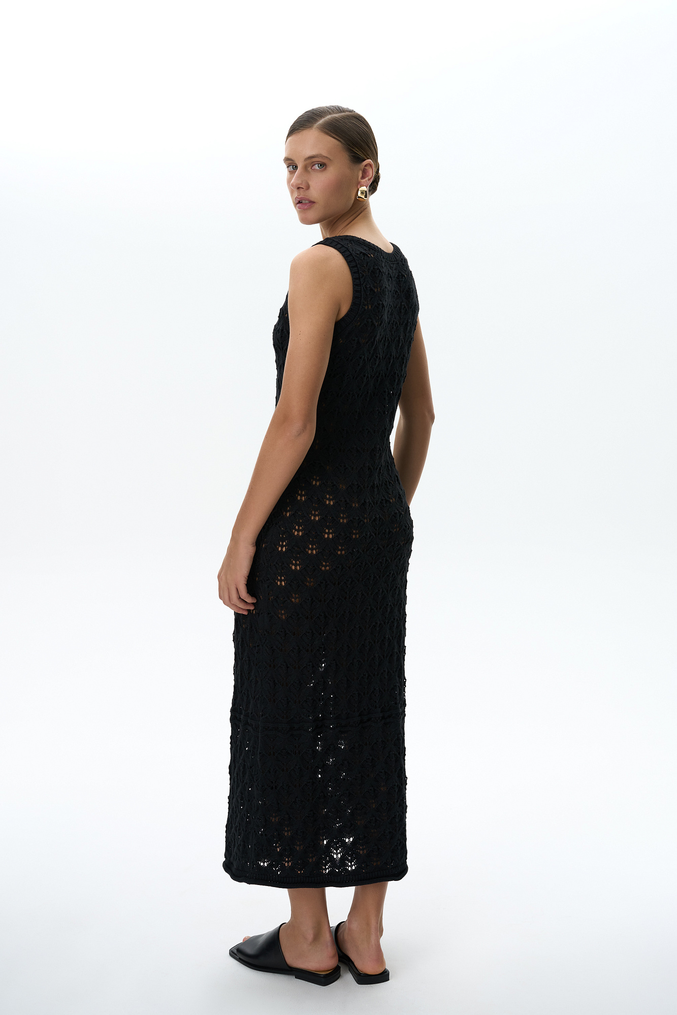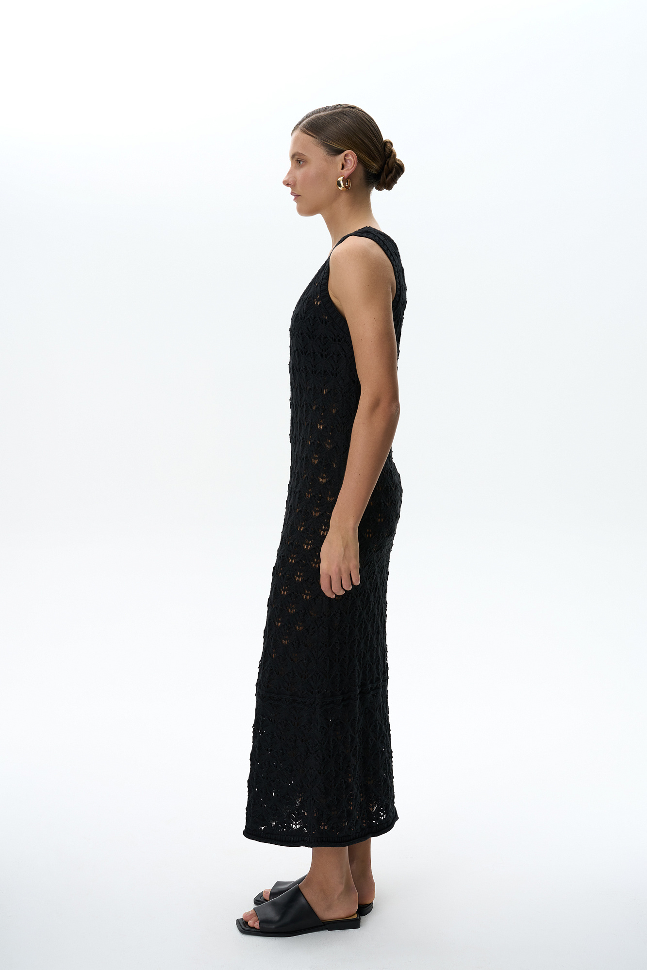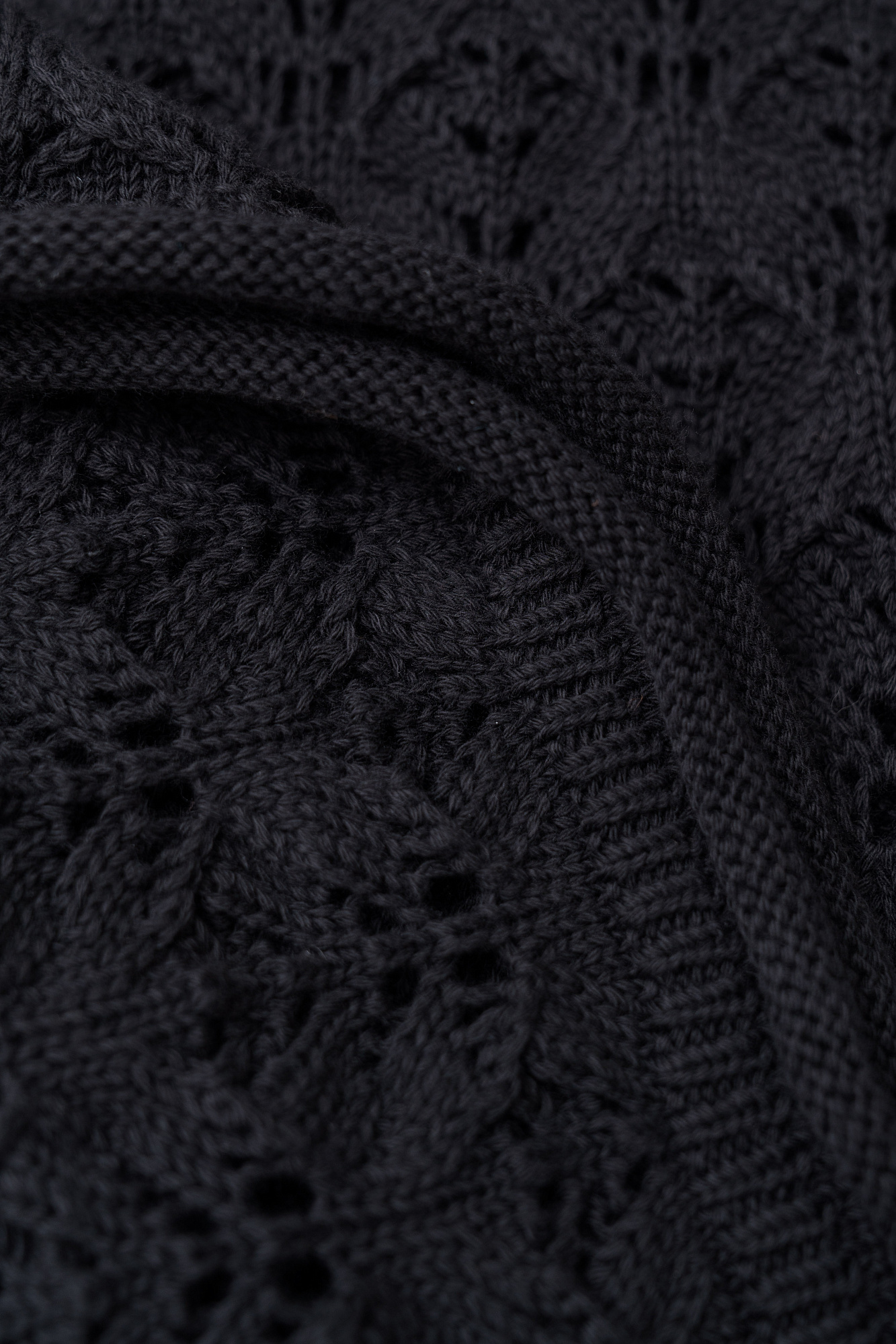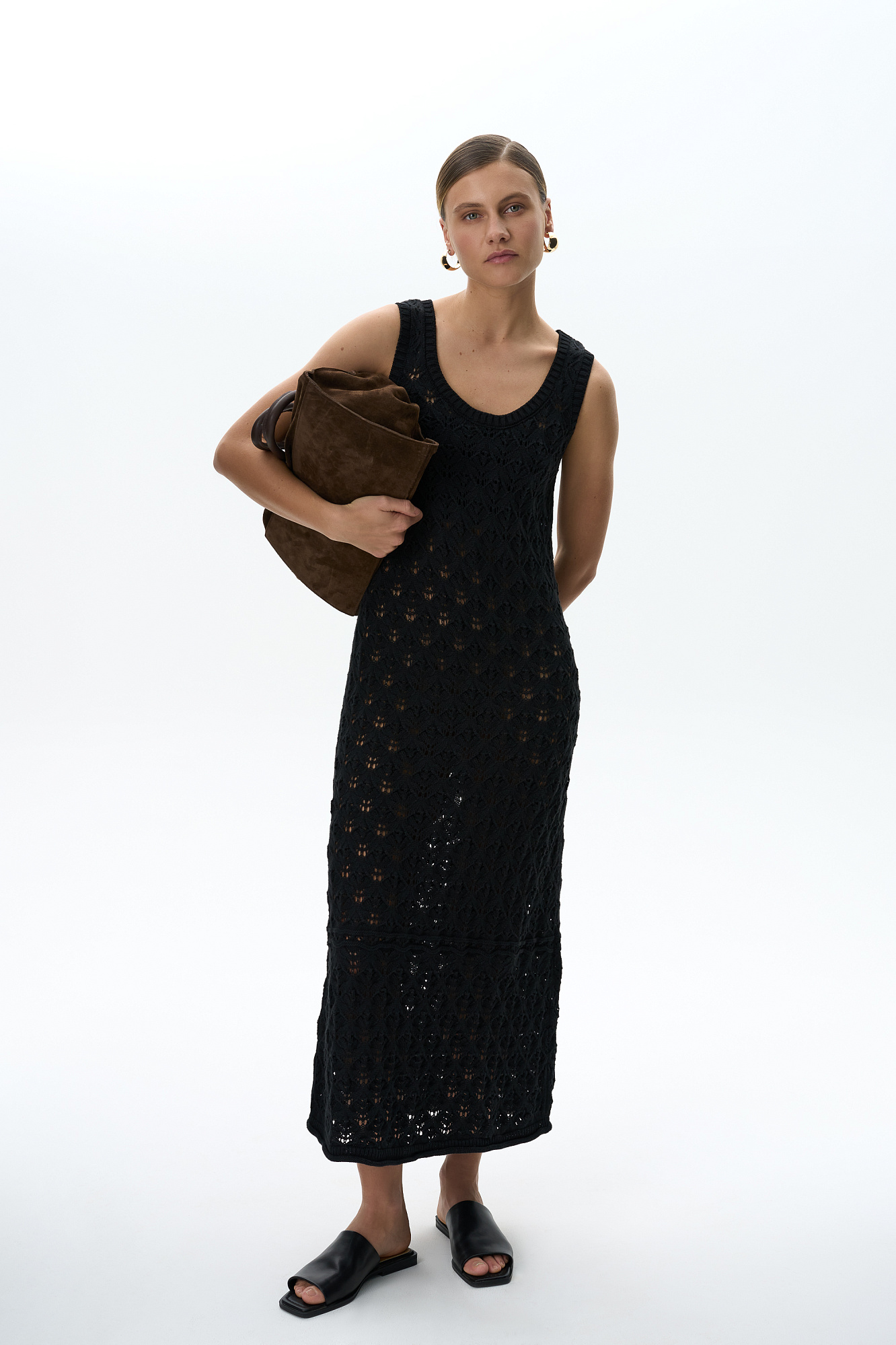 Облегающий ажурный сарафан из 100% хлопка. Модель с круглым вырезом горловины и небольшим расклешением юбки к низу. Изделие декорировано валиком с эффектом закручивания по краю подола. Края пройм и горловина выполнены в рубчик.