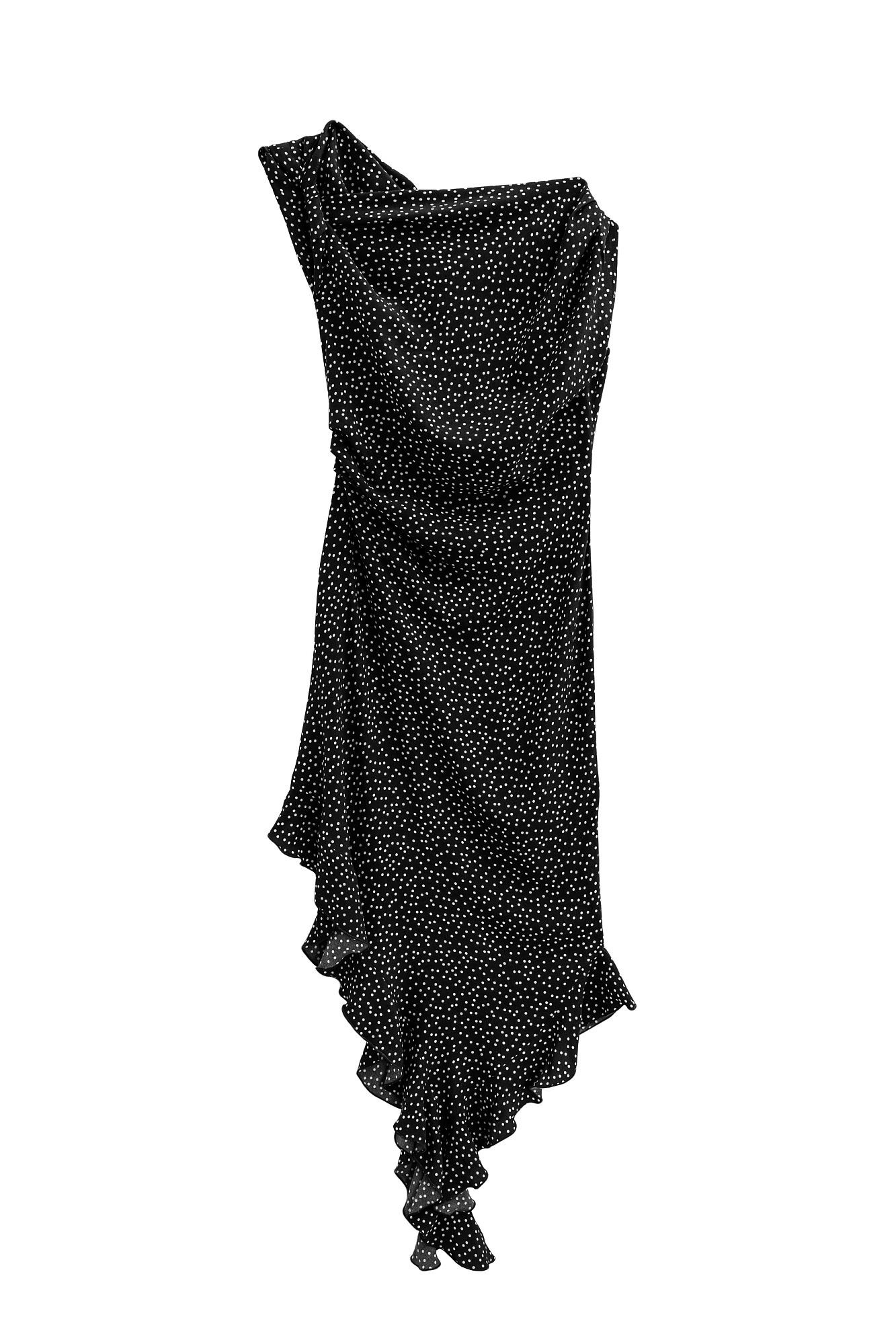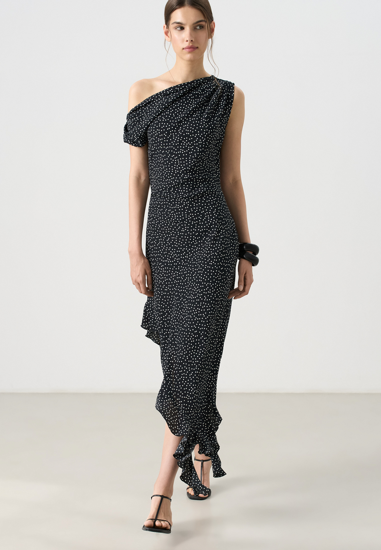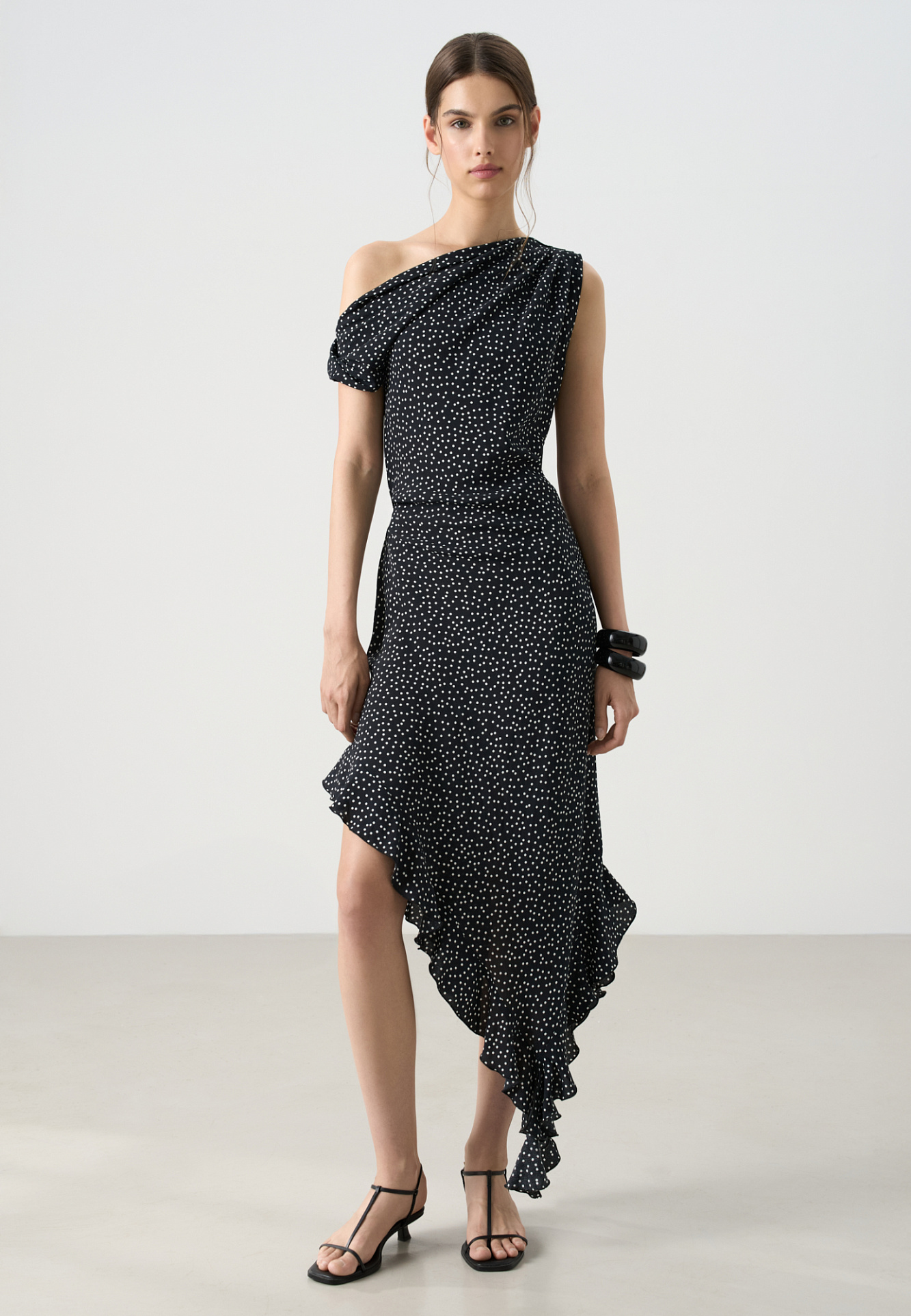 Платье с принтом из 100% креповой вискозы длины миди. Модель прямого силуэта, без рукавов, на широких бретельках с перекрутом, асимметричной юбкой, оборками и драпировкой на талии.