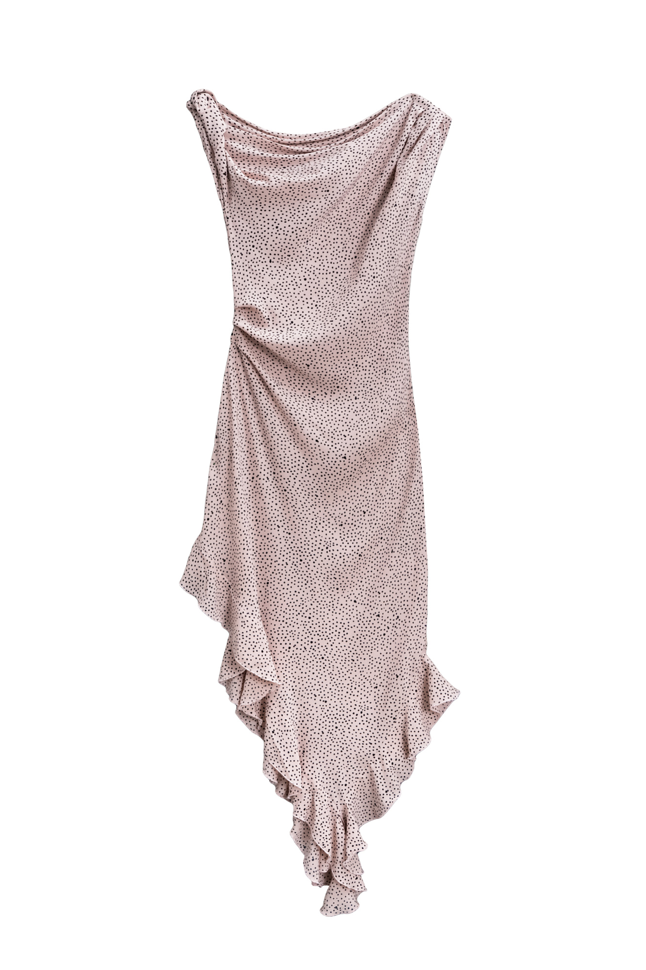 Платье с принтом из 100% креповой вискозы длины миди. Модель прямого силуэта, без рукавов, на широких бретельках с перекрутом, асимметричной юбкой, оборками и драпировкой на талии.