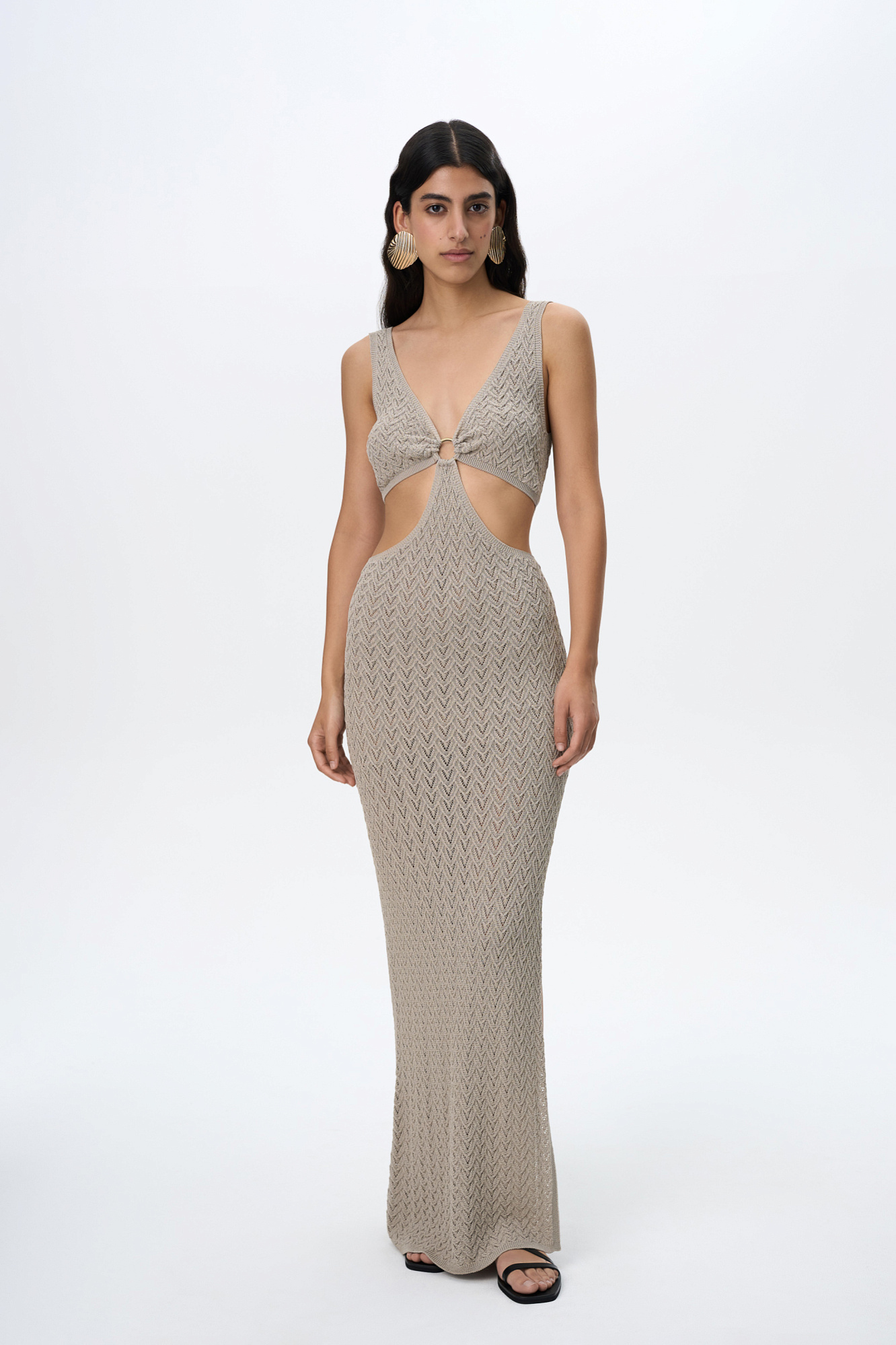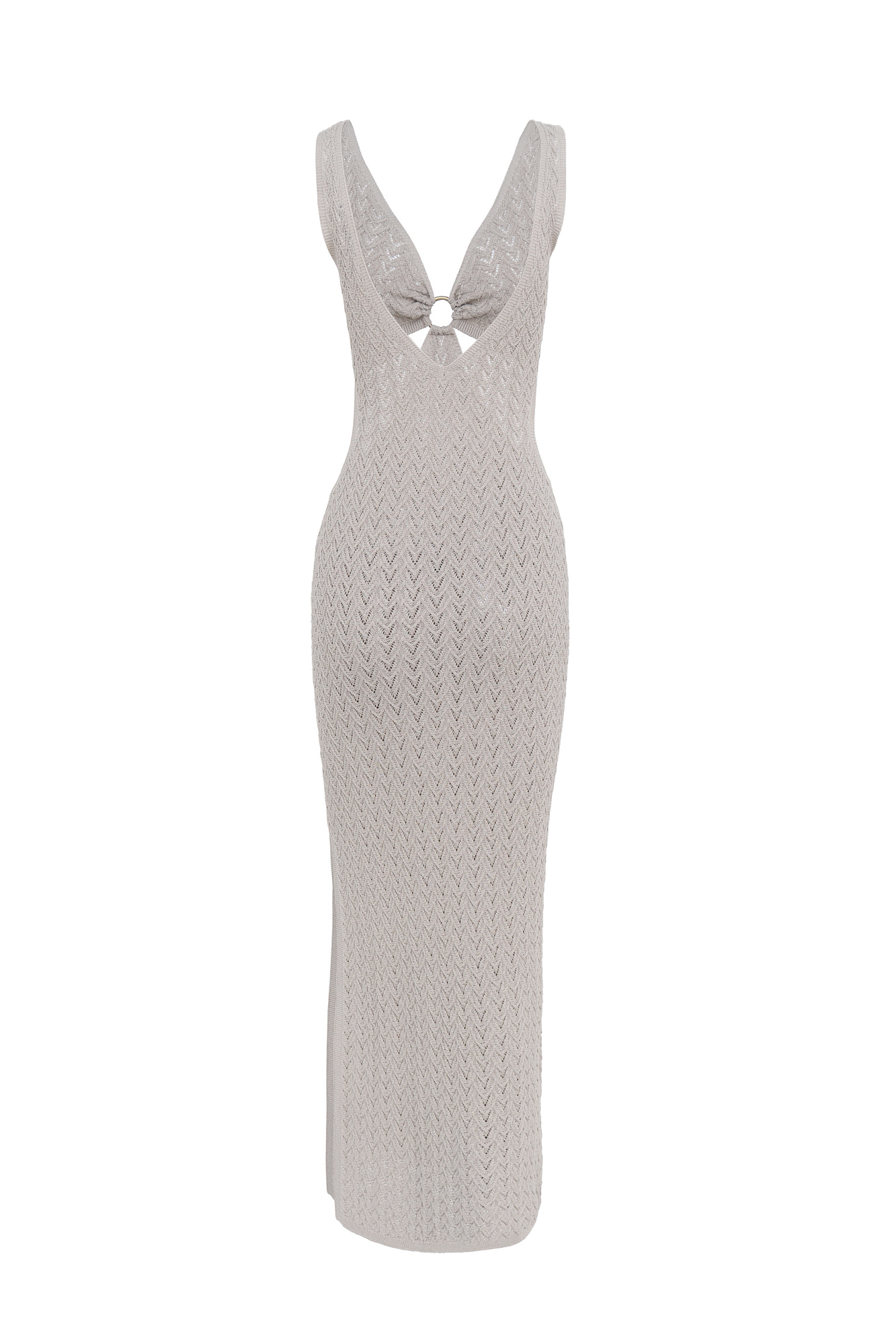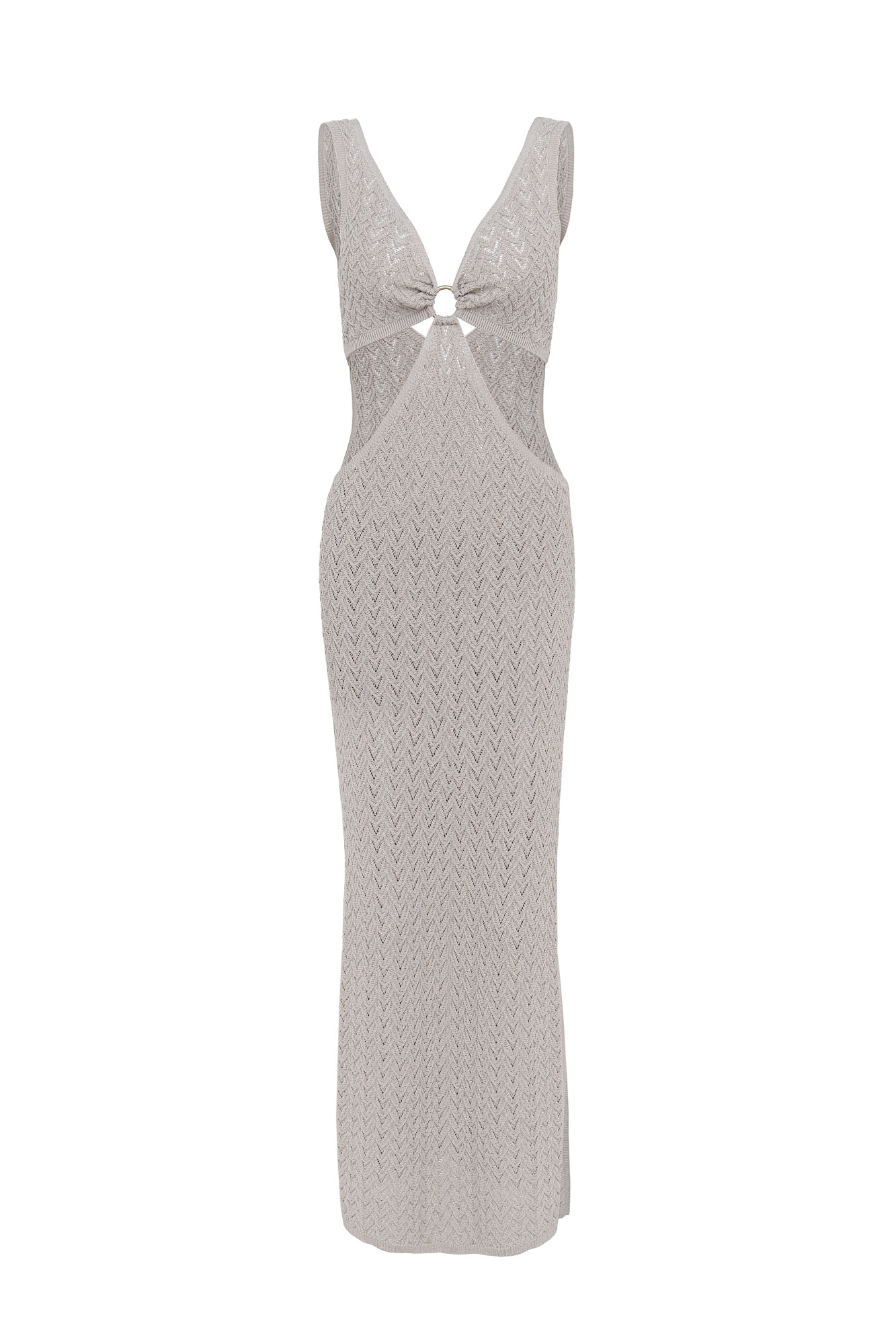 Трикотажный ажурный сарафан из вискозы длины макси. Модель декорирована кольцом, которое соединяет декольте с V-образным вырезом и юбку изделия. Без подкладки.