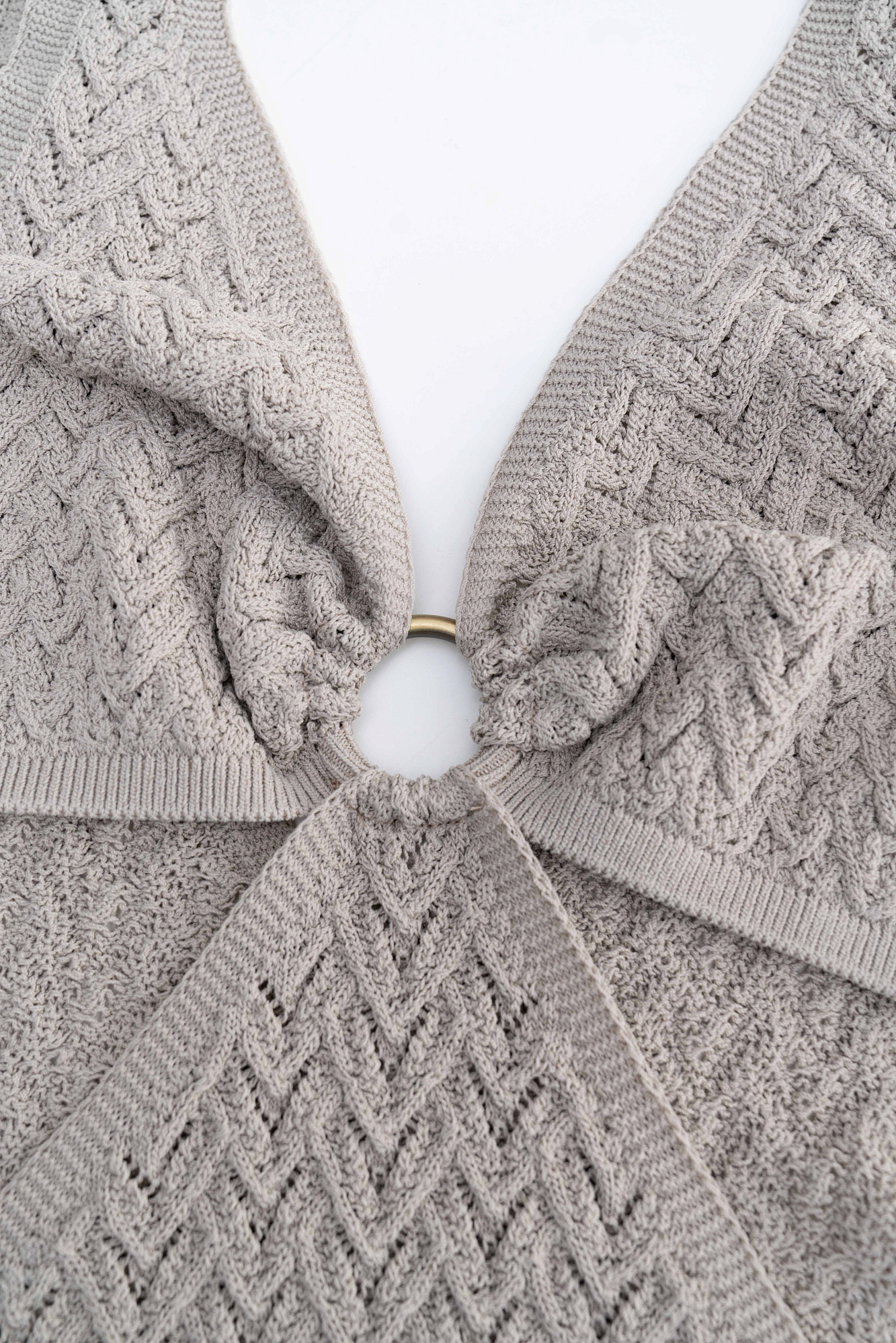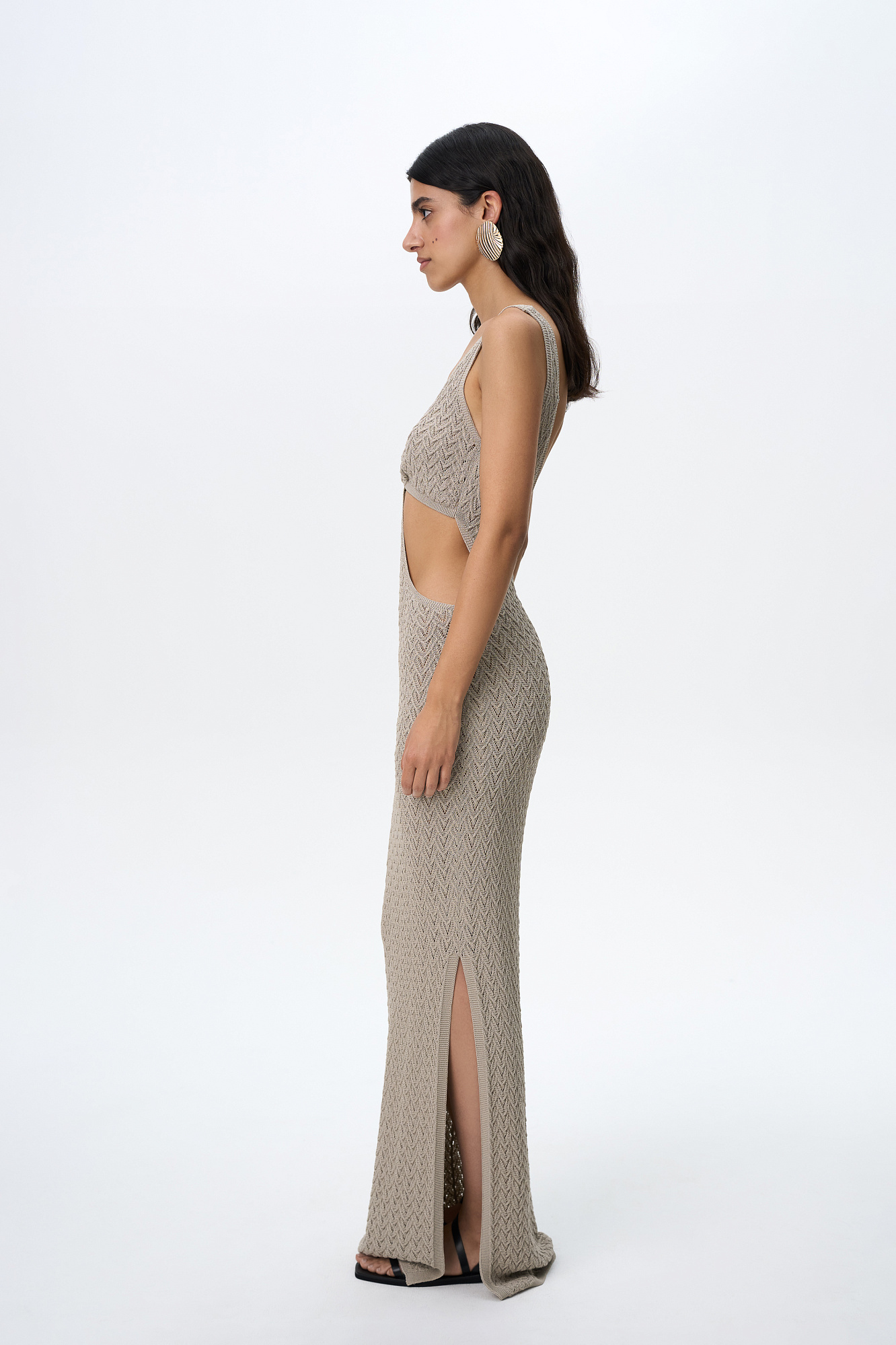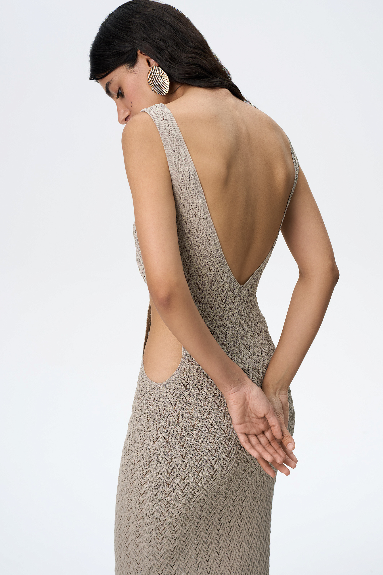 Трикотажный ажурный сарафан из вискозы длины макси. Модель декорирована кольцом, которое соединяет декольте с V-образным вырезом и юбку изделия. Без подкладки.