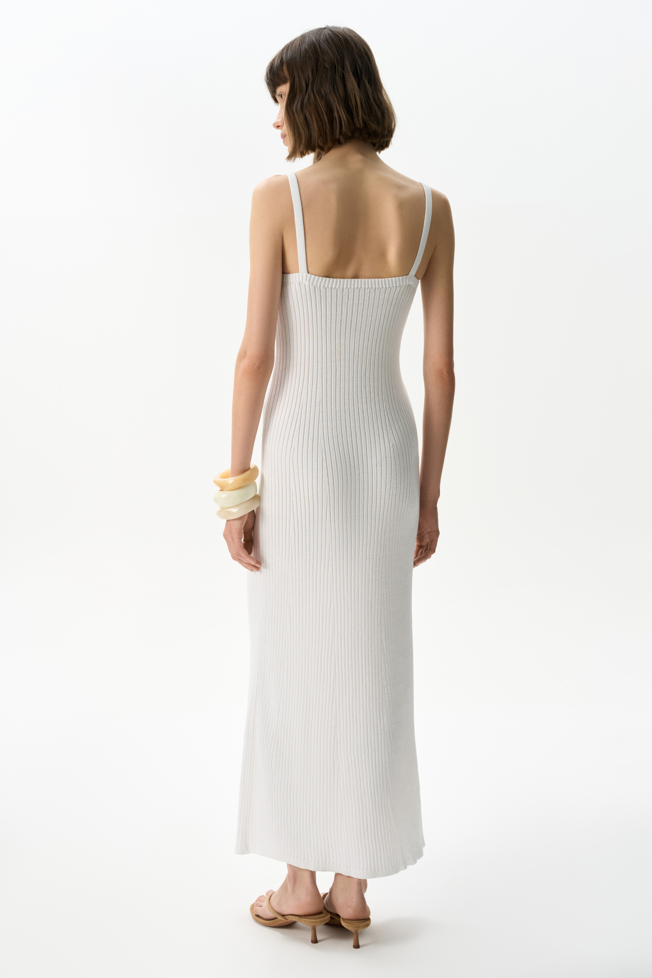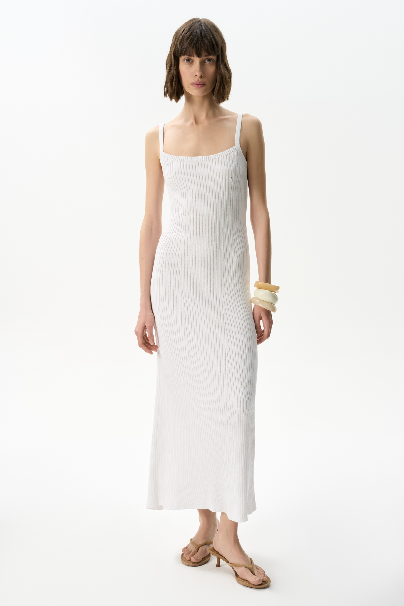 Трикотажный сарафан из хлопка с добавлением вискозы. Модель приталенного силуэта, без рукавов, на бретелях. Изделие выполнено в широкий рубчик.