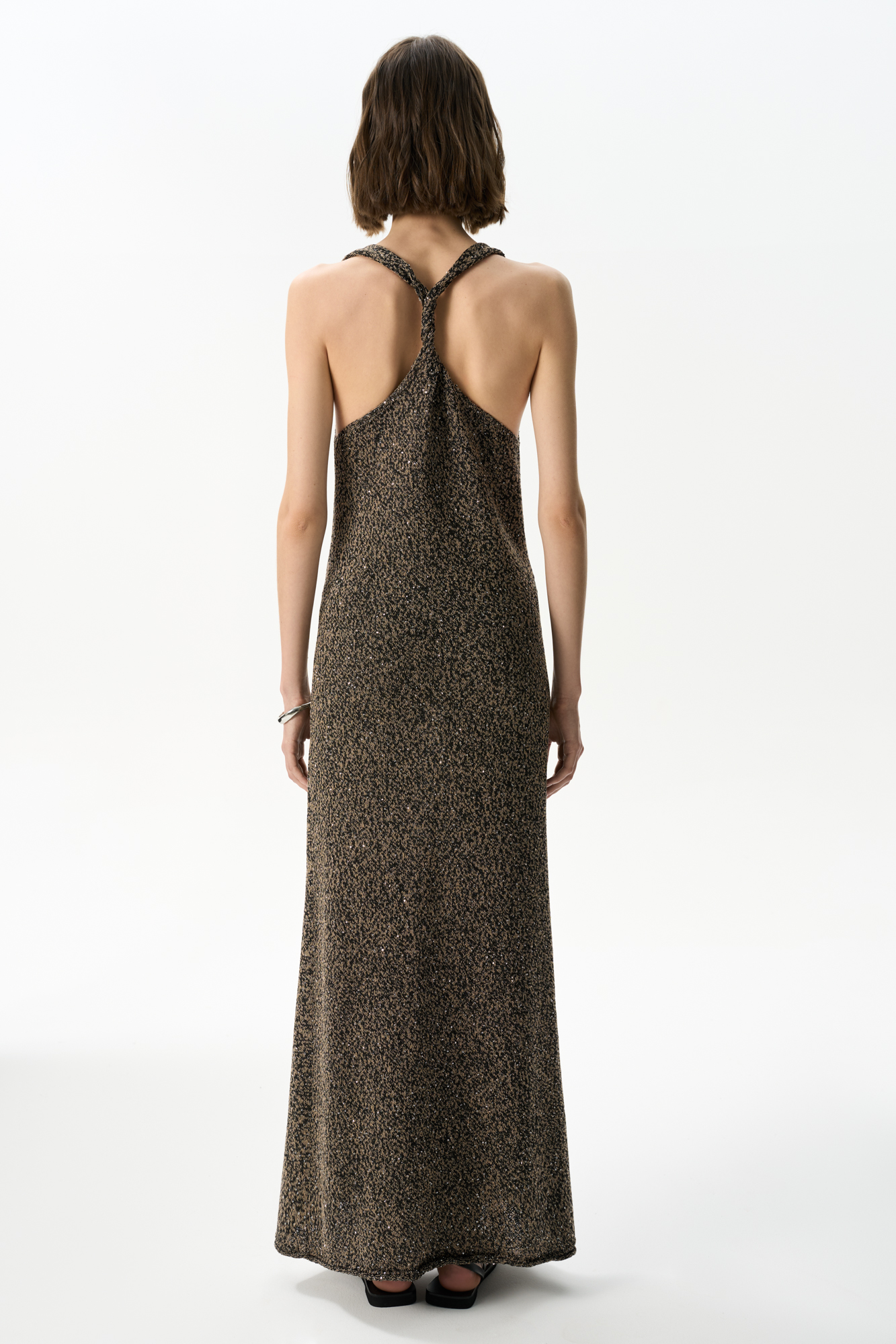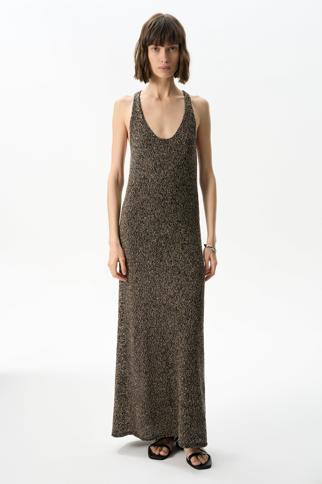 Трикотажный сарафан длины макси из хлопка с пайетками. Модель свободного кроя, на широких бретелях с перекрутом на спине и глубоким U-образным вырезом.