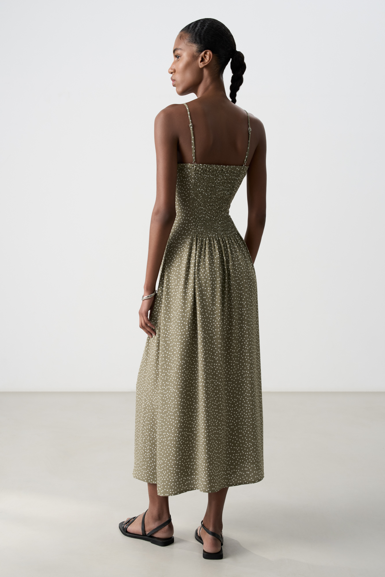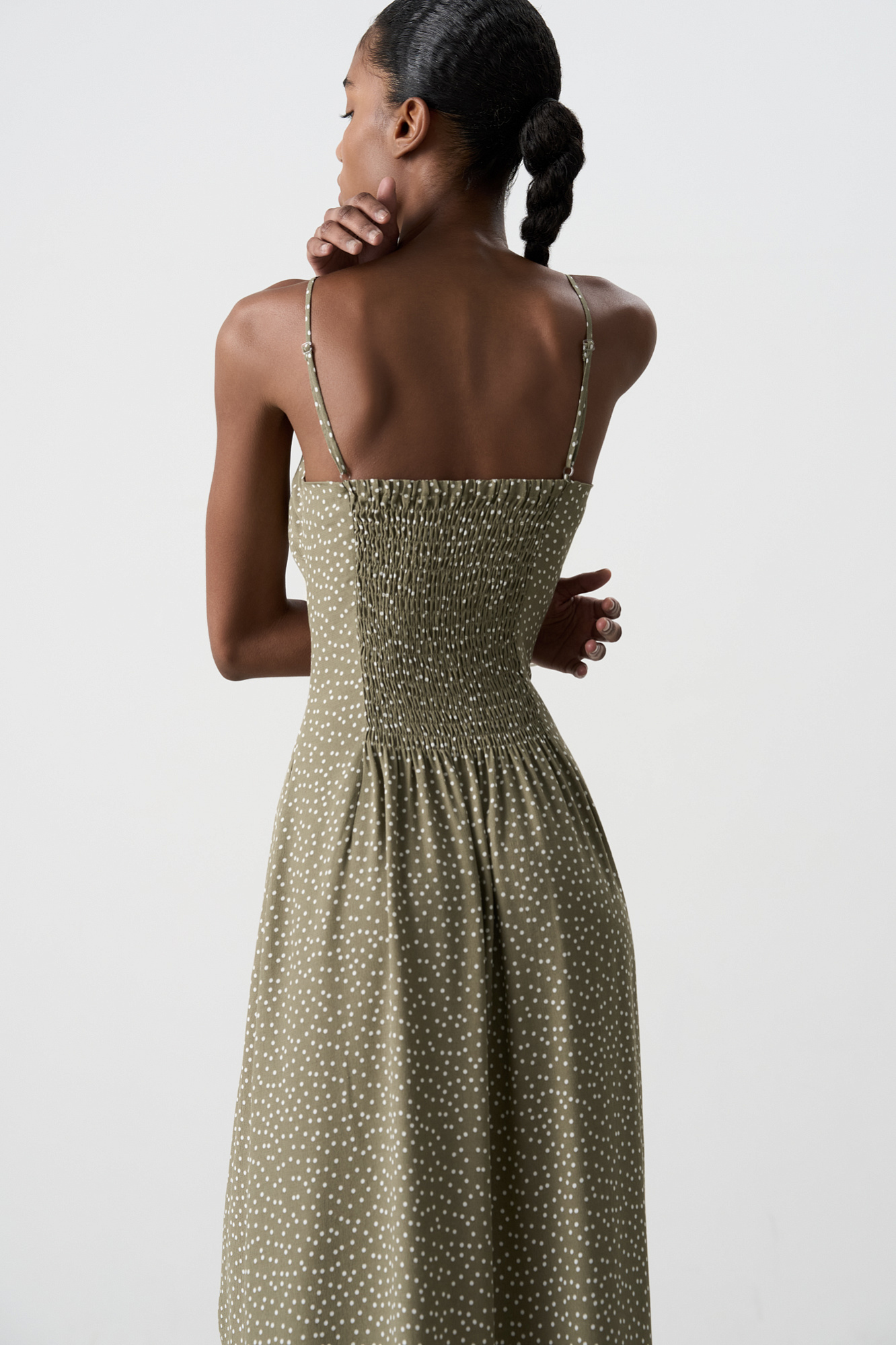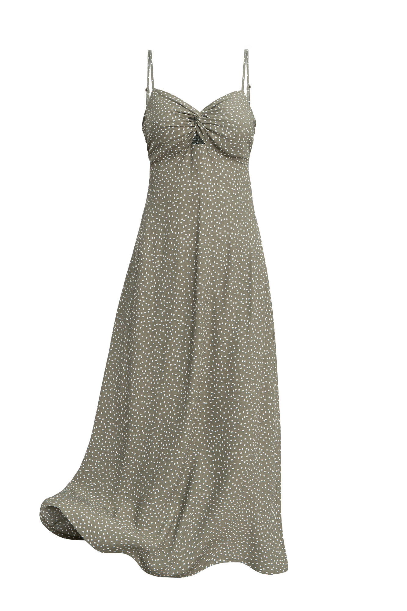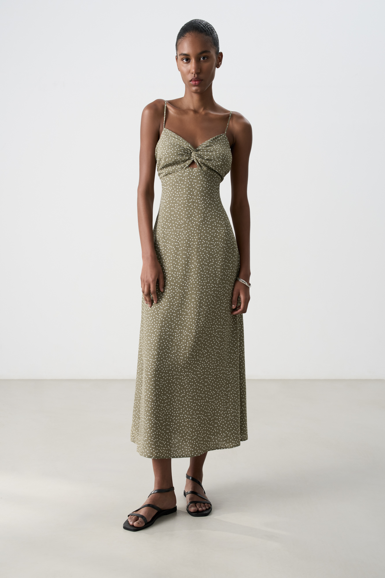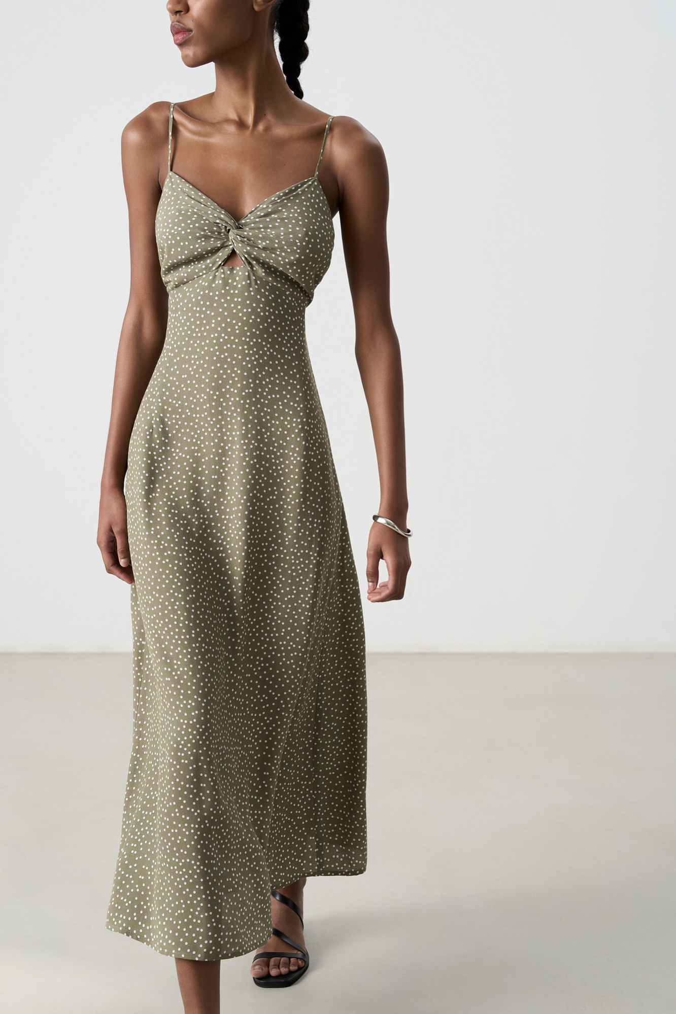 Сарафан из 100% вискозы длины миди, с принтом. Модель приталенного силуэта, на тонких бретельках, с глубоким вырезом декольте, карманами, драпировкой и перекрутом на лифе. Спинка изделия выполнена на эластичной резинке.