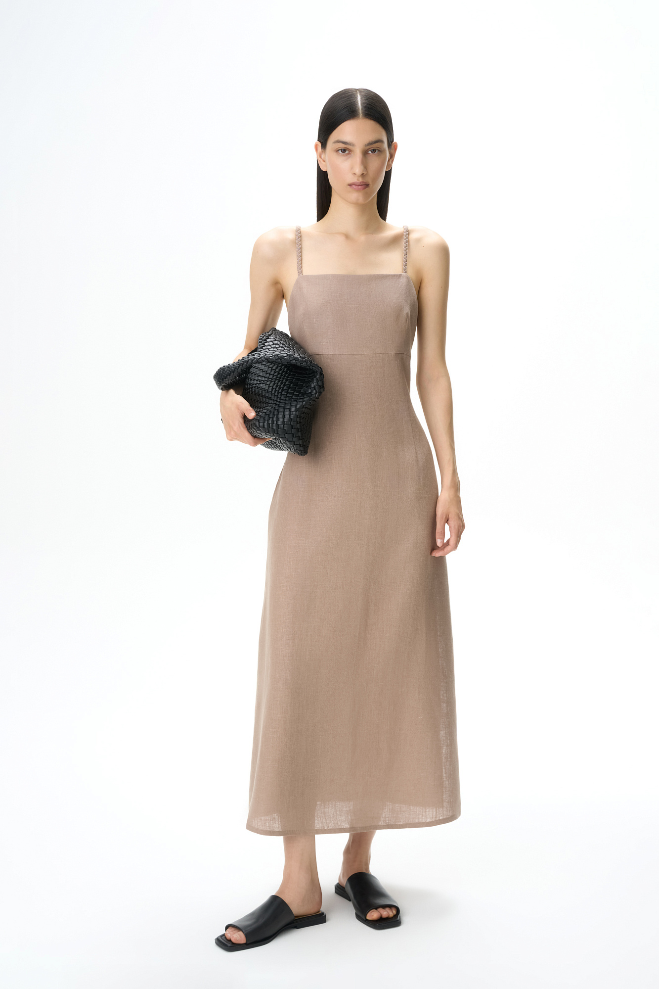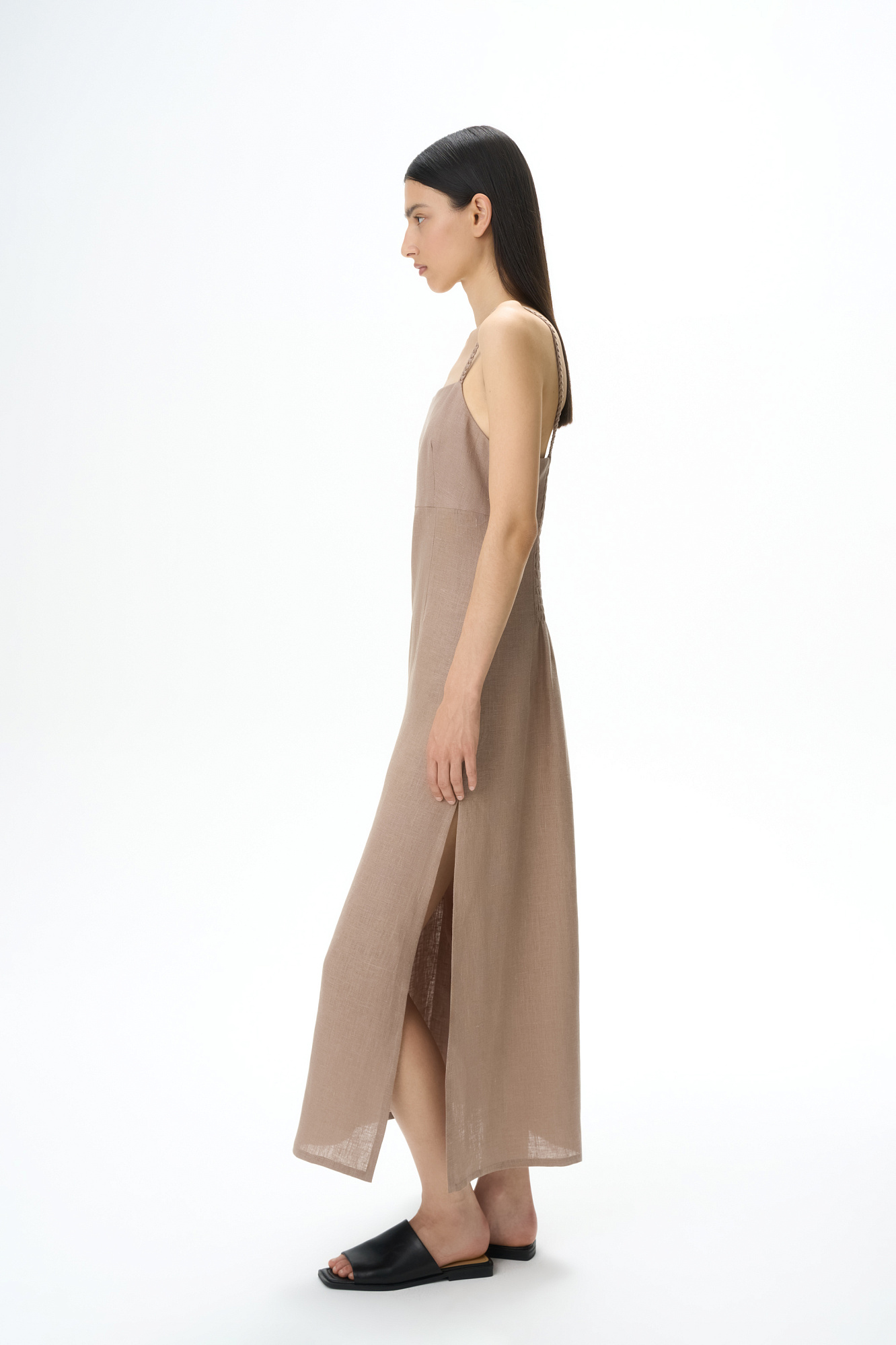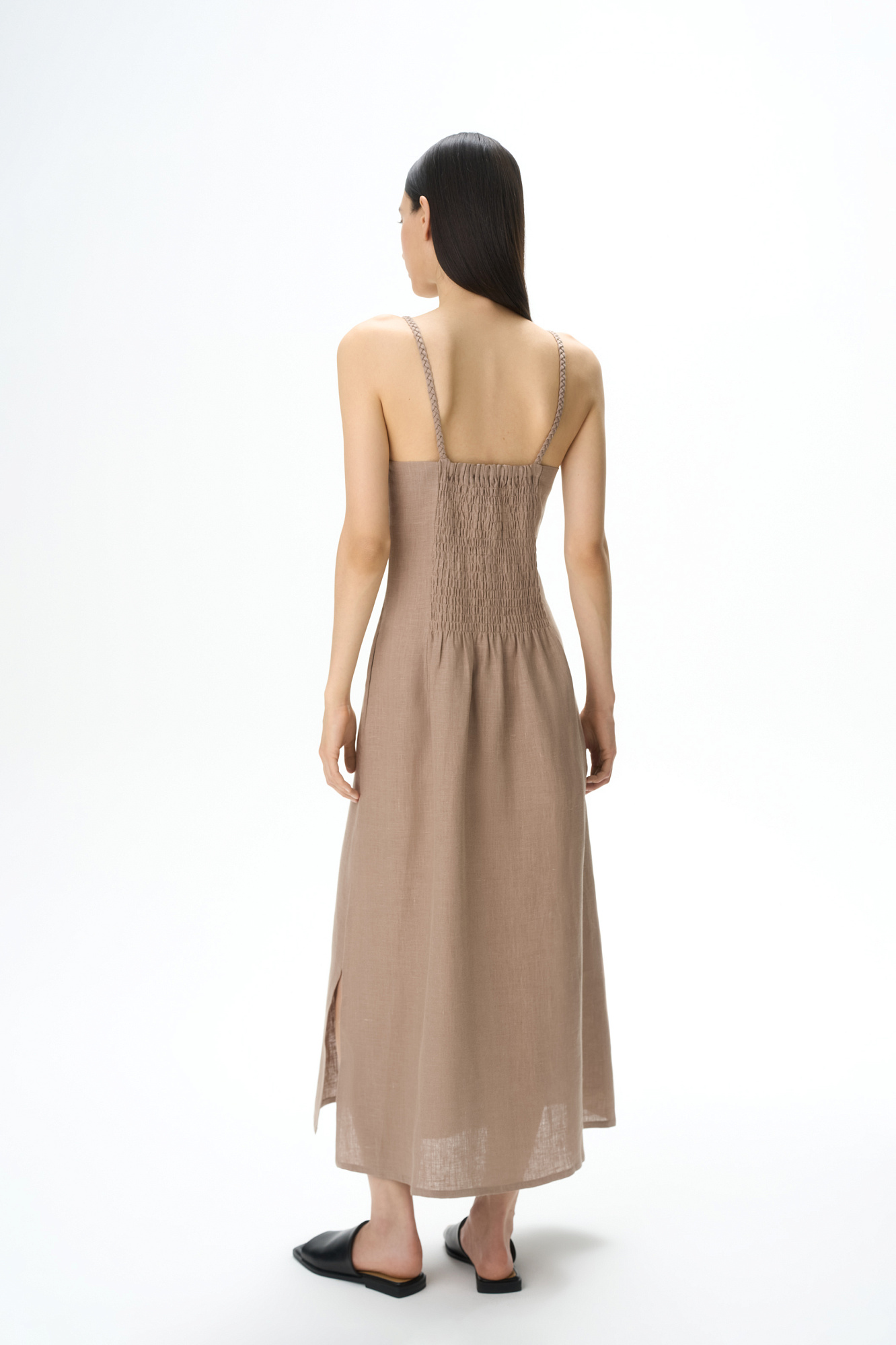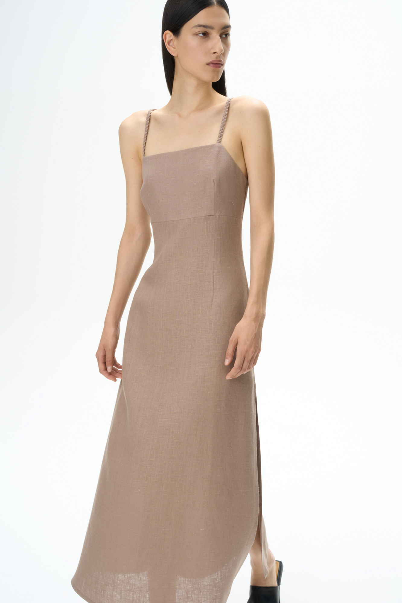 Сарафан длины миди из 100% льна. Модель приталенного силуэта, на тонких бретельках в виде косичек и высоким разрезом сбоку. Спинка изделия выполнена на резинке.
