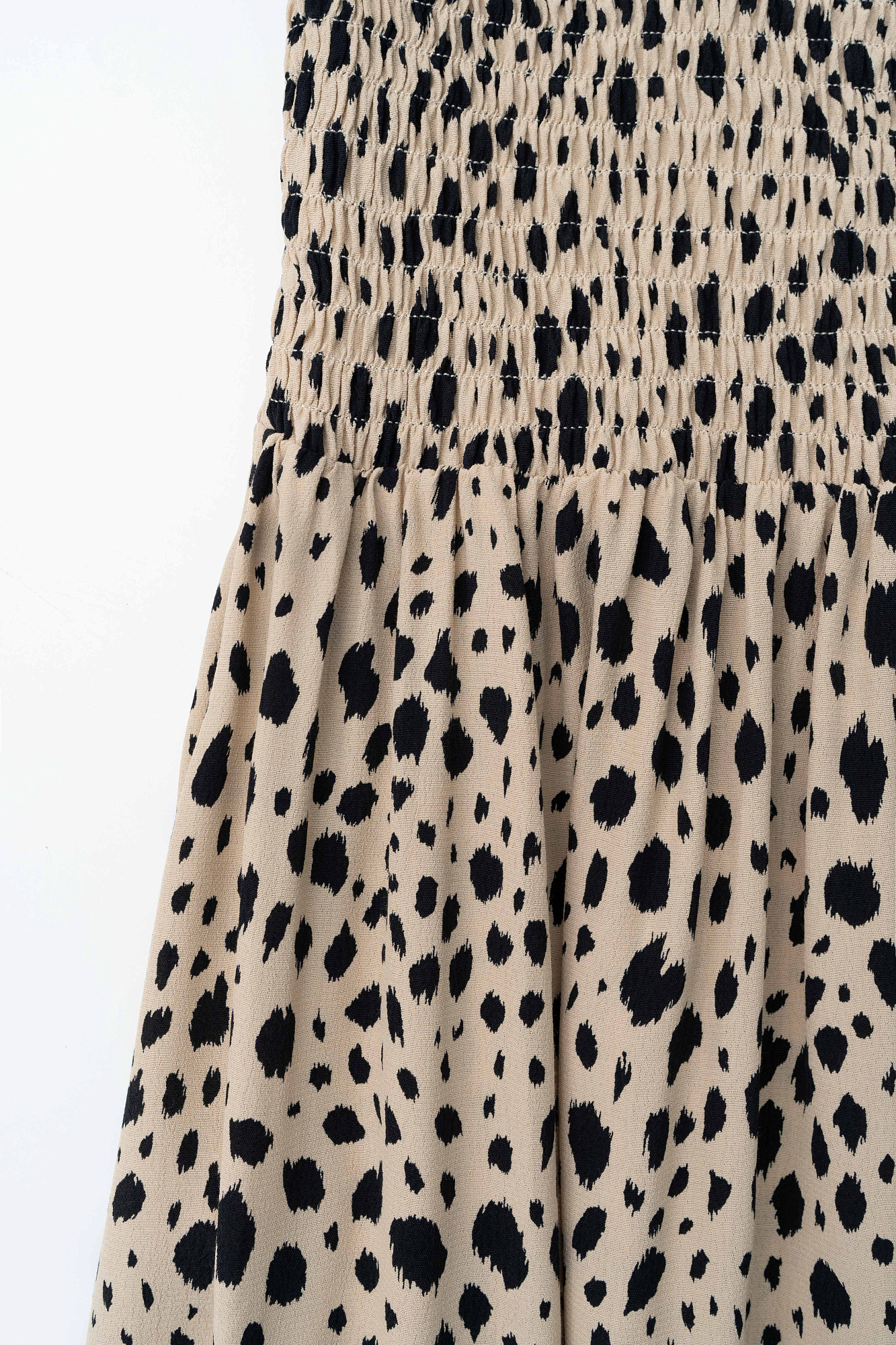 Принтованный сарафан из 100% вискозы на тонких бретелях. Верхняя часть платья выполнена на эластичной резинке. Модель с боковыми карманами.