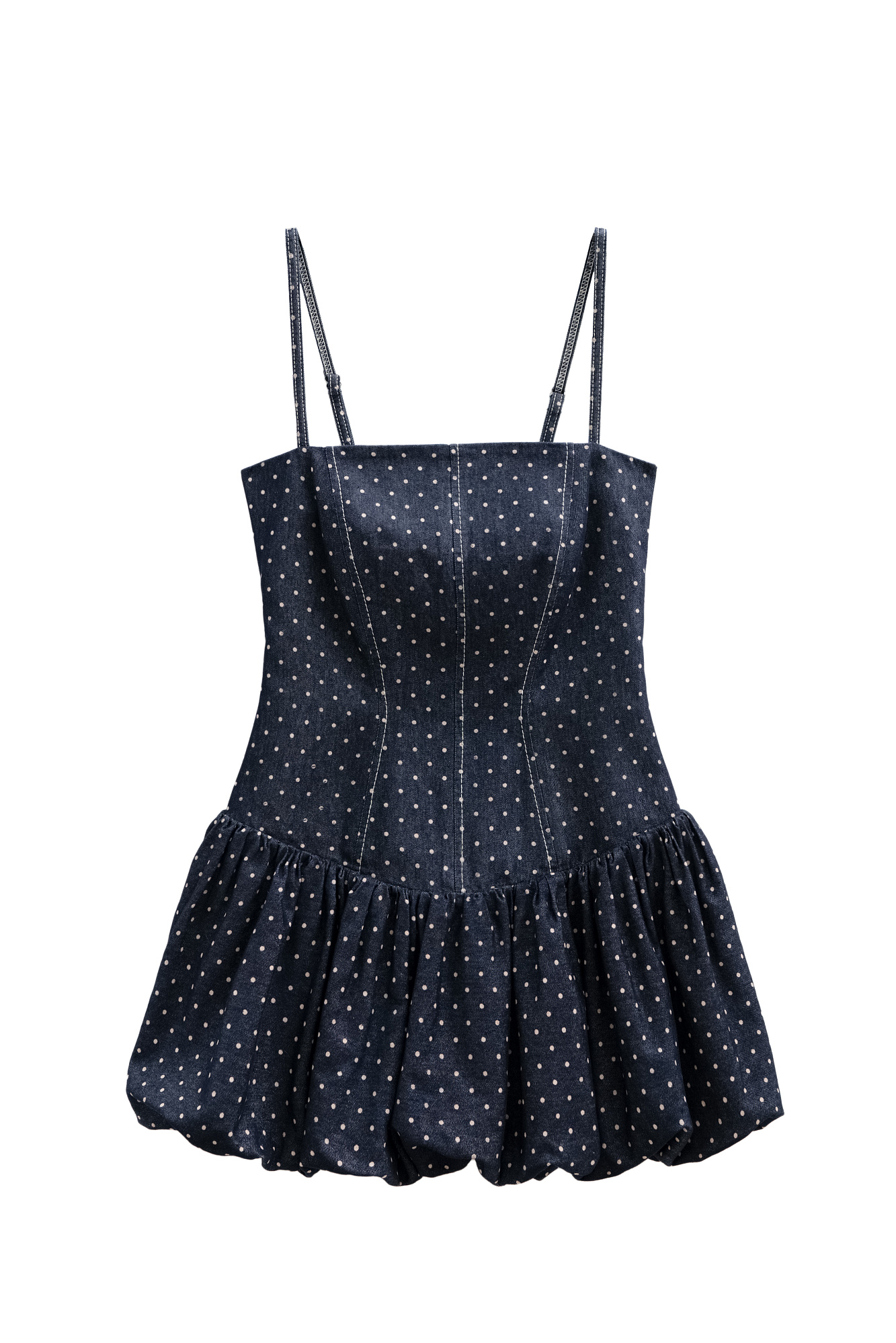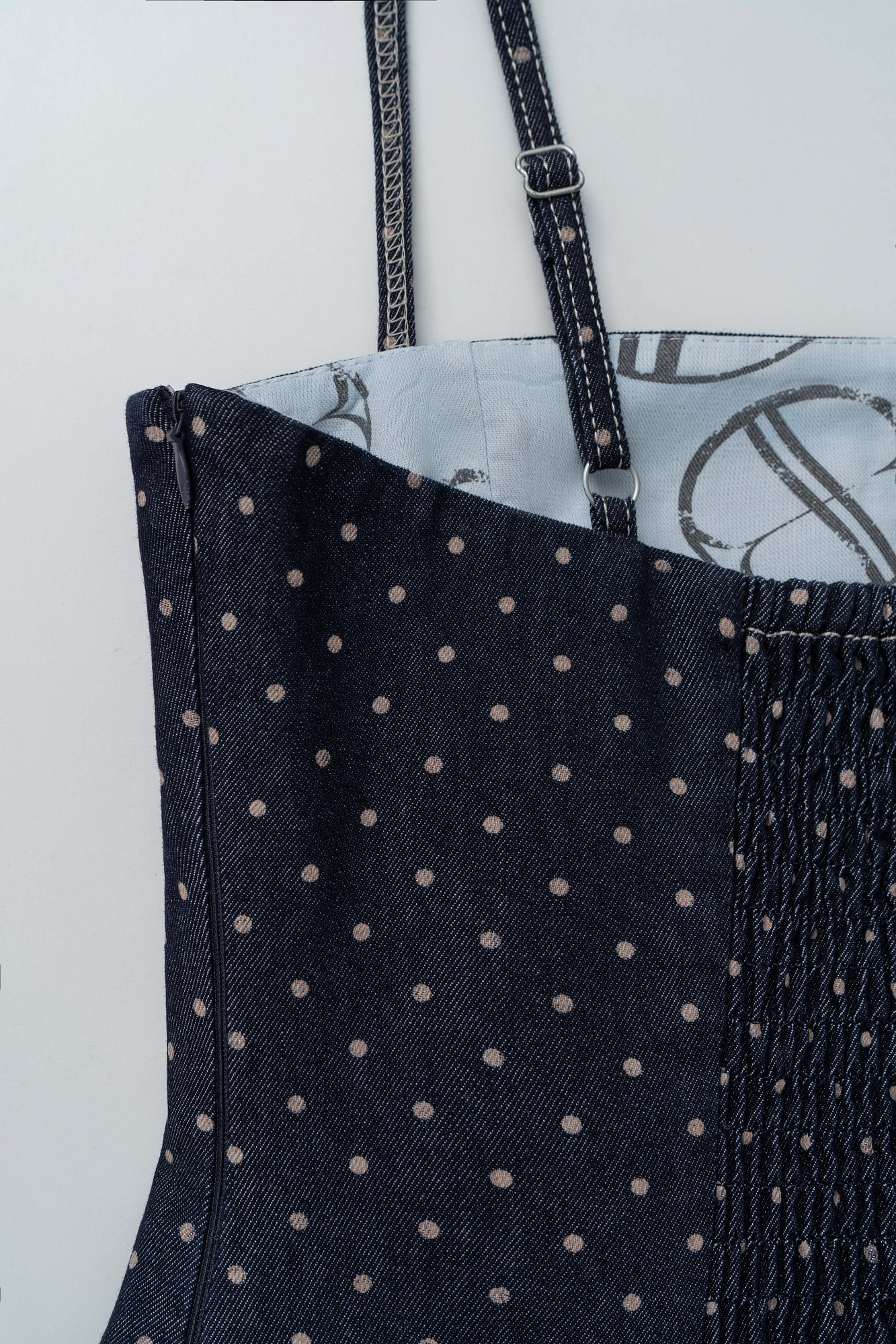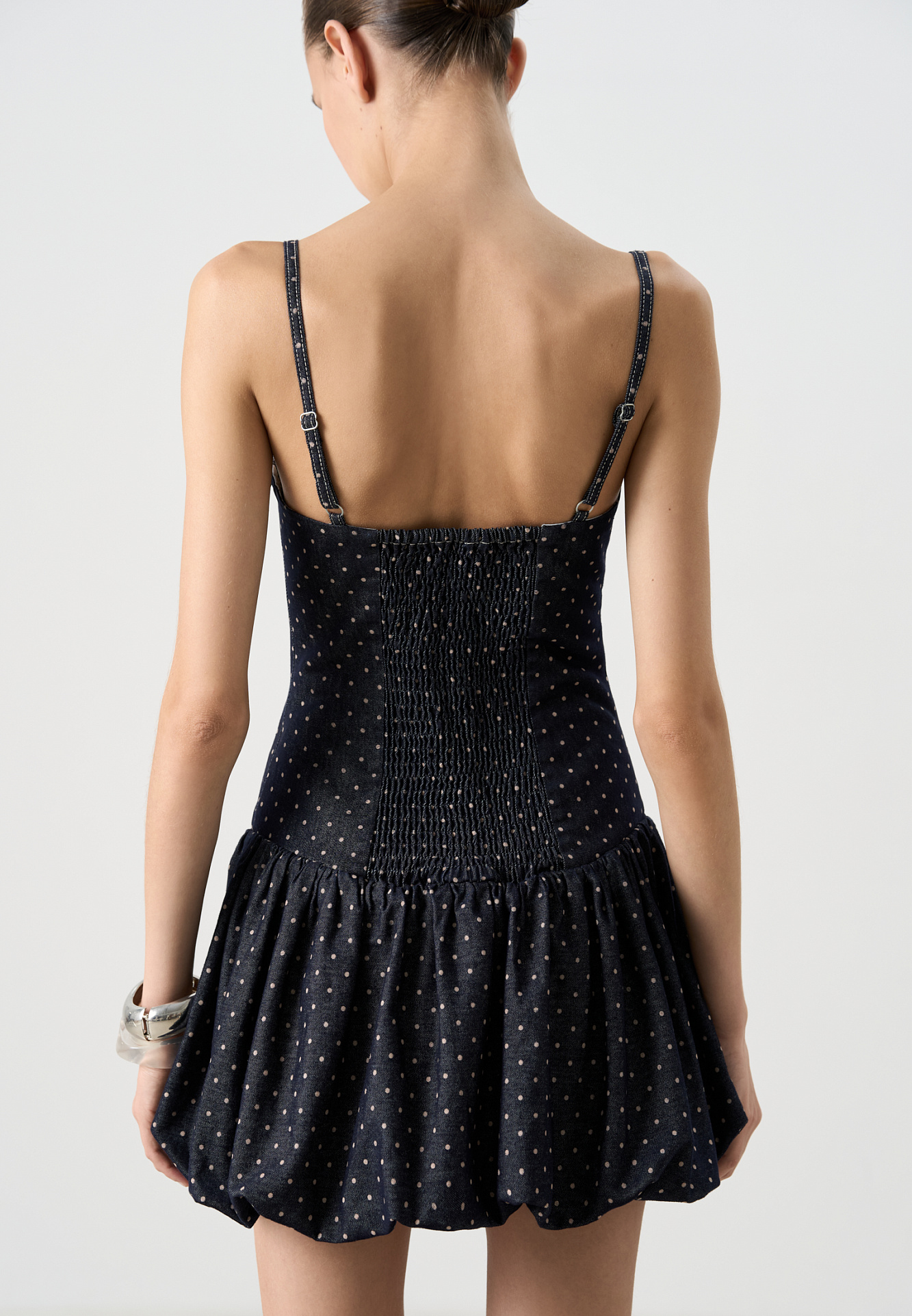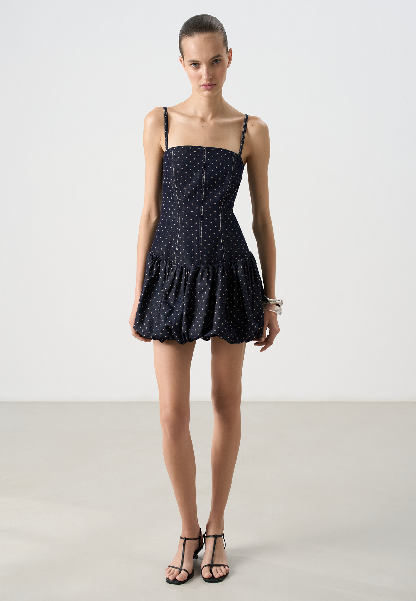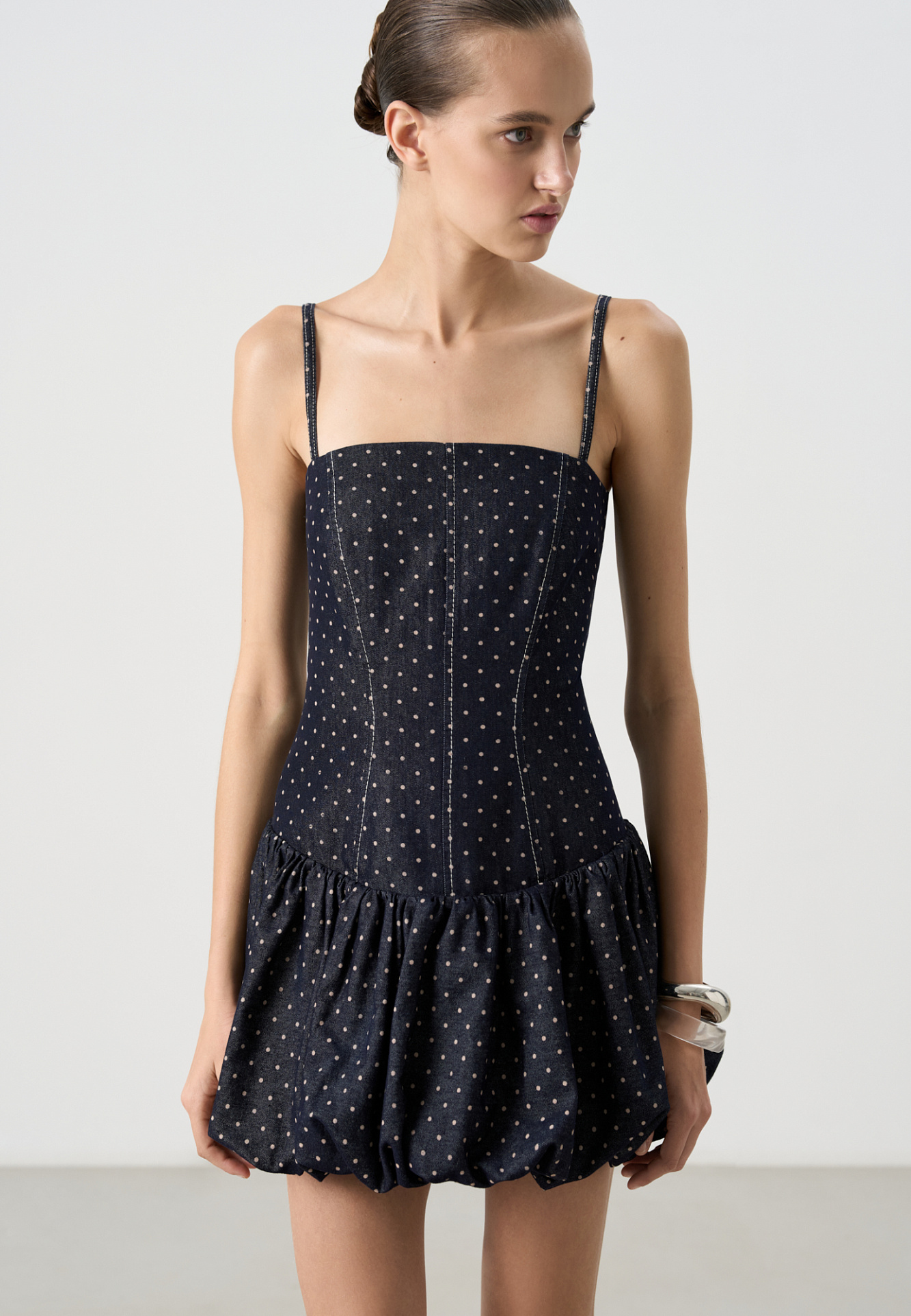 Принтованный джинсовый сарафан длины мини с юбкой-баллон. Модель приталенного силуэта, с корсетным верхом, без рукавов, на тонких бретельках. Застежка на молнию сзади.