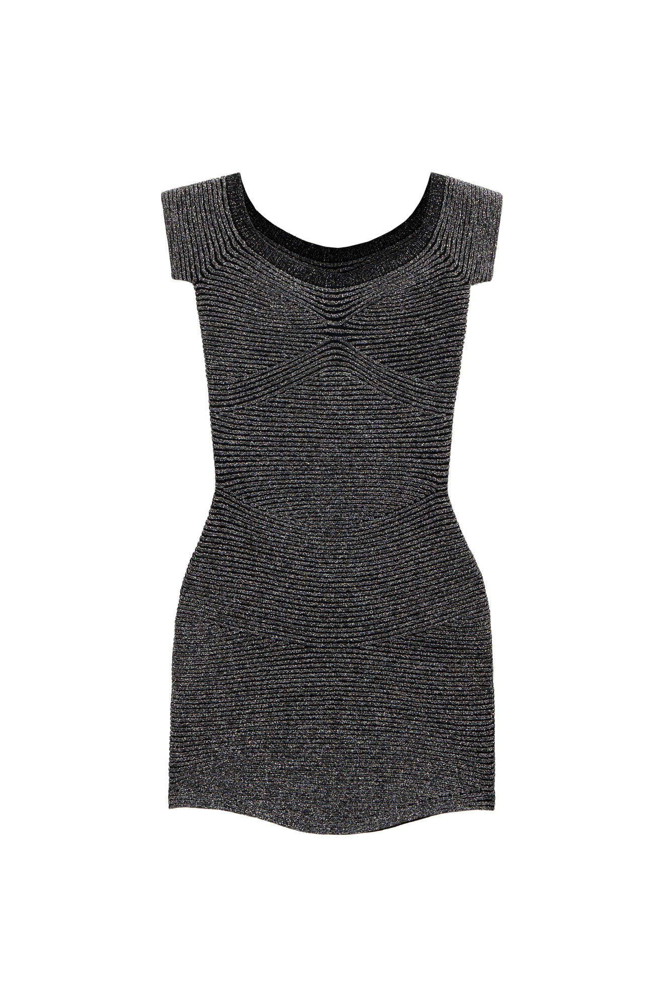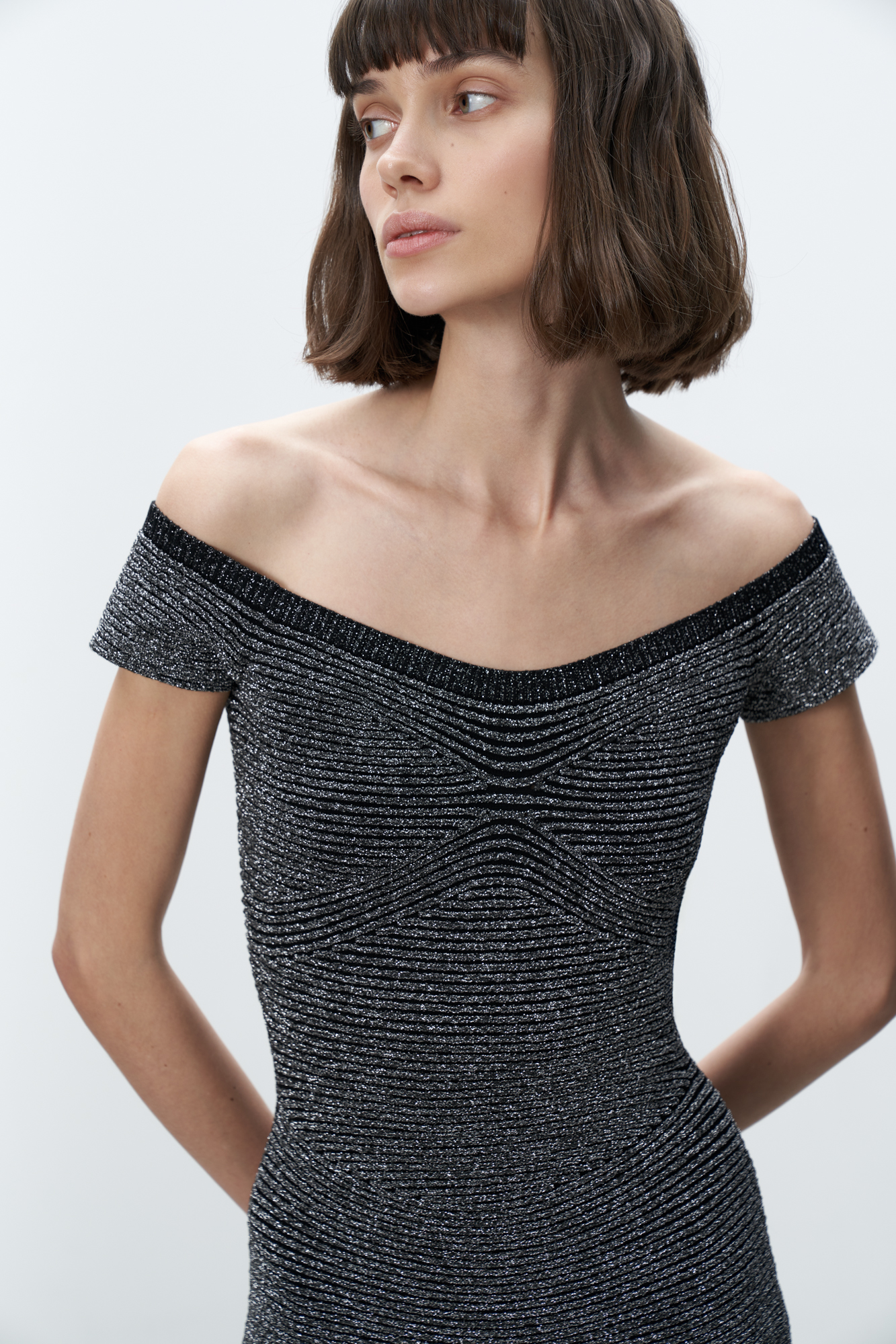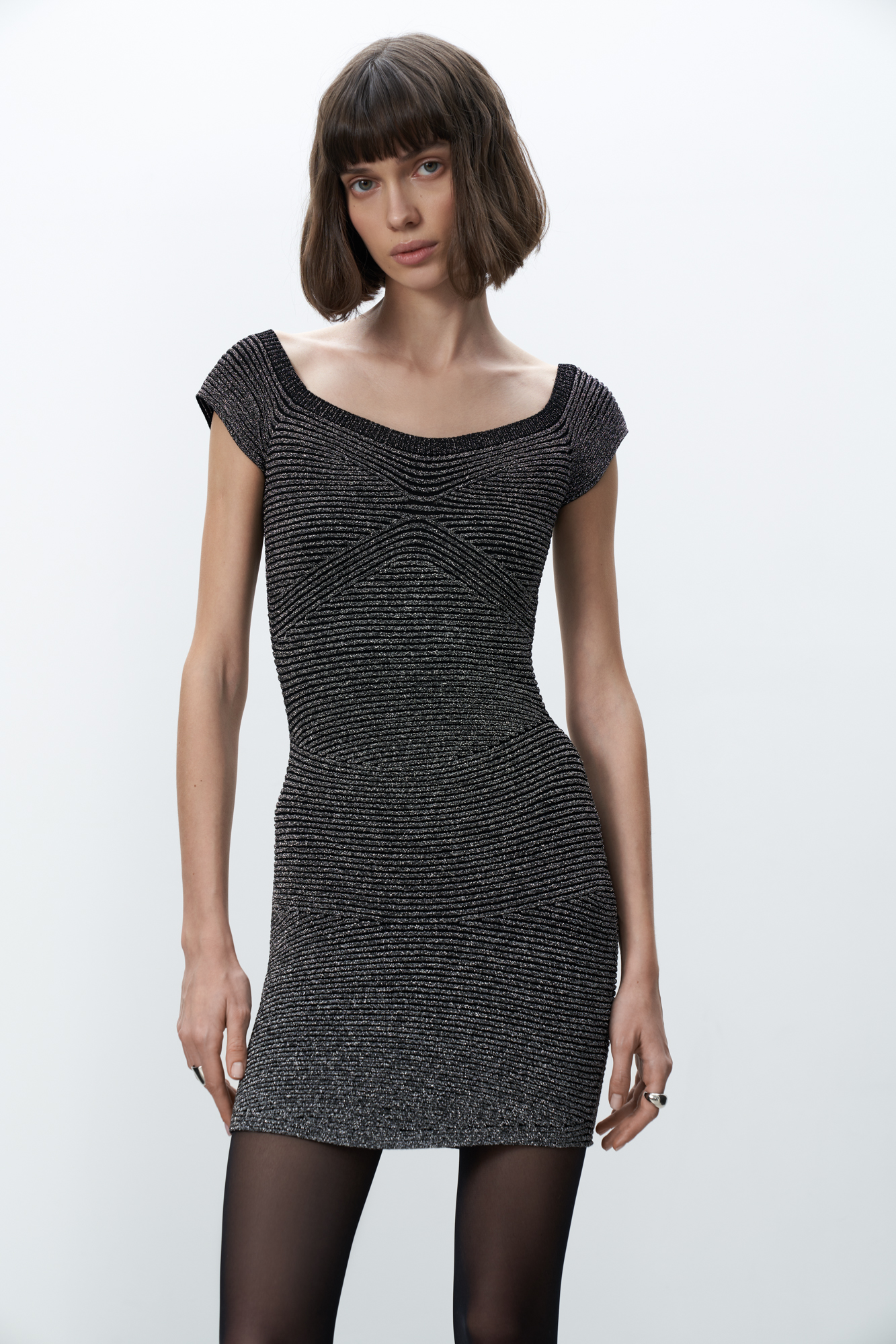Трикотажное платье длины мини, выполненное в технике текстурной вязки, с люрексом. Модель приталенного силуэта с коротким рукавом и круглым вырезом горловины.