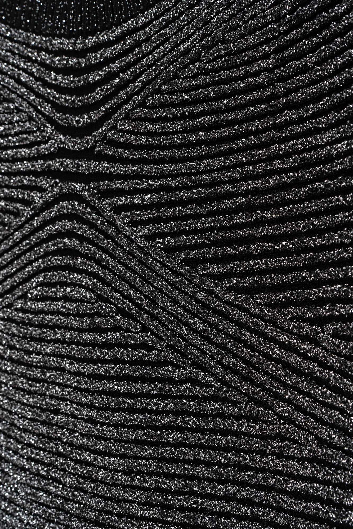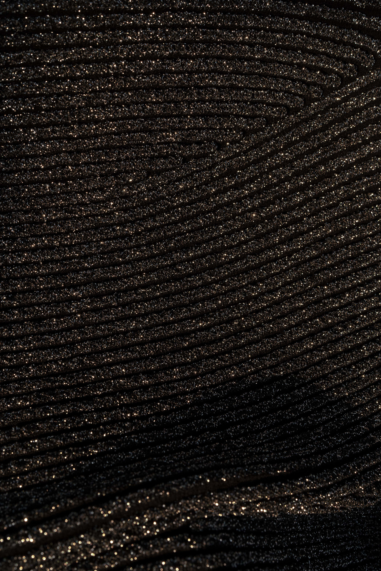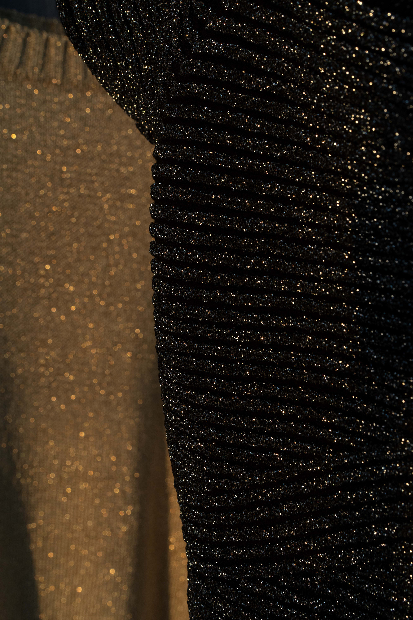 Трикотажное платье длины мини, выполненное в технике текстурной вязки, с люрексом. Модель приталенного силуэта с коротким рукавом и круглым вырезом горловины.