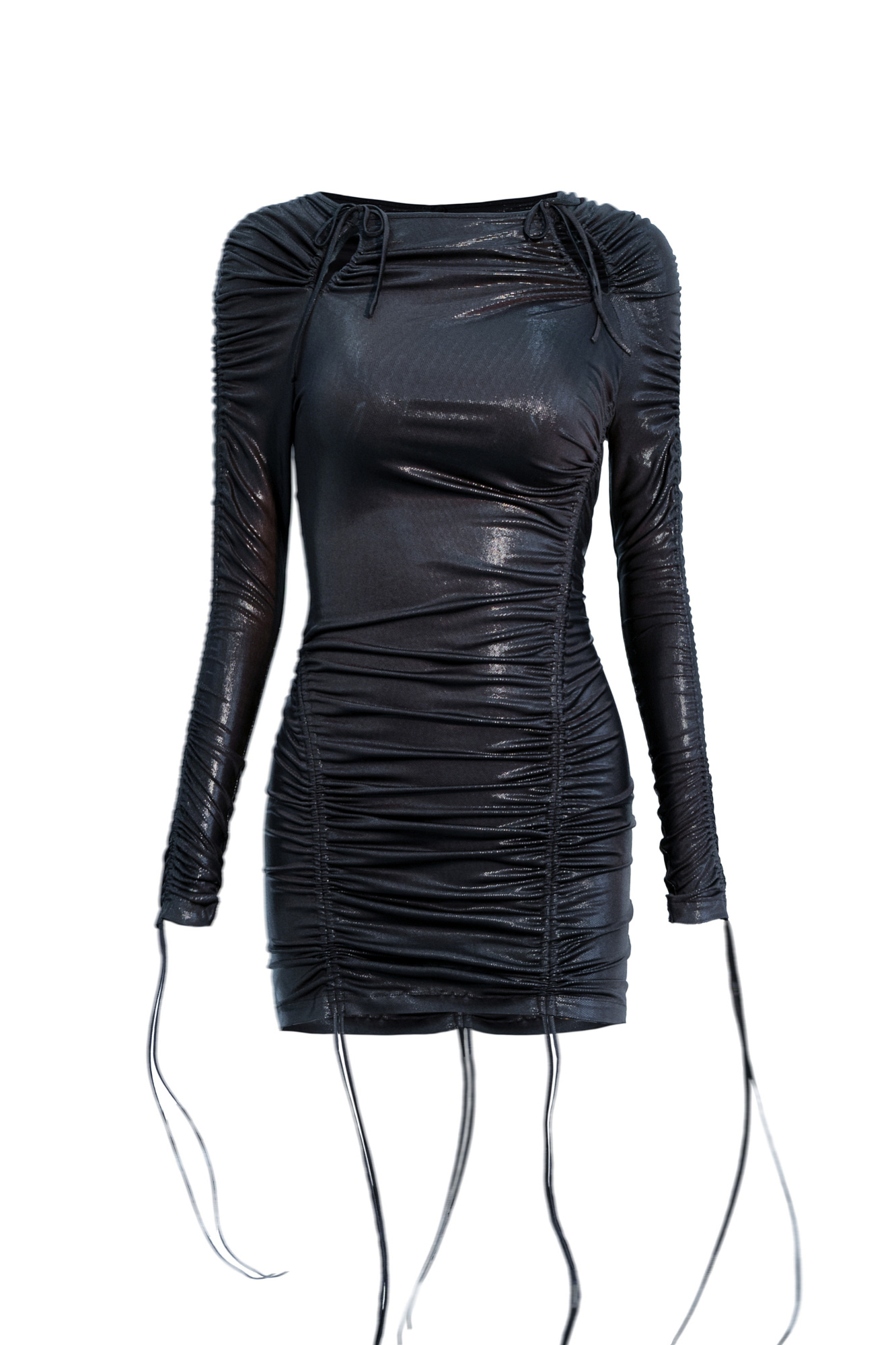 Платье длины мини из трикотажного полотна. Модель приталенного силуэта, с длинными рукавами и кулисками на рукавах и бедрах. Изделие декорировано драпировкой.