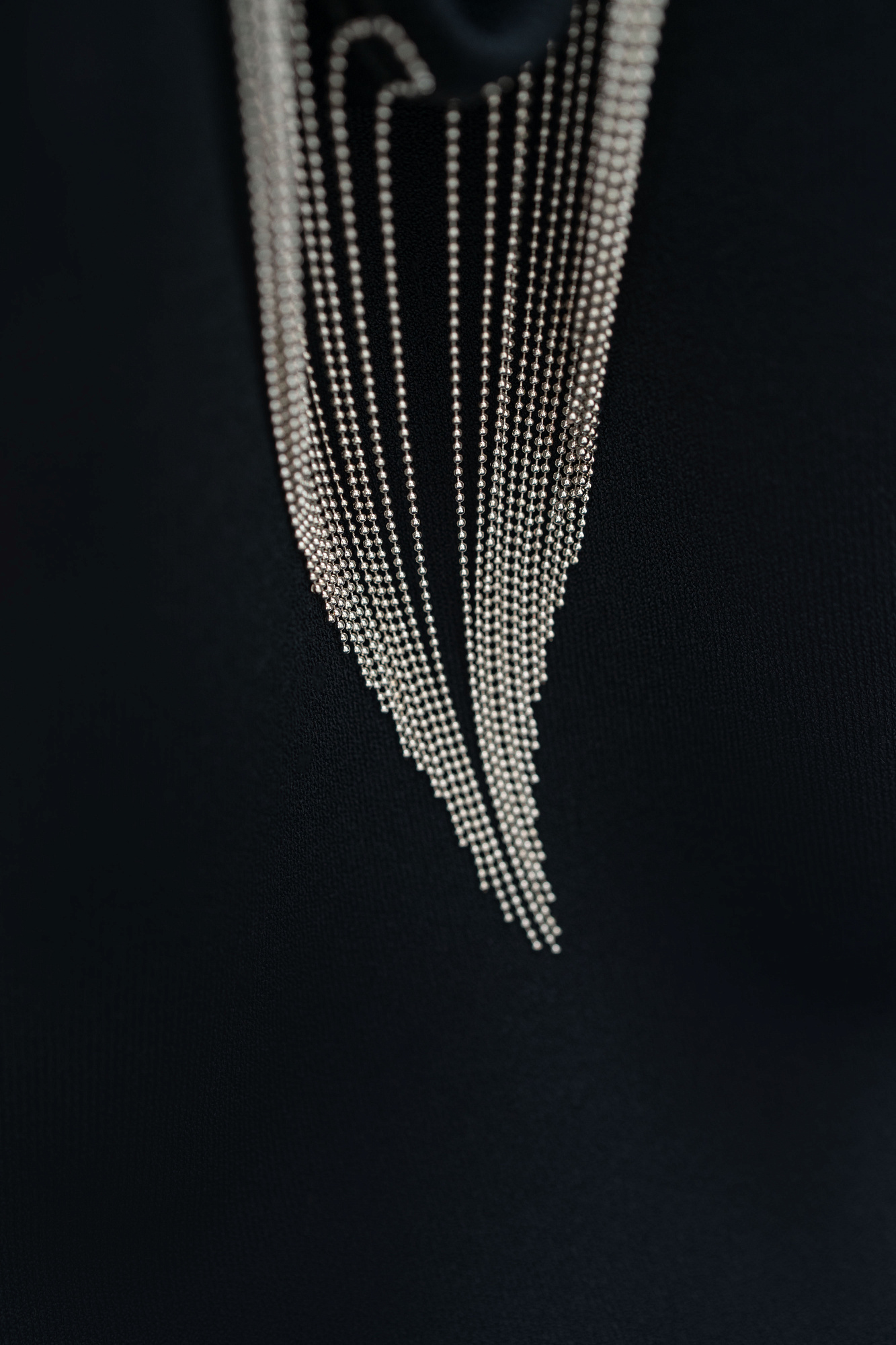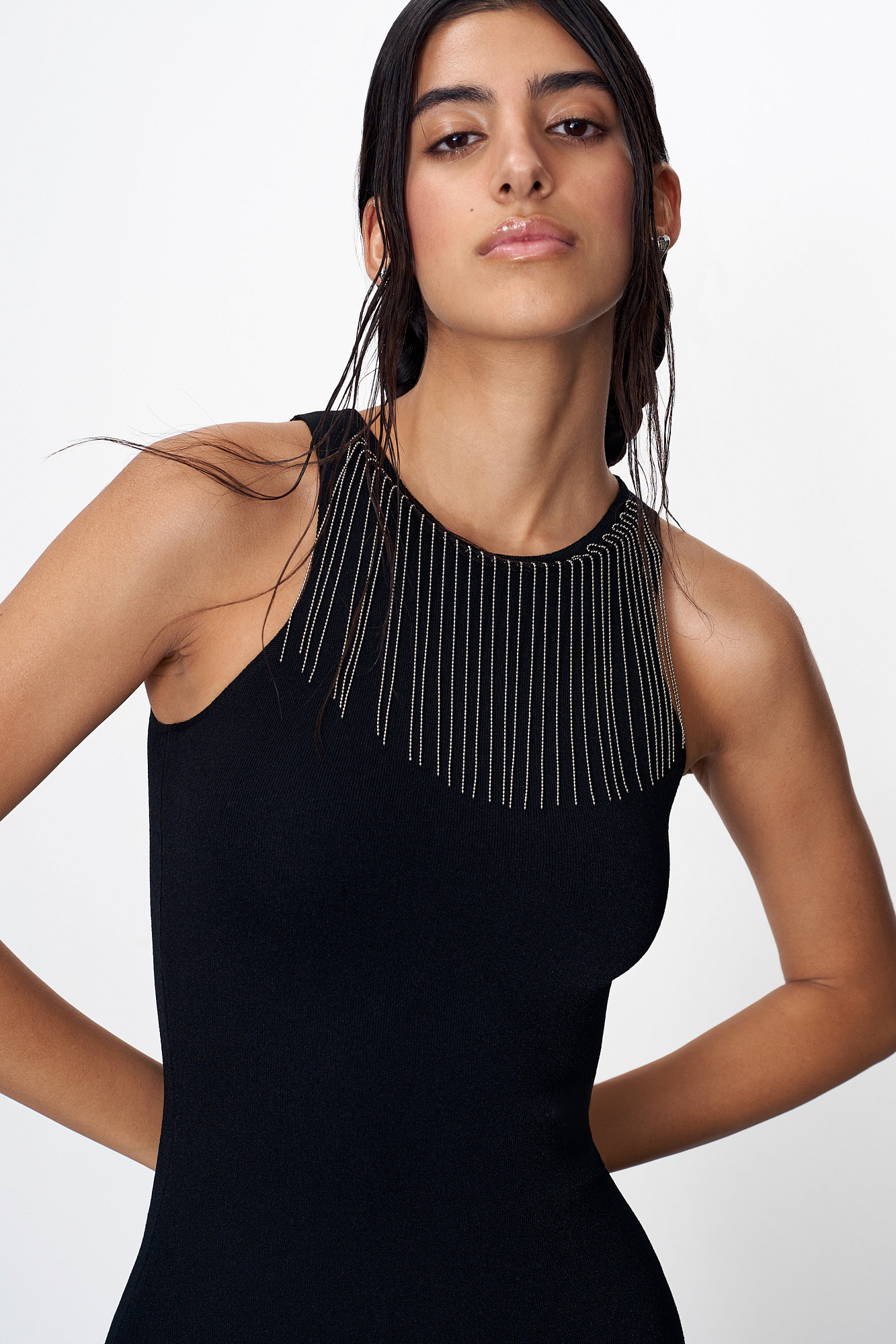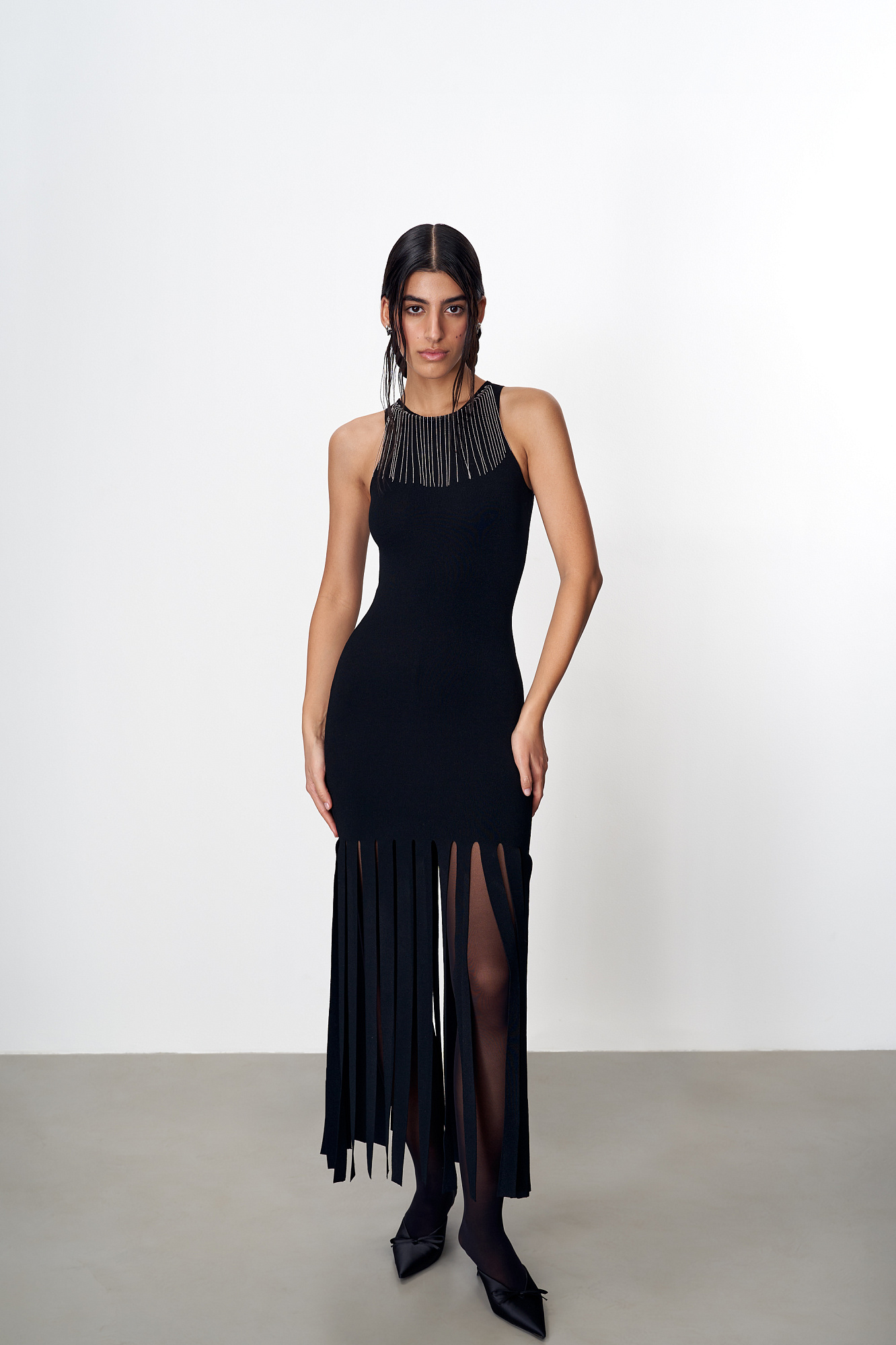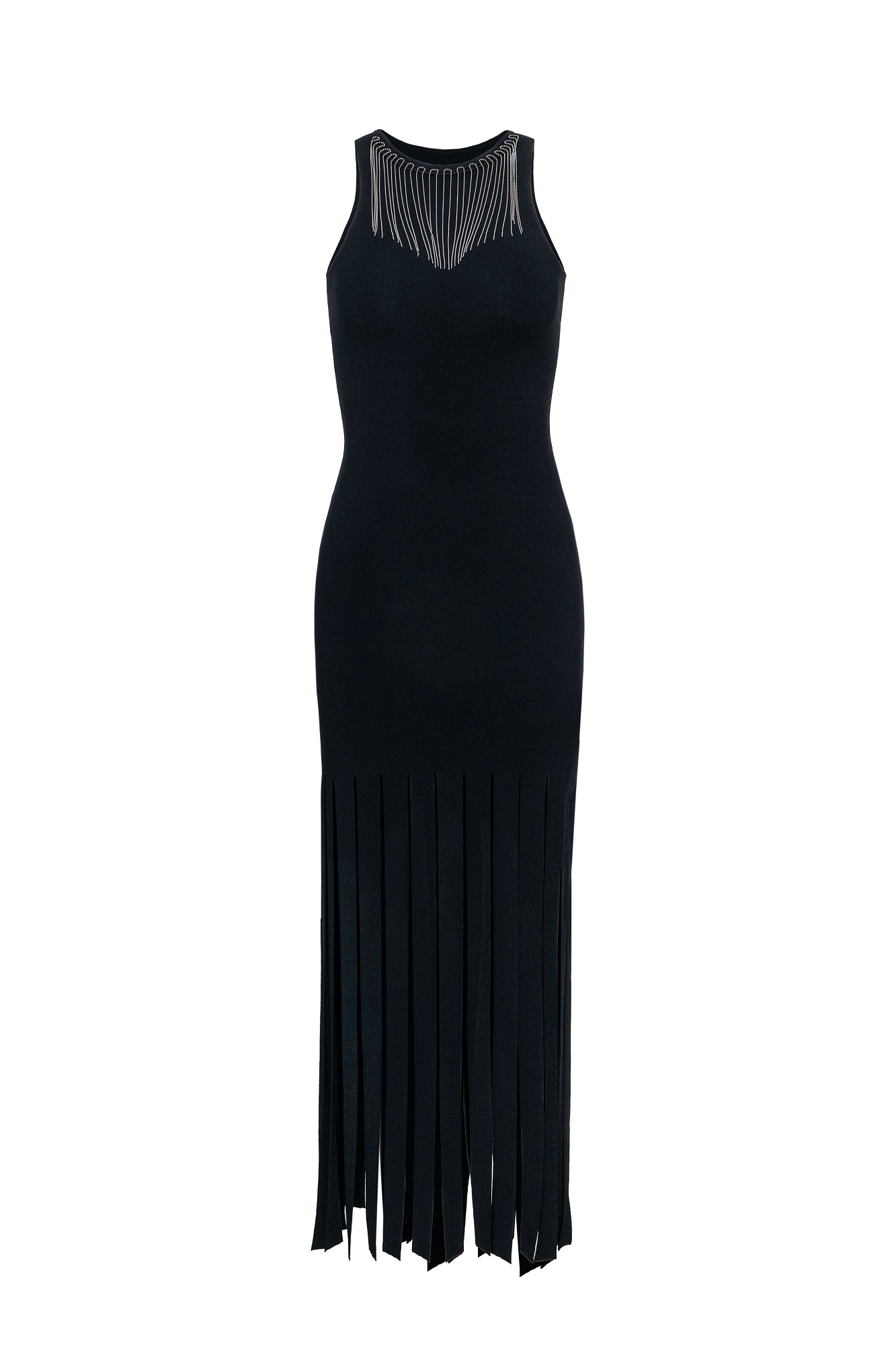 Трикотажное платье из вискозы длины макси. Модель приталенного силуэта без рукавов. Горловина изделия декорирована бусами. Юбка выполнена в виде широкой бахромы.