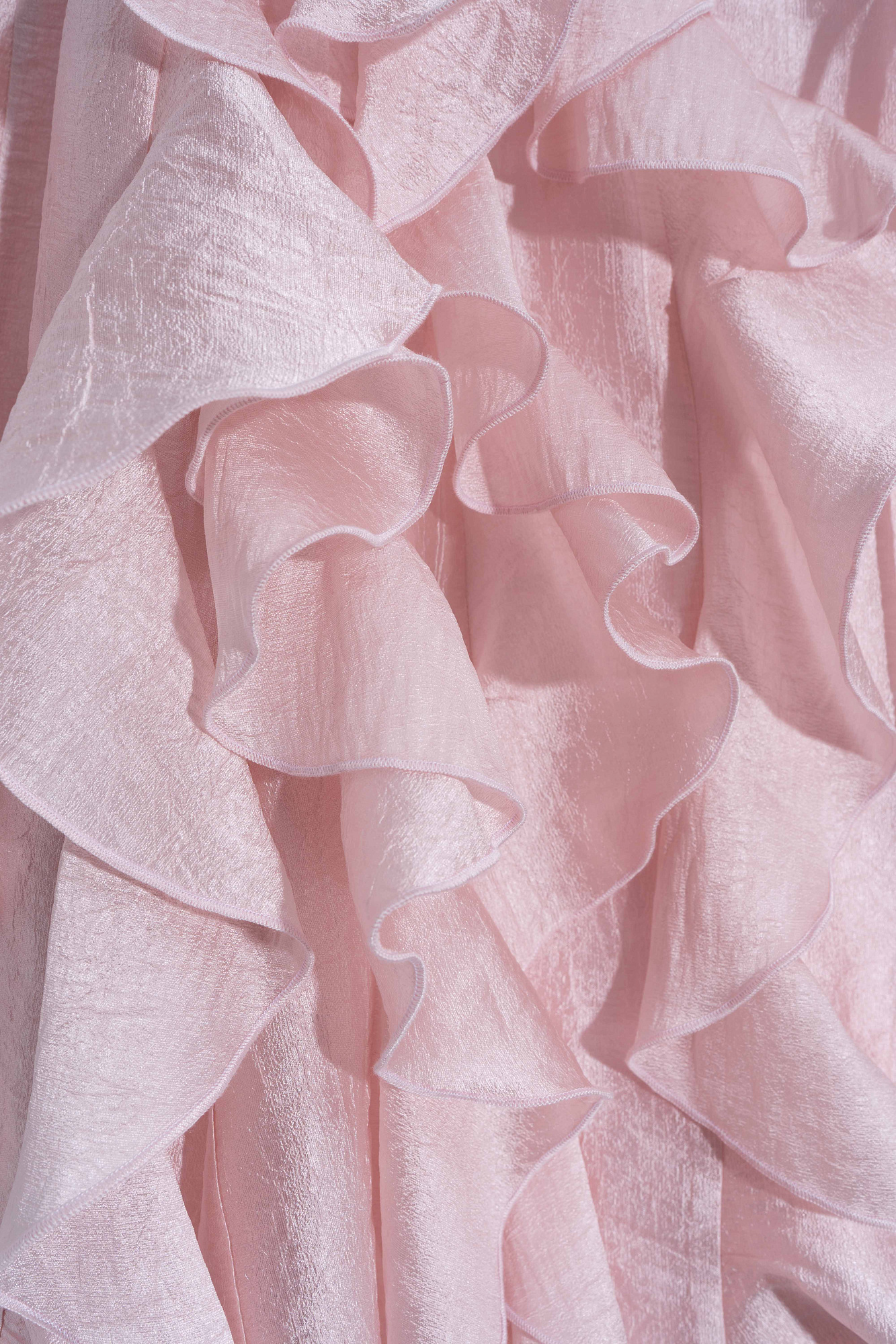Блуза из тонкой вискозы. Модель свободного силуэта с объемными рукавами и V-образным вырезом, фиксирующимся завязками. Изделие декорировано воланами. Застежка на пуговицы.