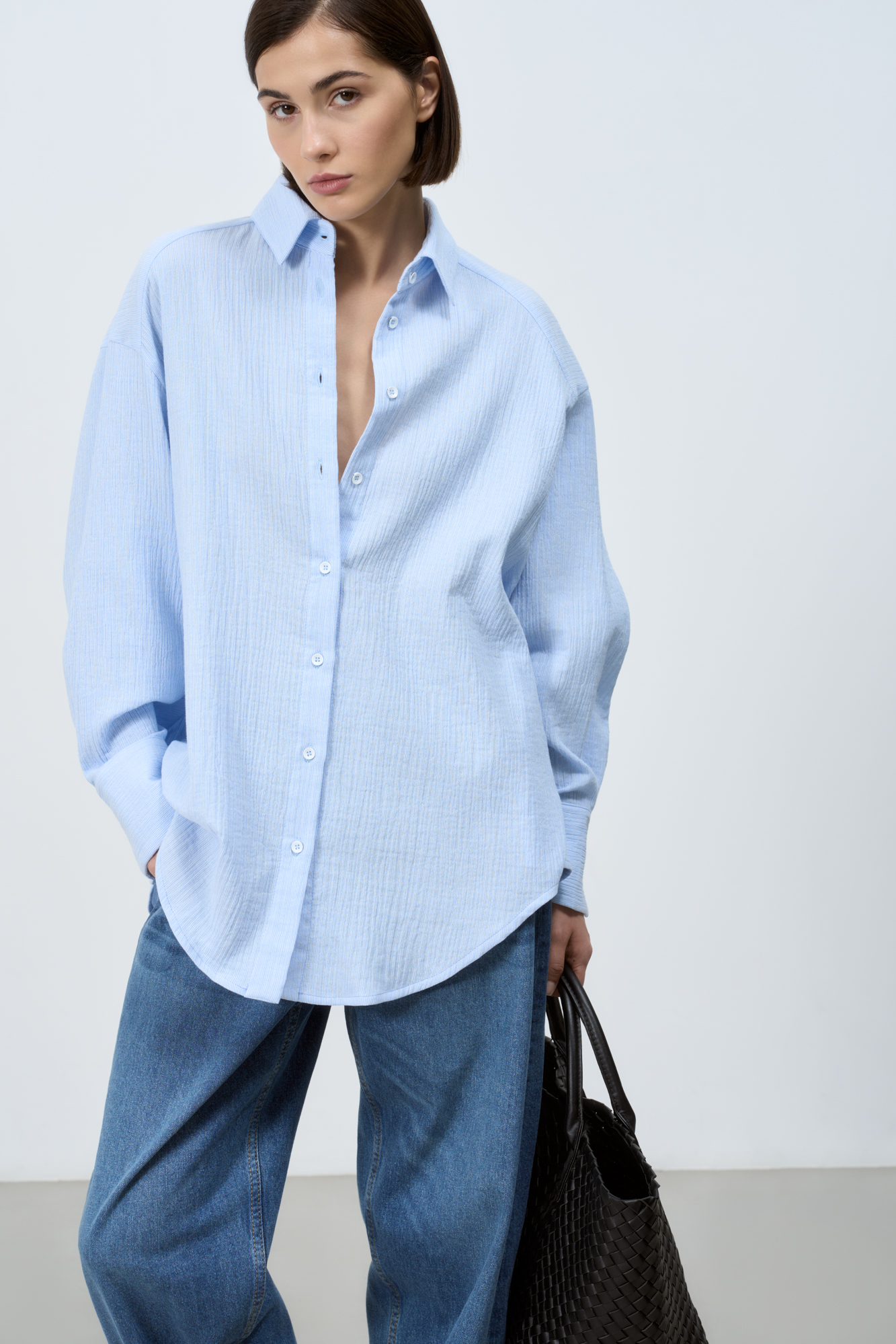 Рубашка из 100% текстурного хлопка. Модель свободного силуэта, со спущенной линией плеч, классическим отложным воротником и длинными рукавами с манжетами. Застежка на пуговицы.