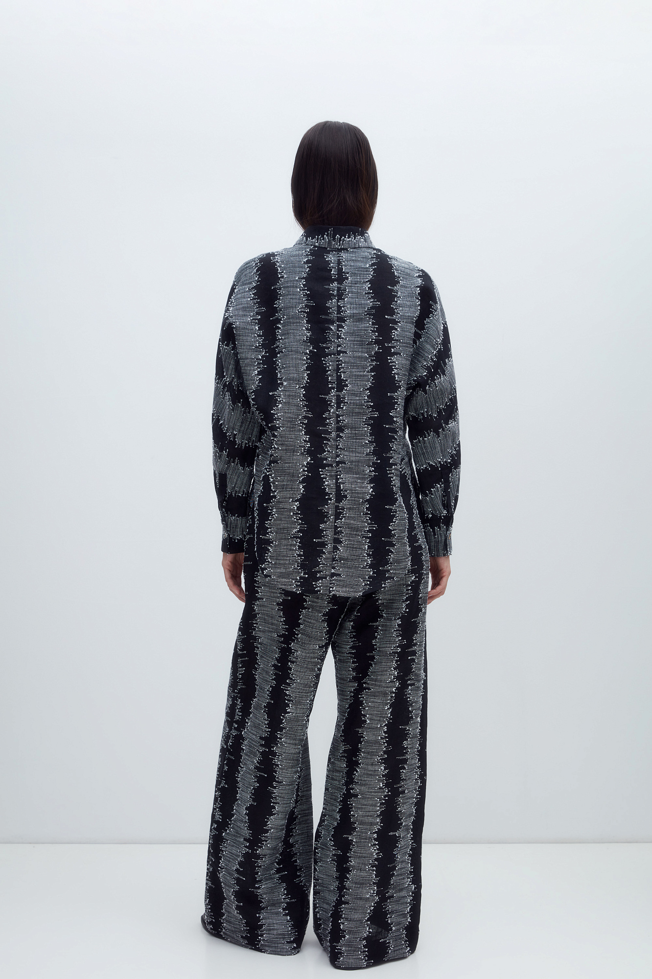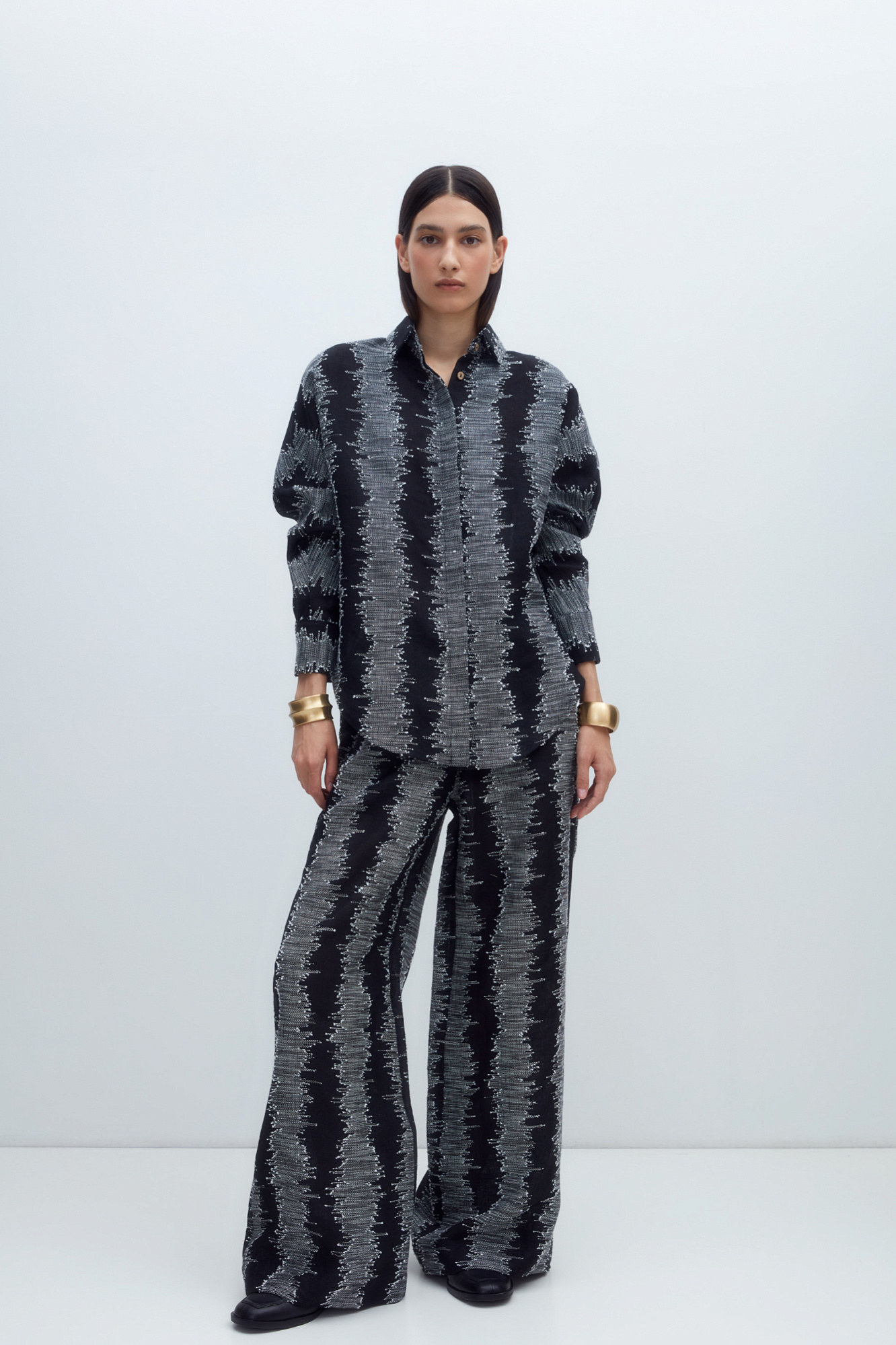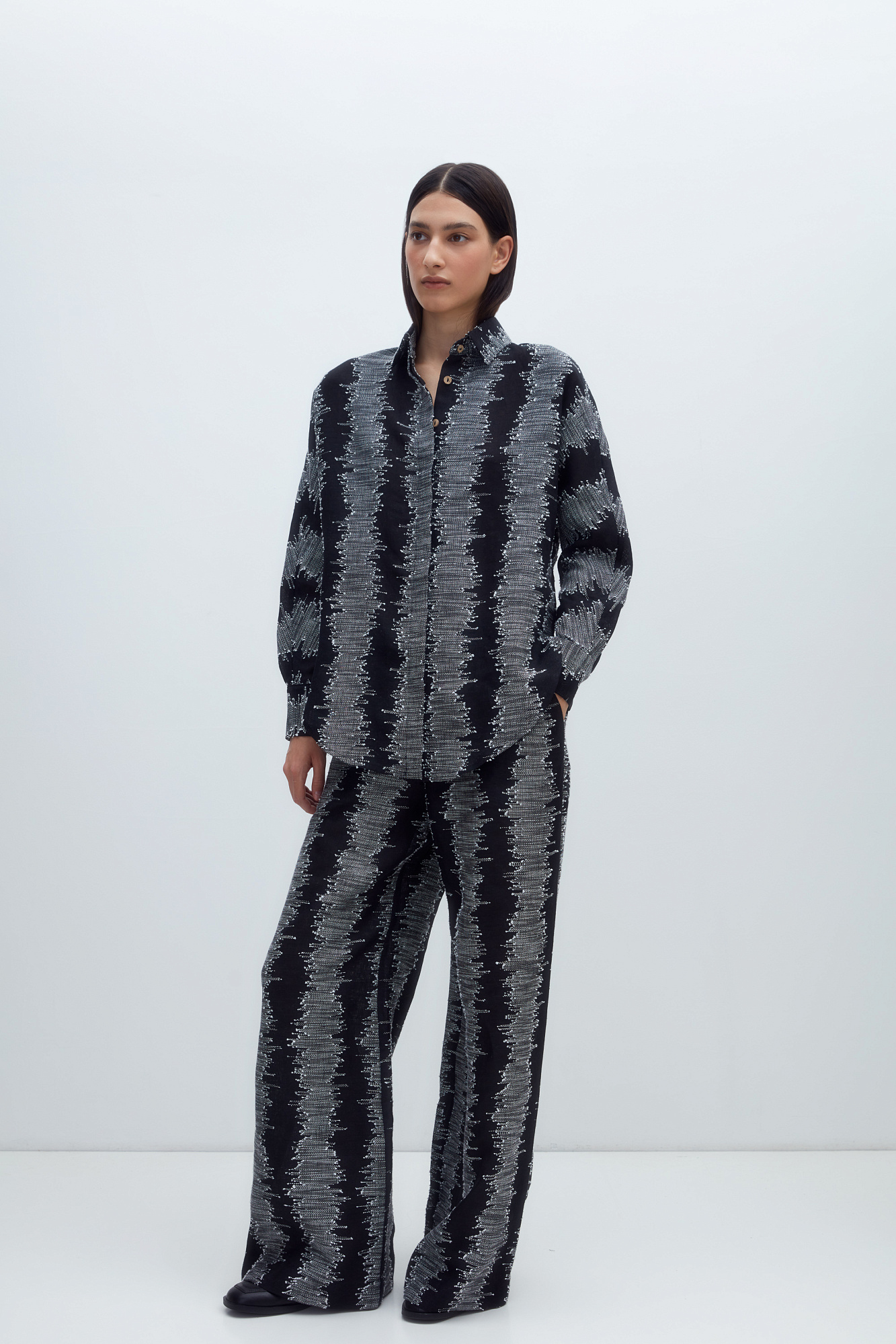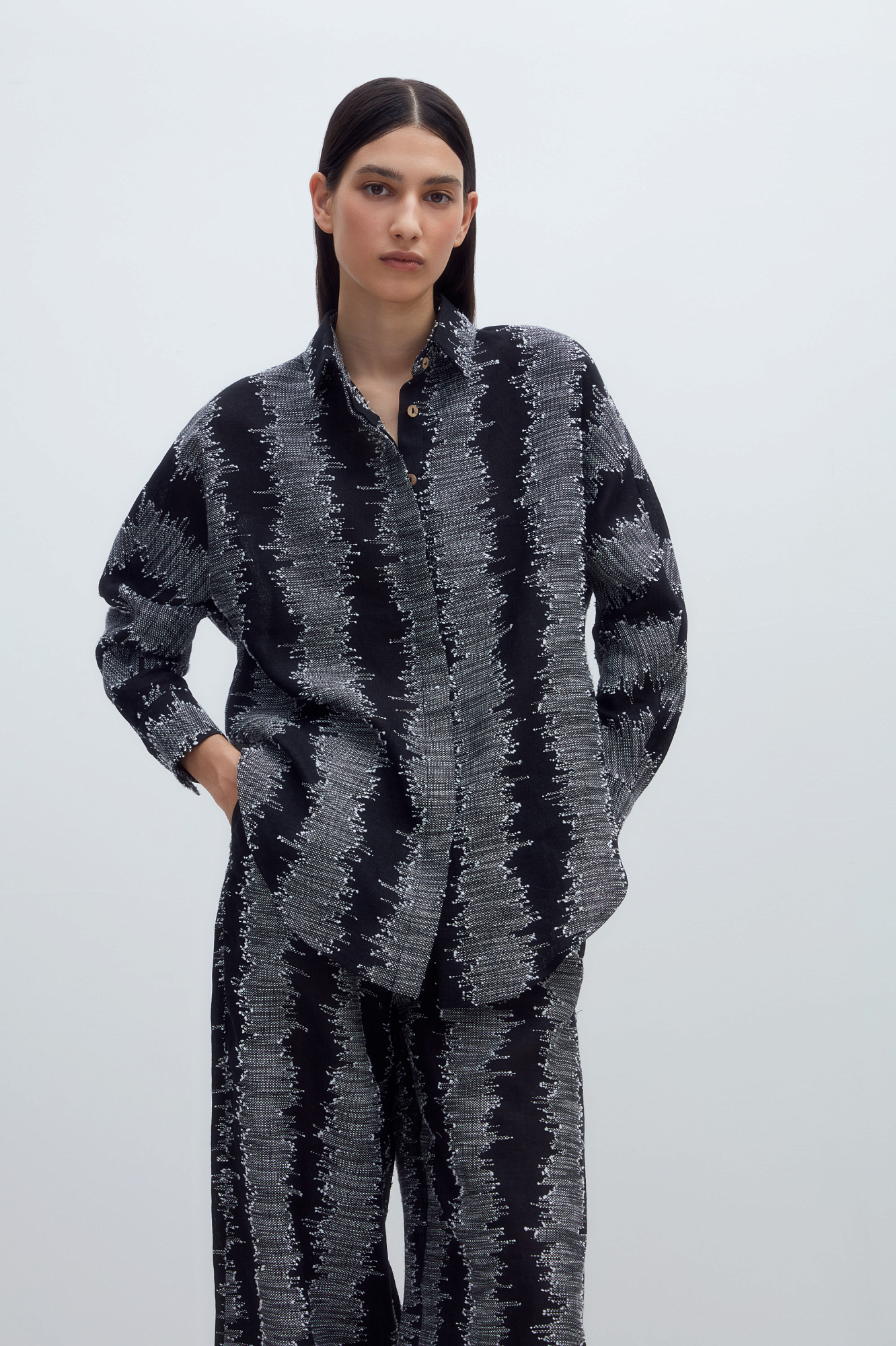 Рубашка из 100% льна с супатной застежкой на пуговицы. Модель свободного силуэта, с классическим отложным воротником и длинными рукавами.