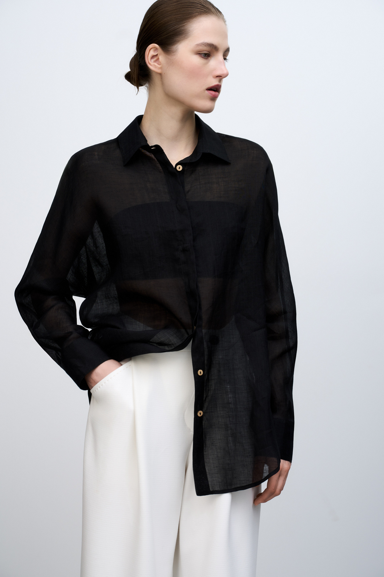Полупрозрачная рубашка из 100% крапивы. Модель свободного силуэта с классическим воротом и манжетами. Застежка на пуговицы. Ткань из крапивы очень легкая, не электризуется, а натуральное происхождение подчеркивает экологичность данной модели.