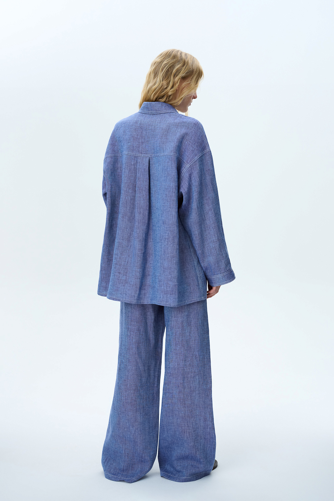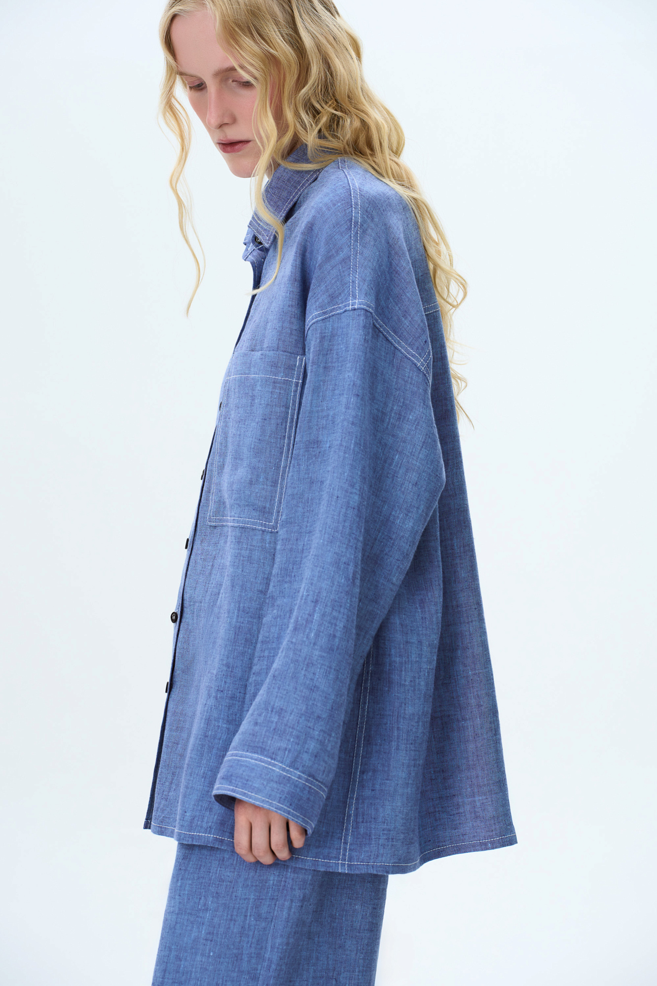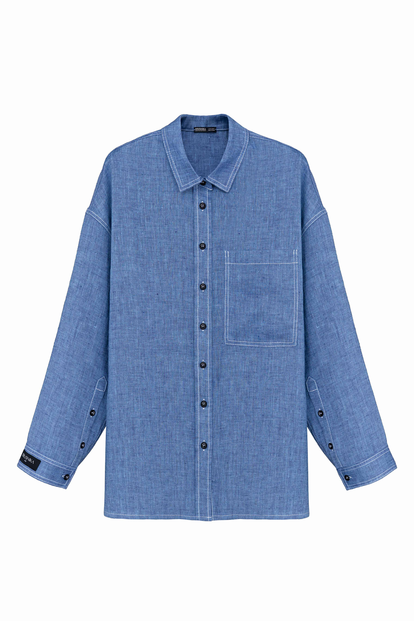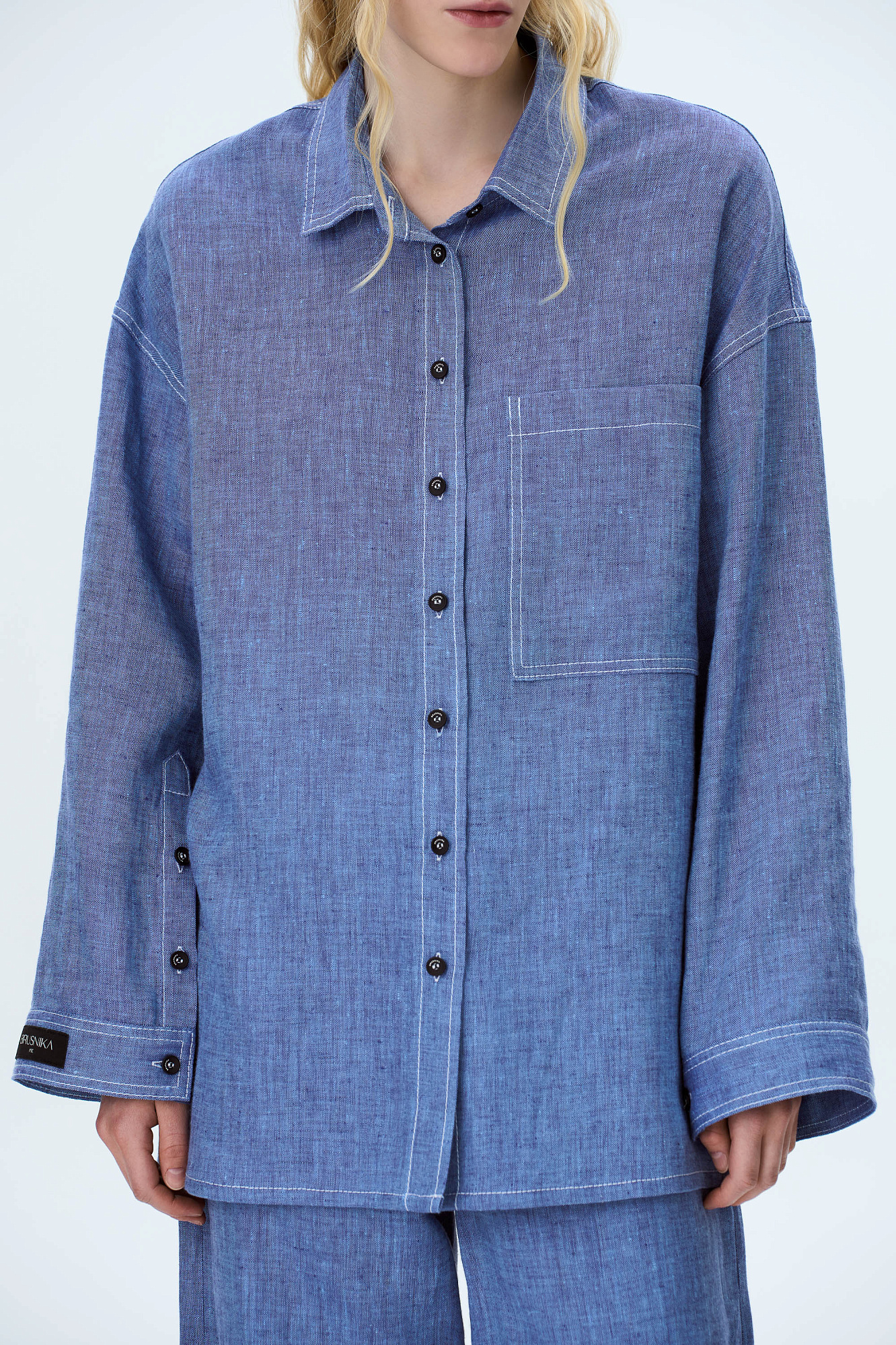 Льняная рубашка с накладным карманом на груди. Модель свободного силуэта с классическим отложным воротником, спущенной линией плеч и большим нагрудным карманом. Застежка на пуговицы. Изделие декорировано брендированным ярлыком на рукаве и пуговицами на манжетах рукавов.