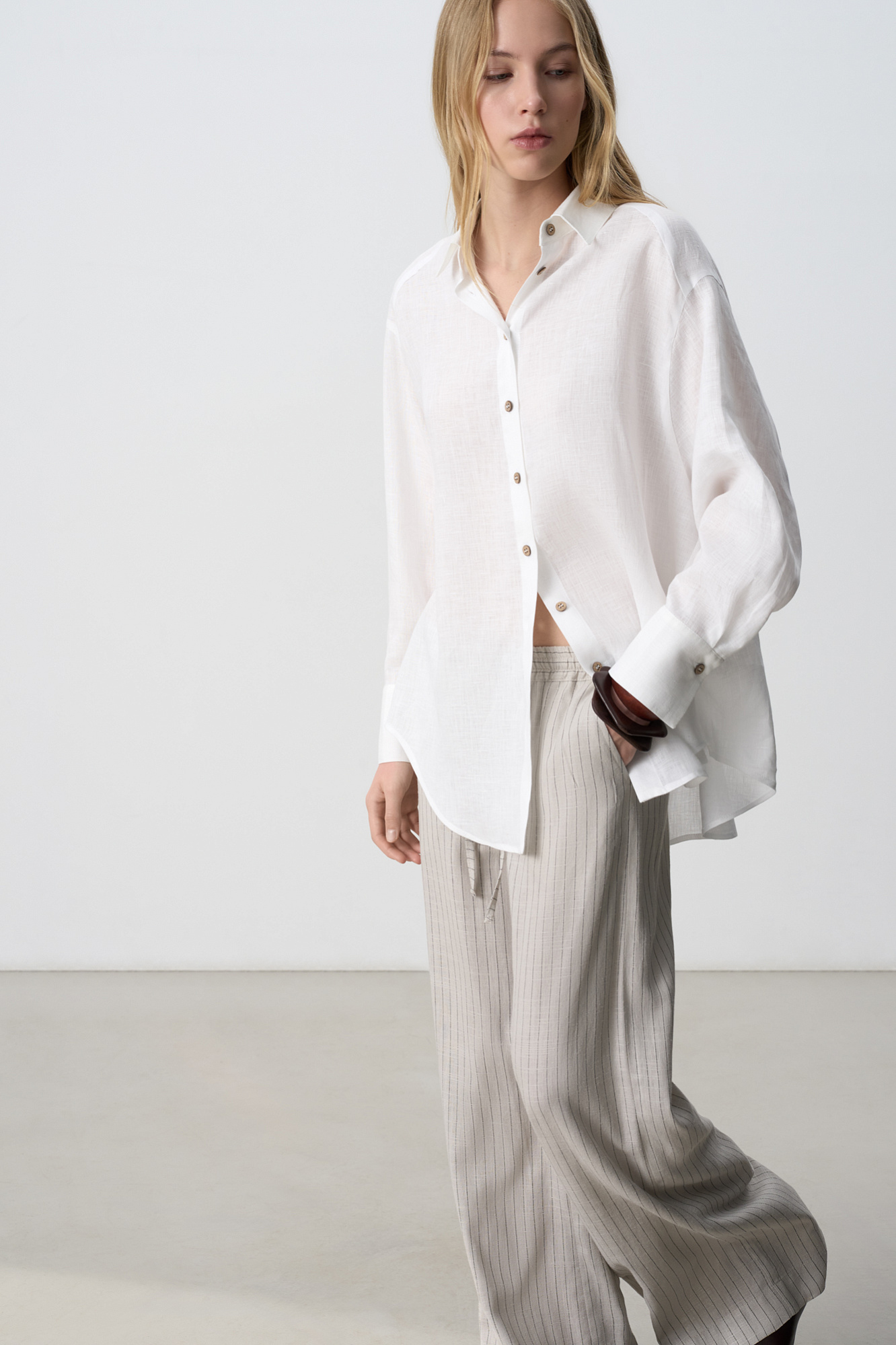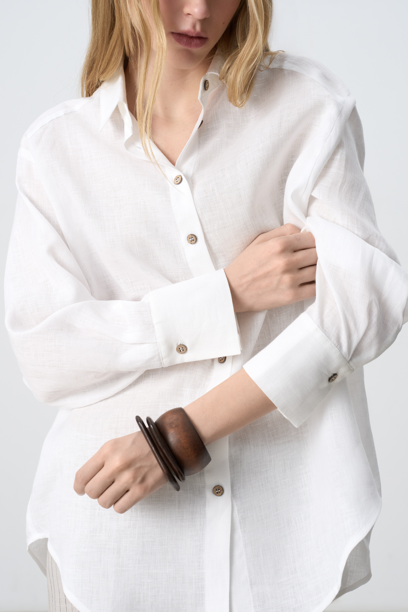 Классическая рубашка из 100% льна. Модель прямого кроя с отложным воротником, длинными рукавами с манжетами на пуговицах и закругленным нижним краем. Застежка на пуговицы.