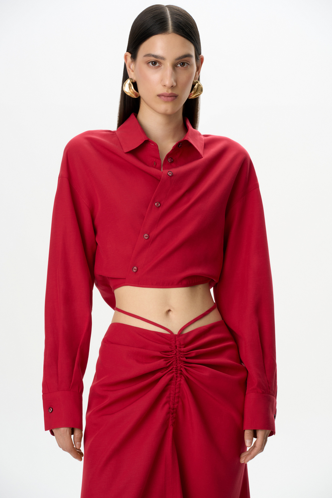 Укороченная рубашка с завязками. Модель свободного силуэта со спущенной линией плеча, манжеты на пуговицах. Дополнить образ можно юбкой в таком же стиле.