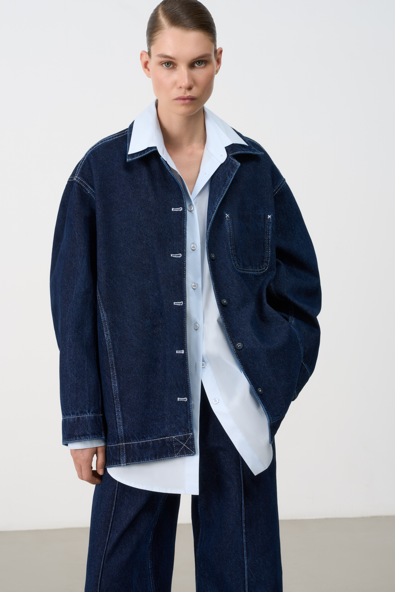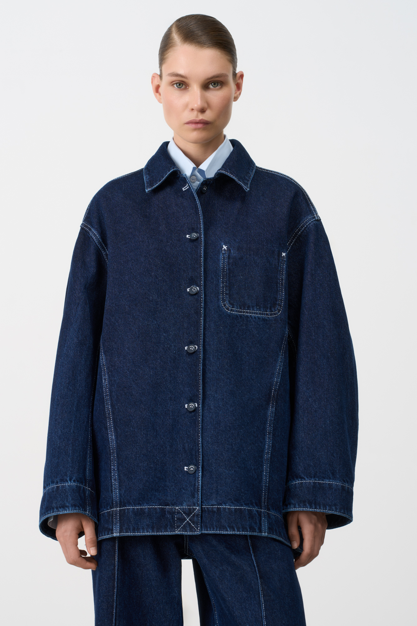 Джинсовая рубашка с рельефными швами и контрастной строчкой. Модель свободного силуэта со спущенной линией плеча и застежкой на пуговицы. Имитация кармана на груди.