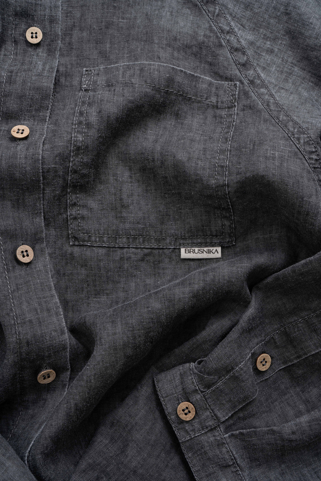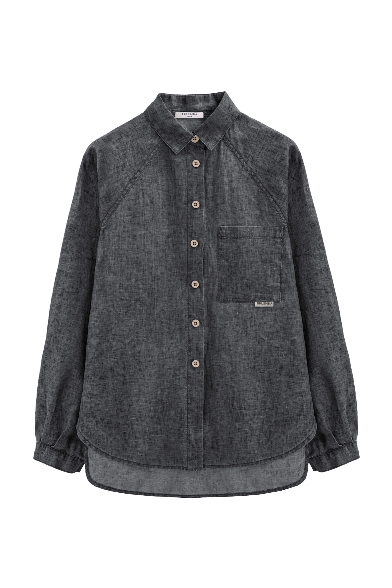 Рубашка из 100% льна. Модель свободного кроя, с длинным рукавом реглан, отложным воротником, нагрудным карманом и удлиненной спинкой. Застежка на пуговицы.