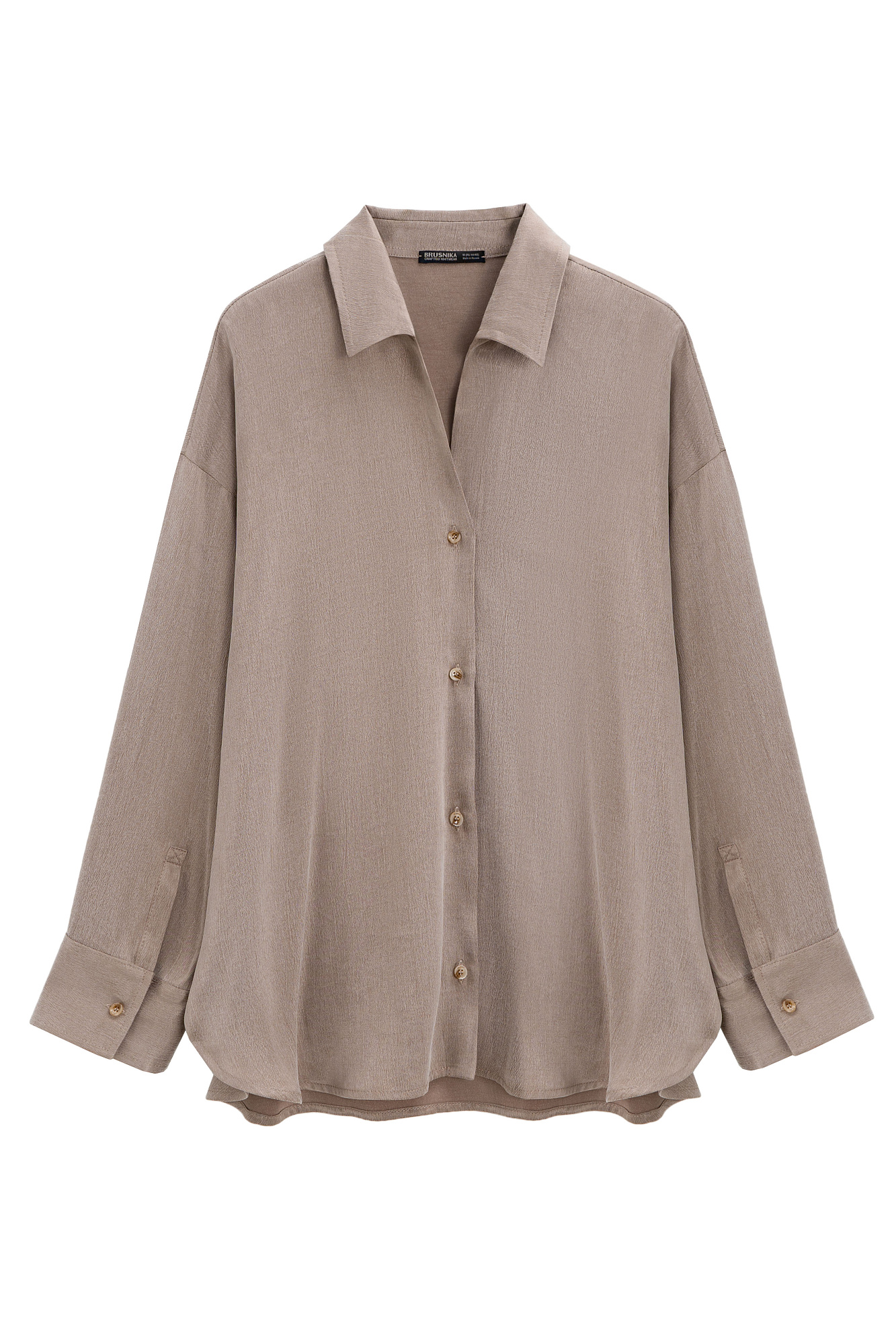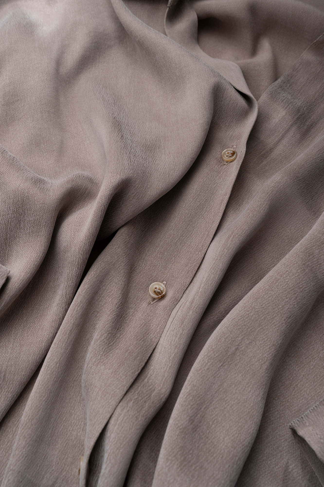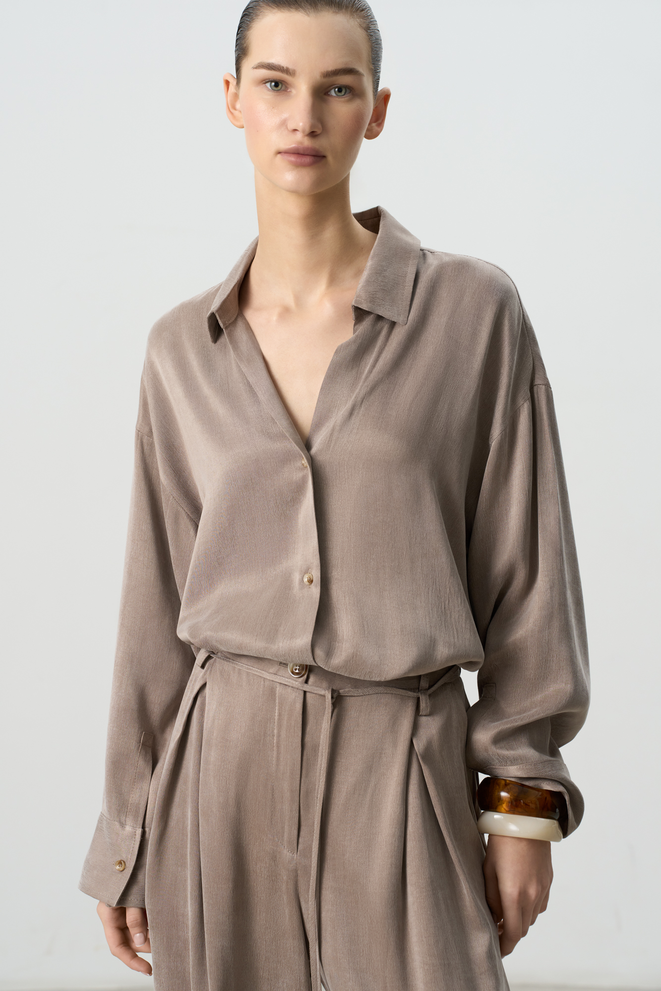Рубашка из купры. Модель свободного кроя, с отложным воротником, V-образным вырезом, длинными рукавами с манжетами на пуговицах.