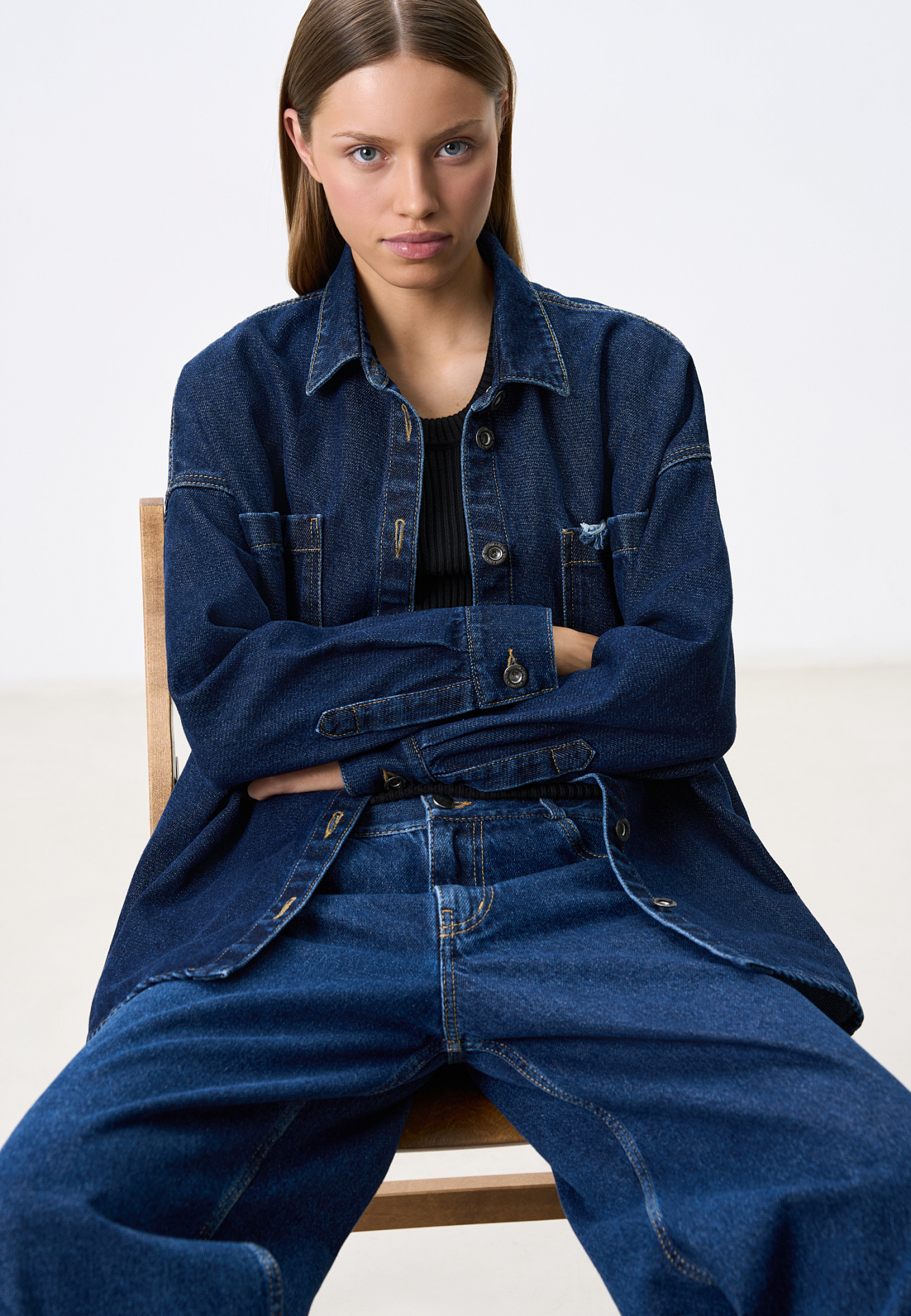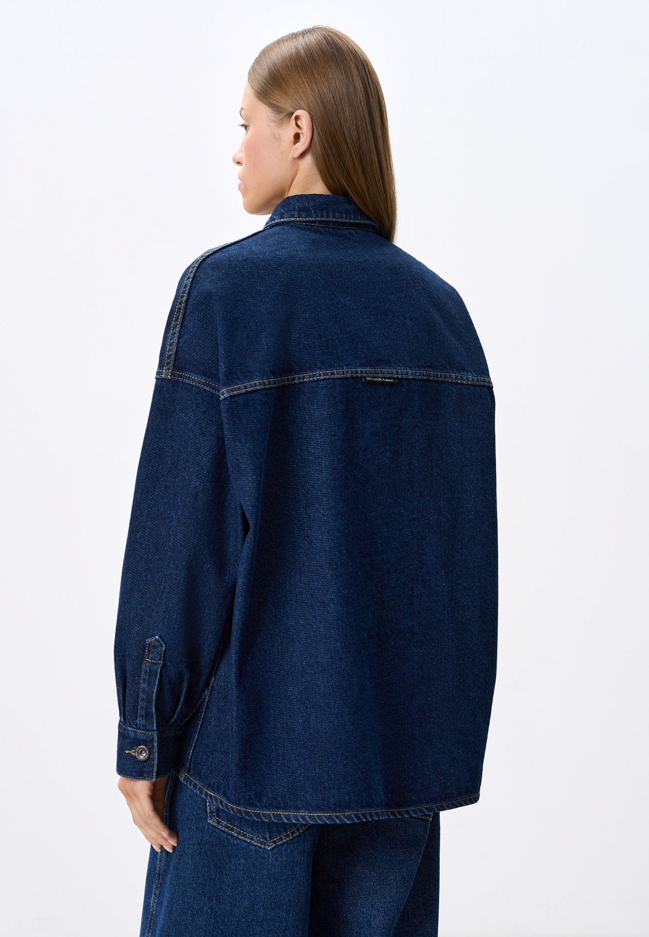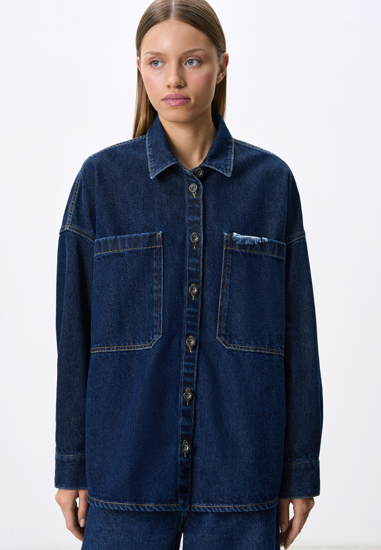 Джинсовая рубашка из 100% хлопка. Модель прямого силуэта с классическим отложным воротником, длинными рукавами и двумя большими нагрудными карманами. Застежка на металлические пуговицы.