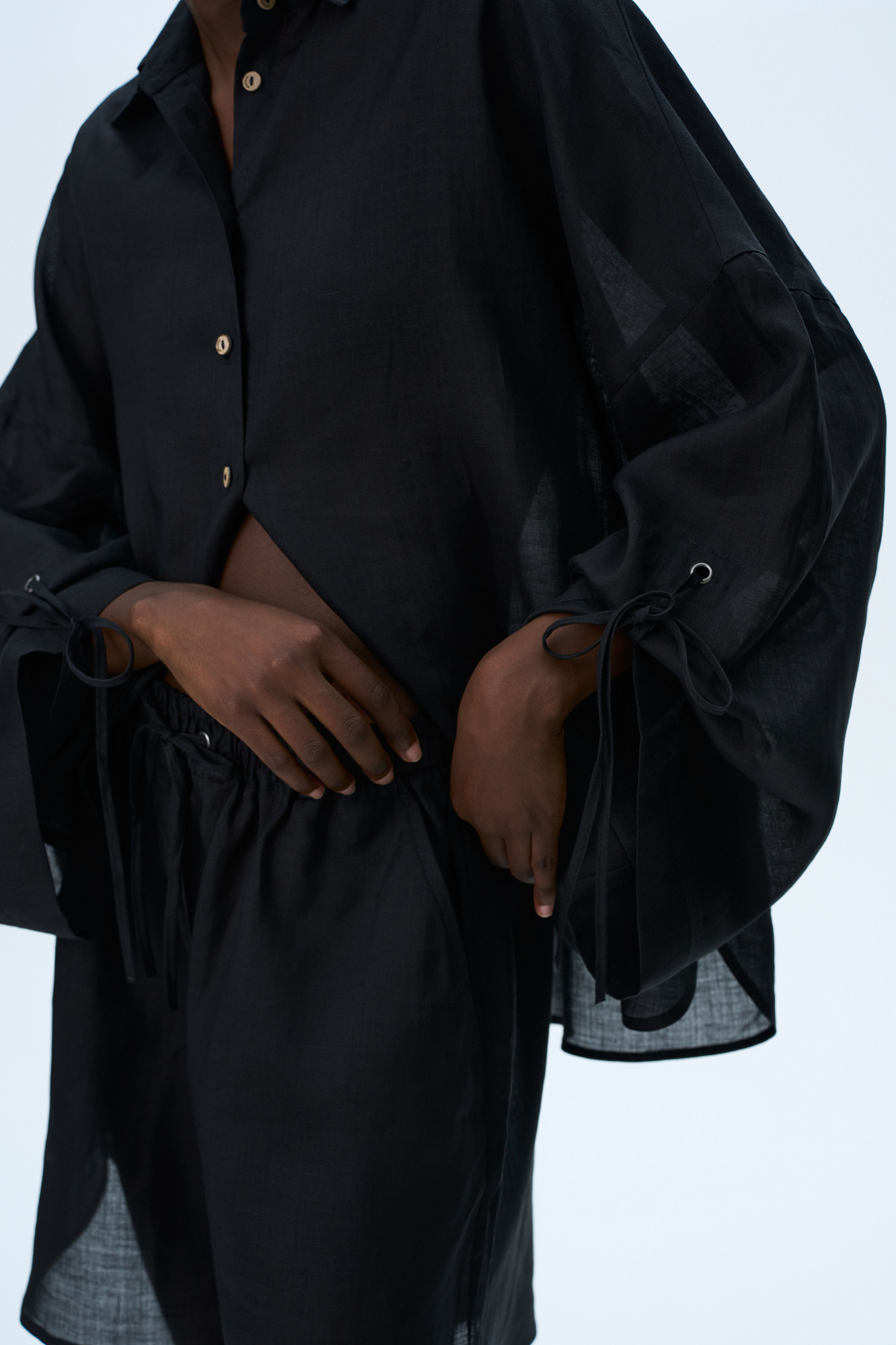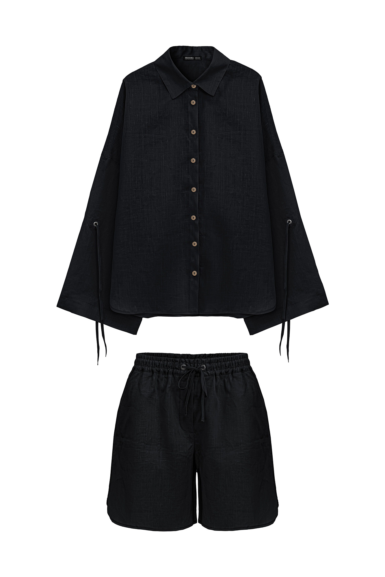Комплект из 100% крапивы, состоящий из рубашки и шорт. Рубашка с длинными расклешенными рукавами на кулиске, классическим отложным воротником и застежкой на пуговицы. Короткие шорты  с боковыми карманами и эластичным поясом на резинке.