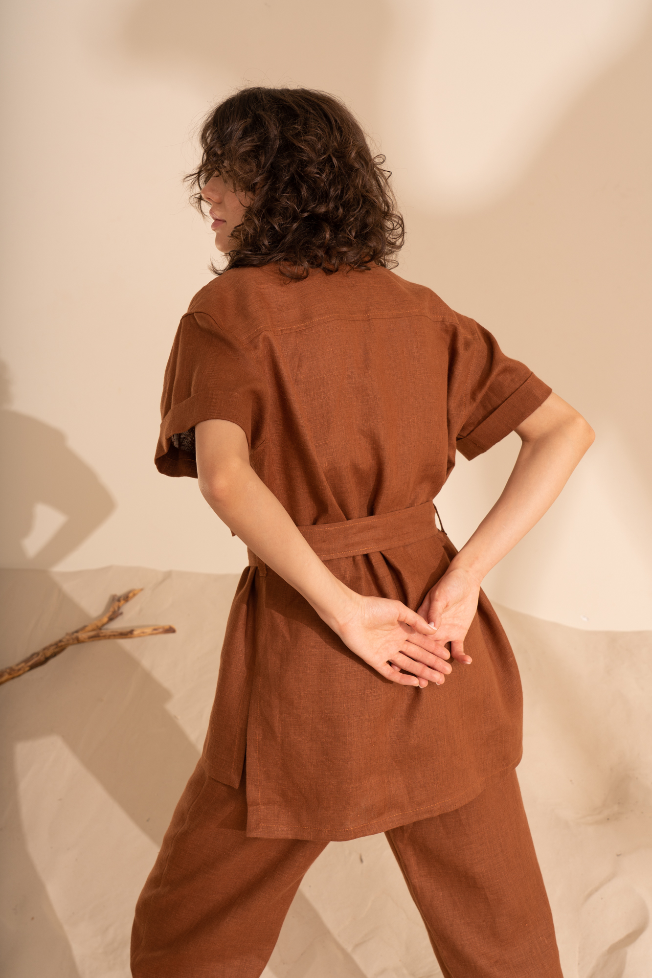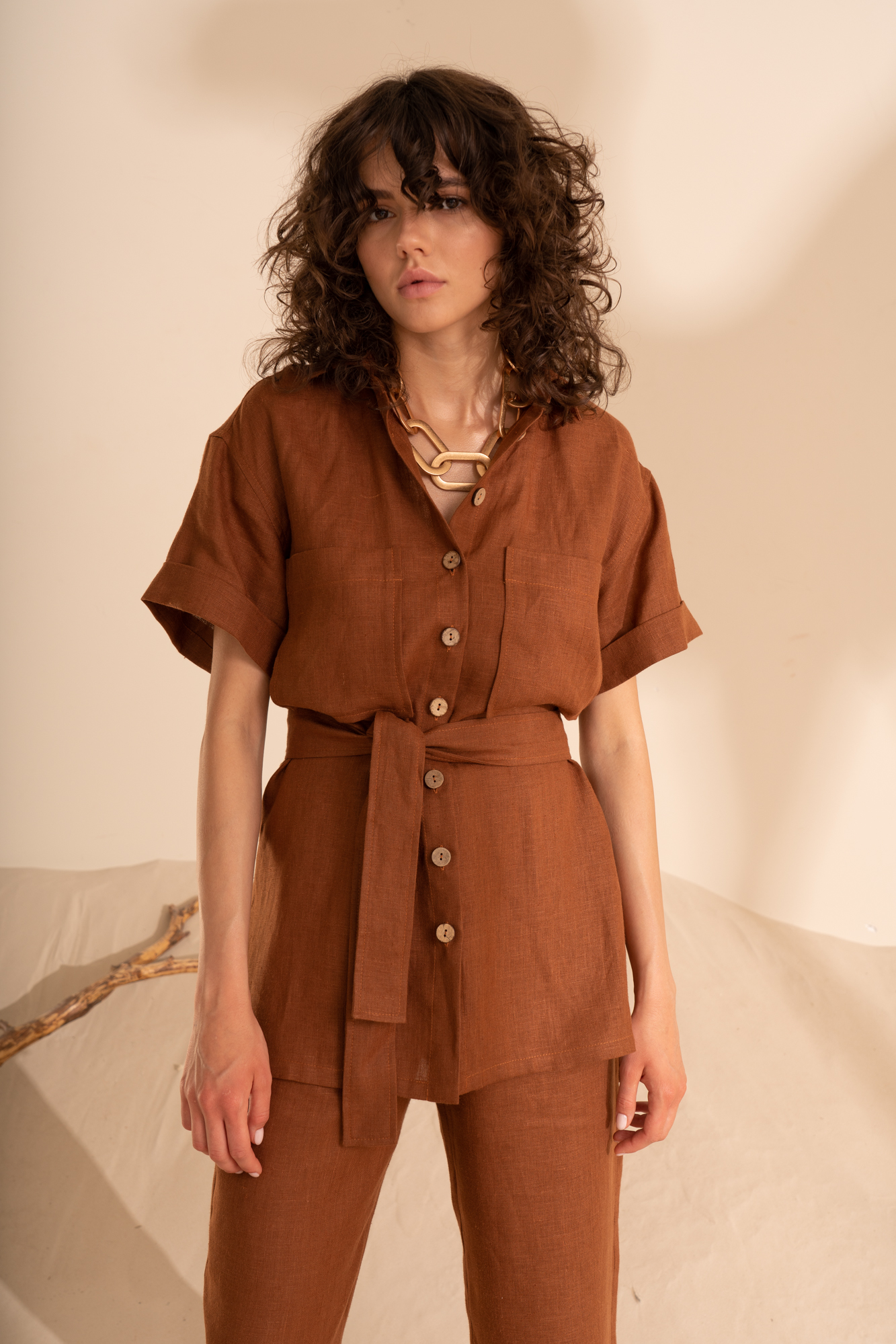 Рубашка из 100% льна с коротким рукавом и накладными карманами на груди. Застежка на пуговицы и съемный пояс.