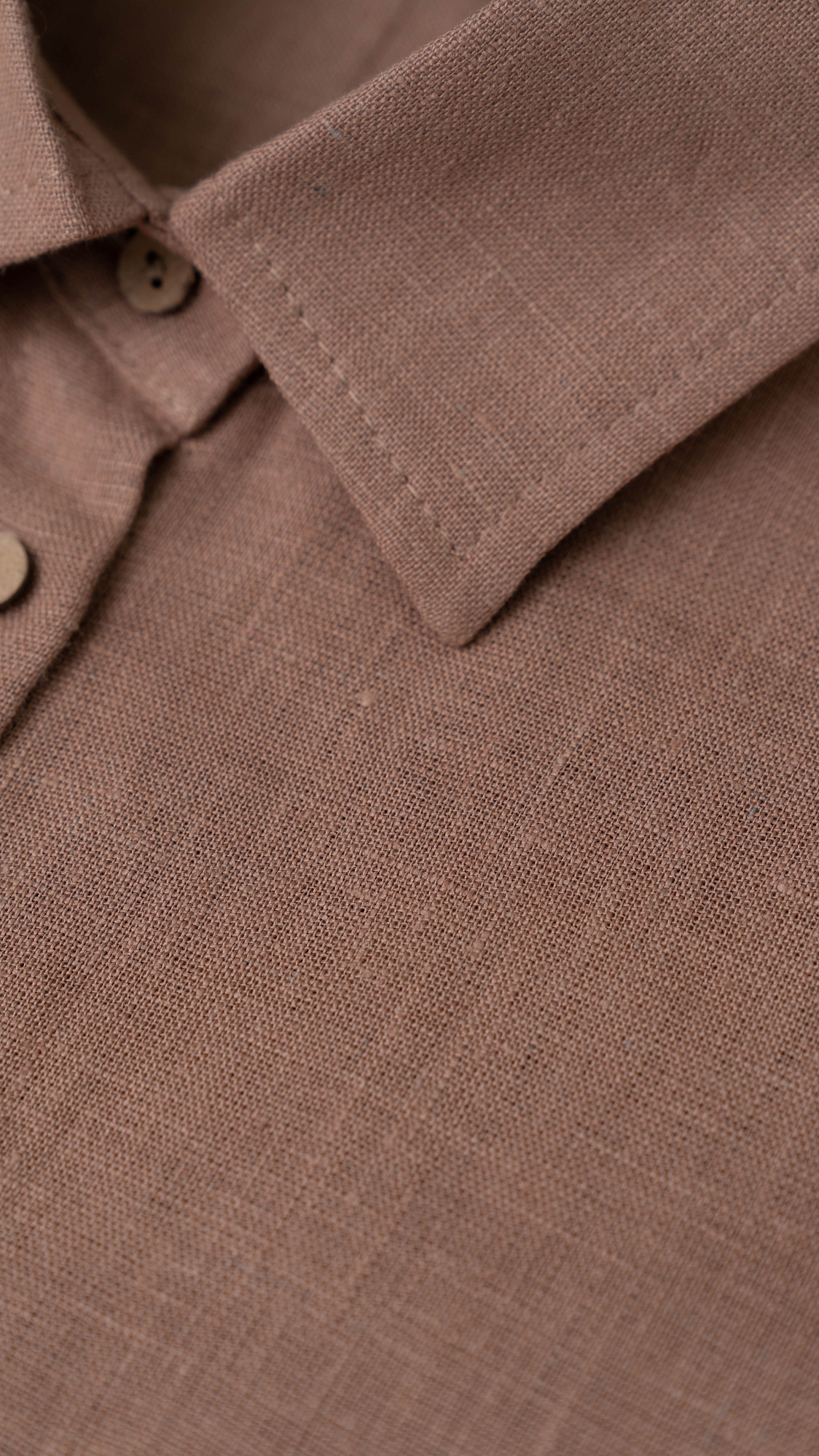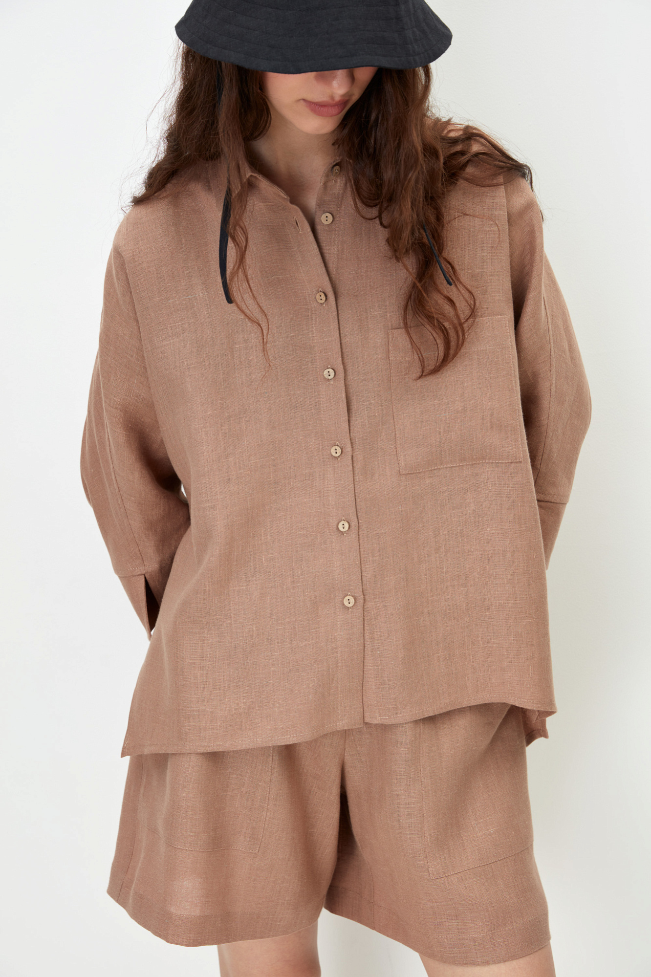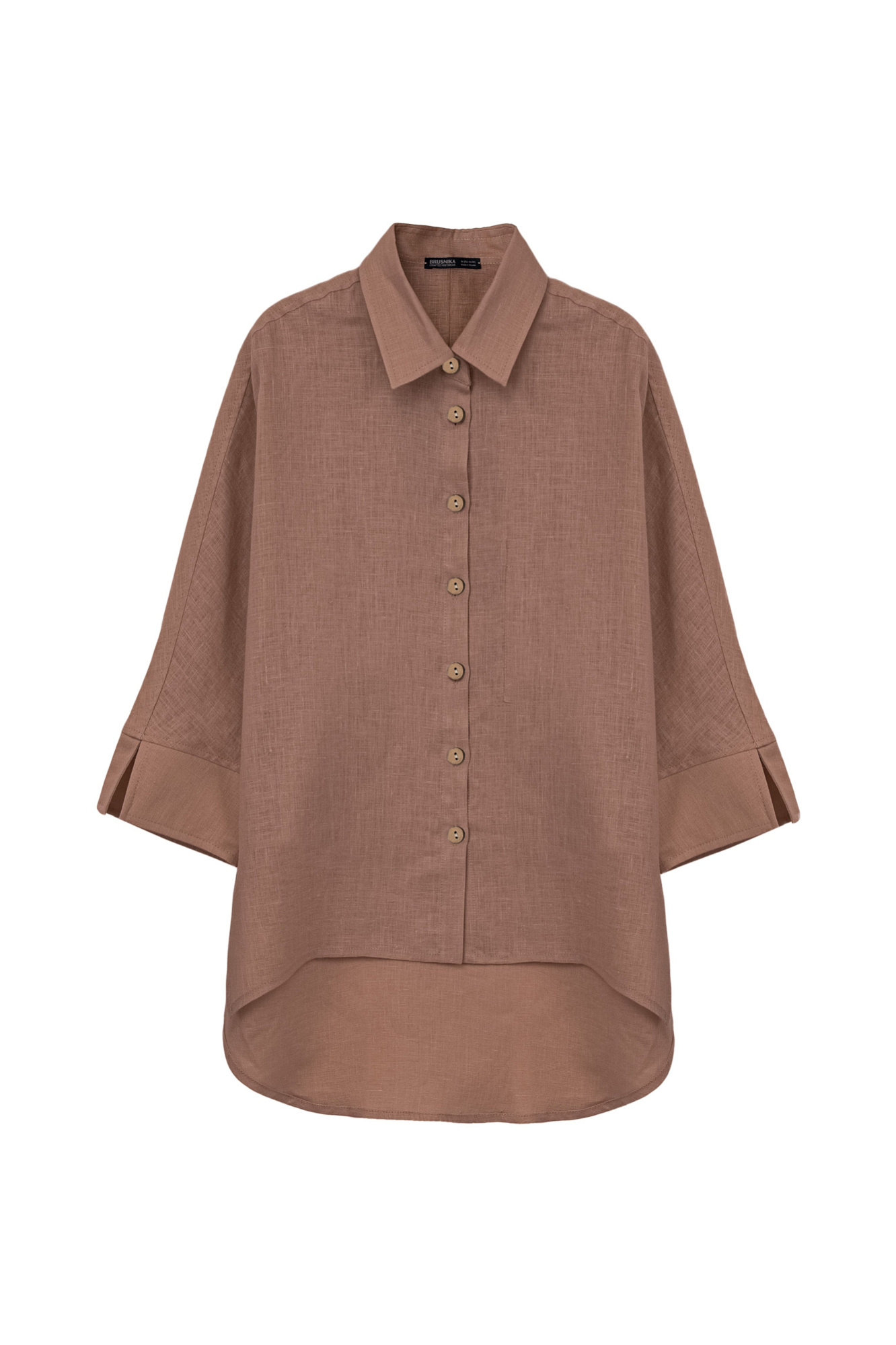 Рубашка из 100% льна с удлиненной спинкой. Модель свободного силуэта с разрезами на манжетах и по бокам. Накладной карман на груди.