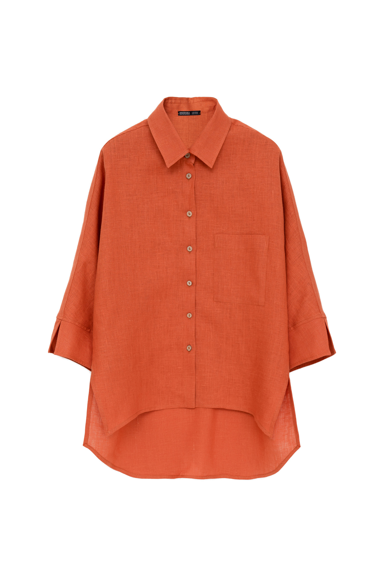Рубашка из 100% льна с удлиненной спинкой. Модель свободного силуэта с разрезами на манжетах и по бокам. Накладной карман на груди.