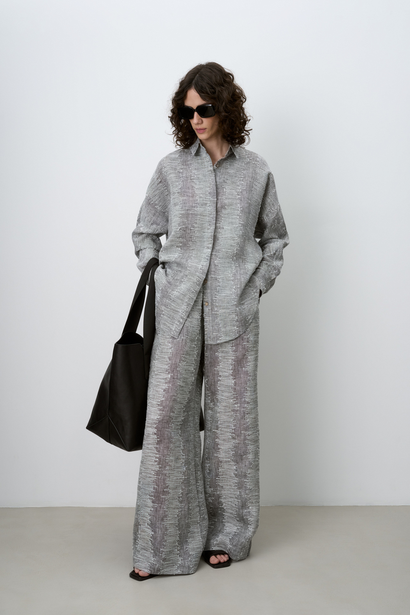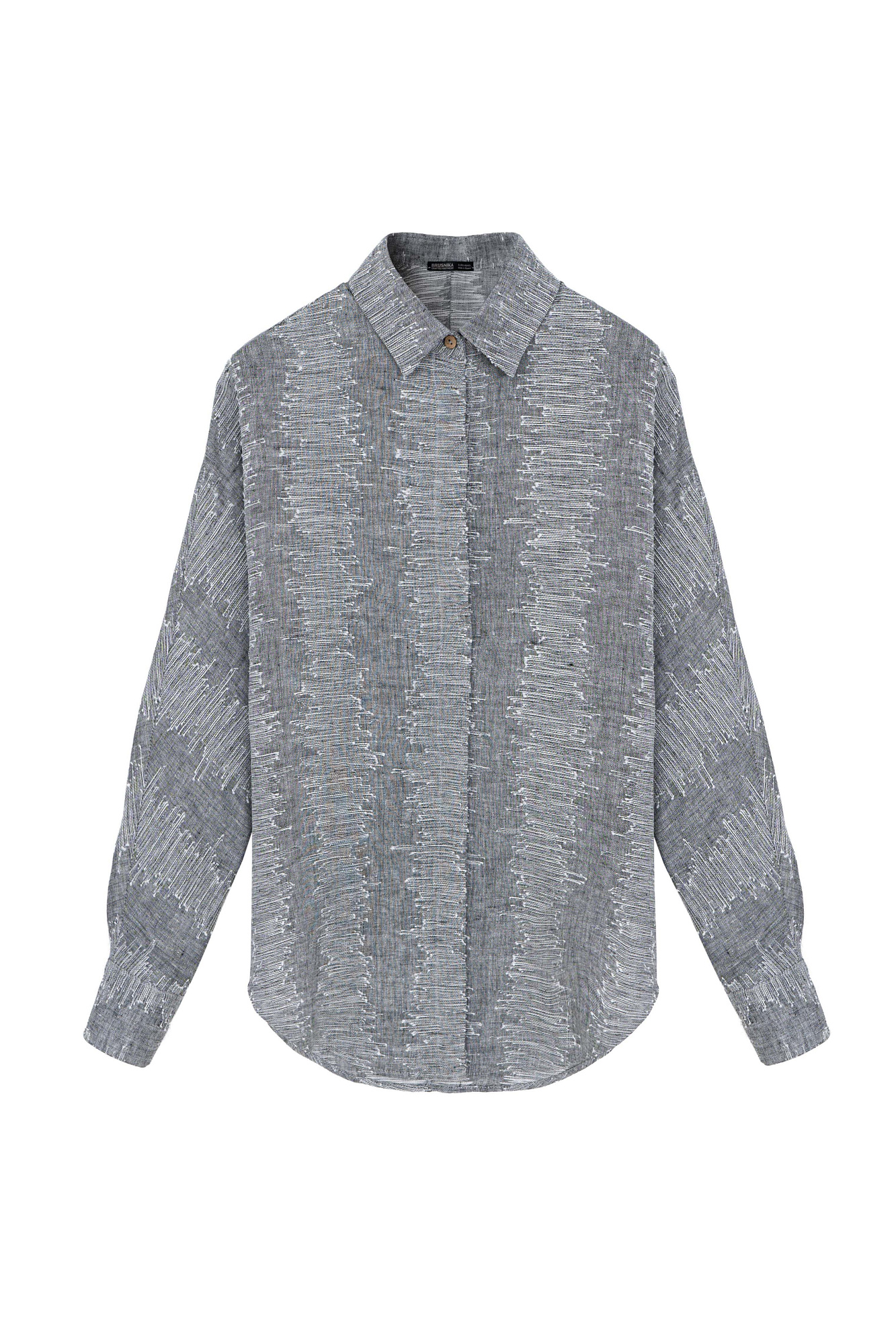 Рубашка из 100% льна с супатной застежкой на пуговицы. Модель свободного силуэта, с классическим отложным воротником и длинными рукавами.