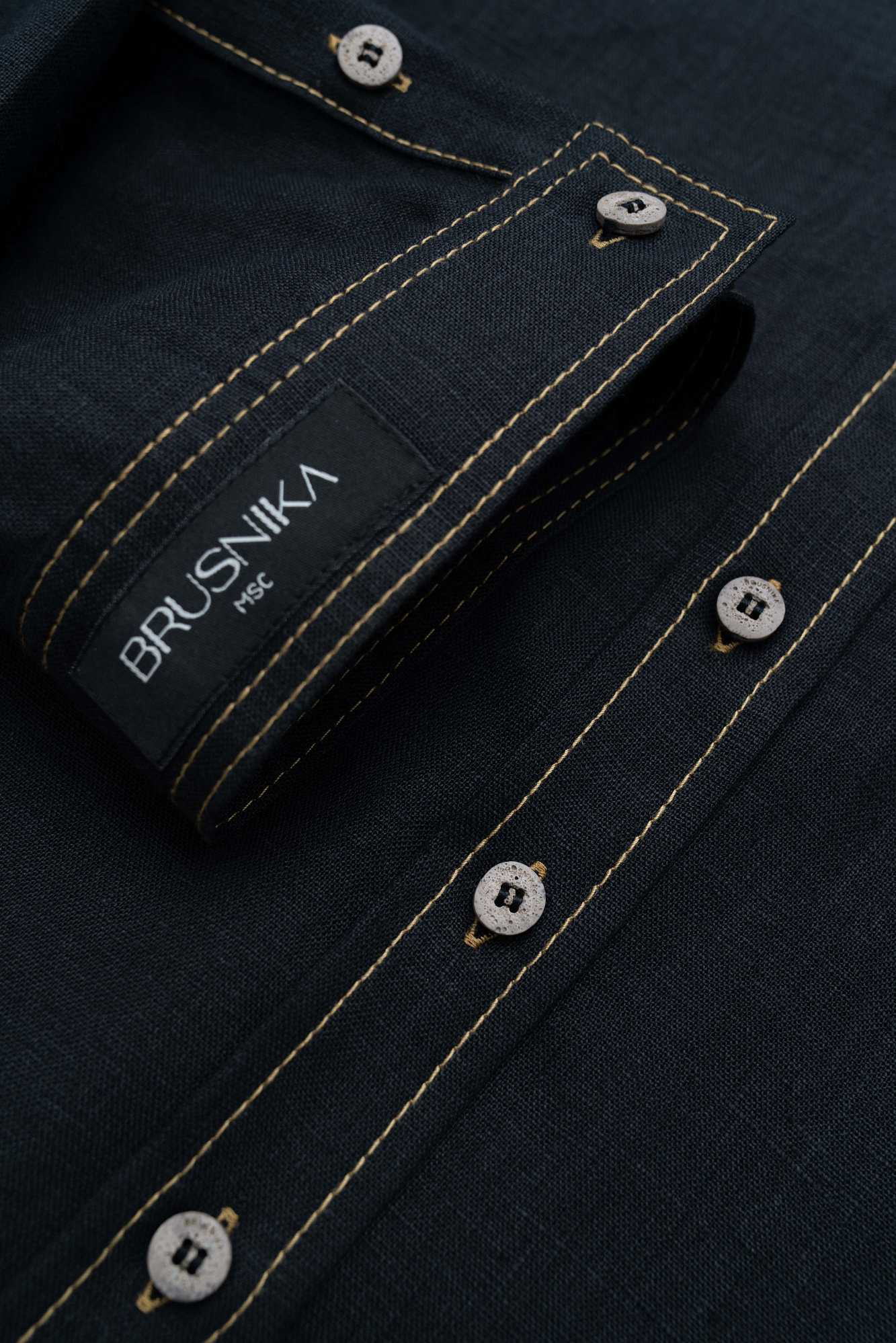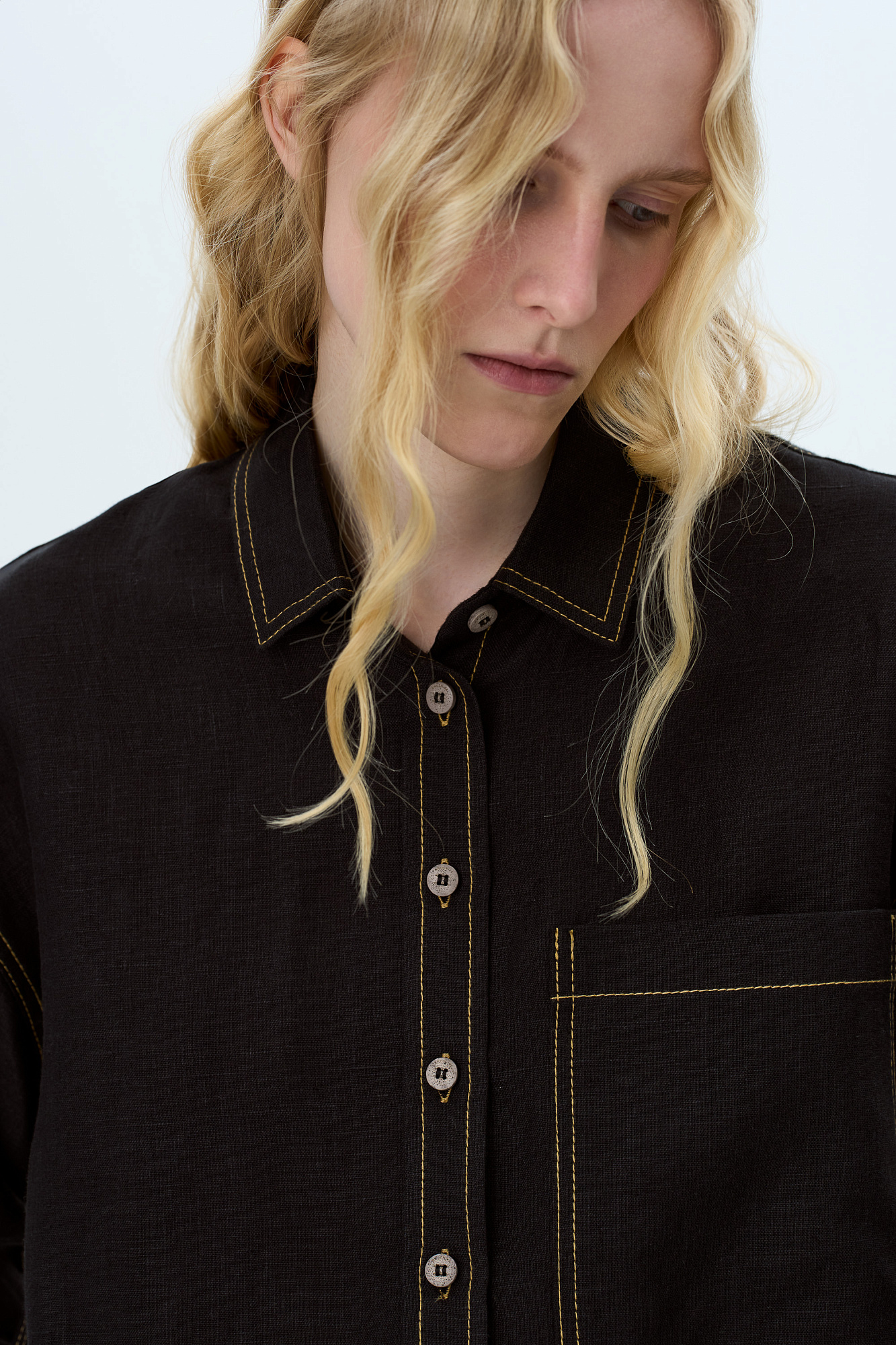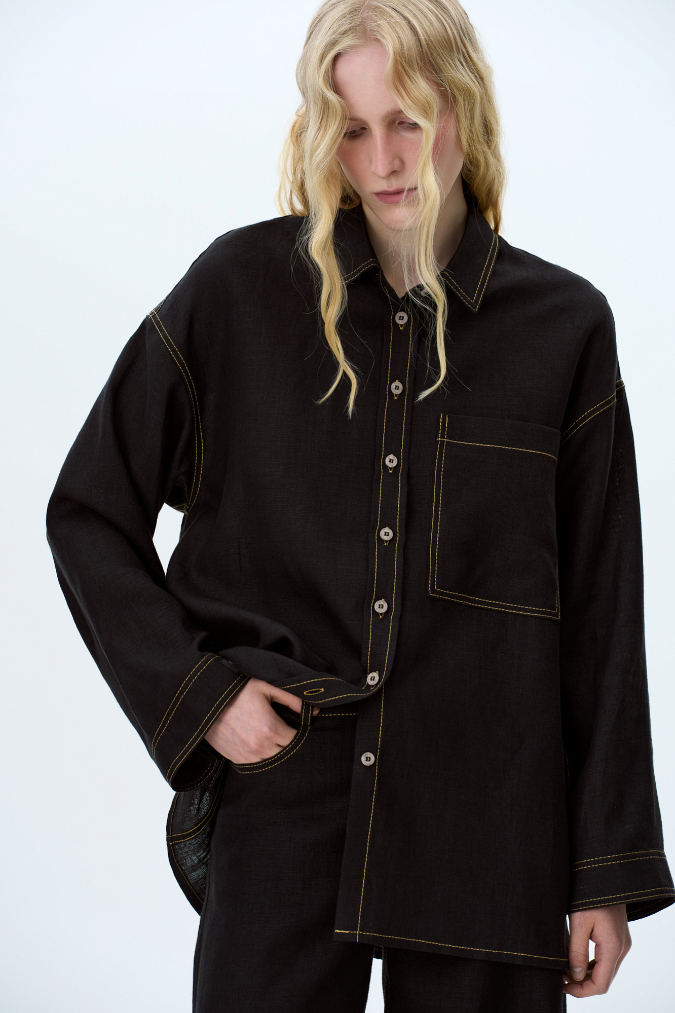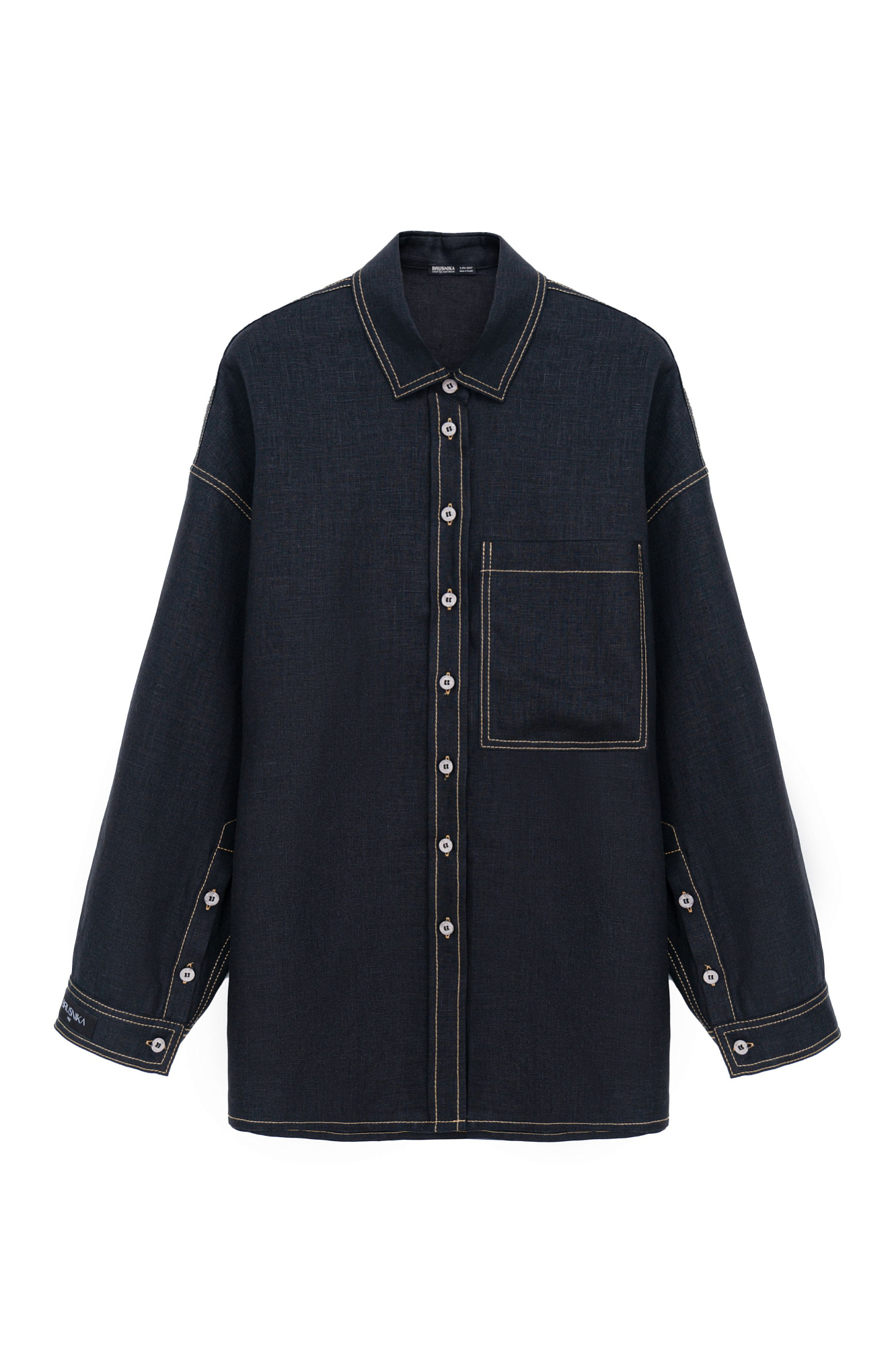 Льняная рубашка с накладным карманом на груди. Модель свободного силуэта с классическим отложным воротником, спущенной линией плеч и большим нагрудным карманом. Застежка на пуговицы. Изделие декорировано брендированным ярлыком на рукаве и пуговицами на манжетах рукавов.