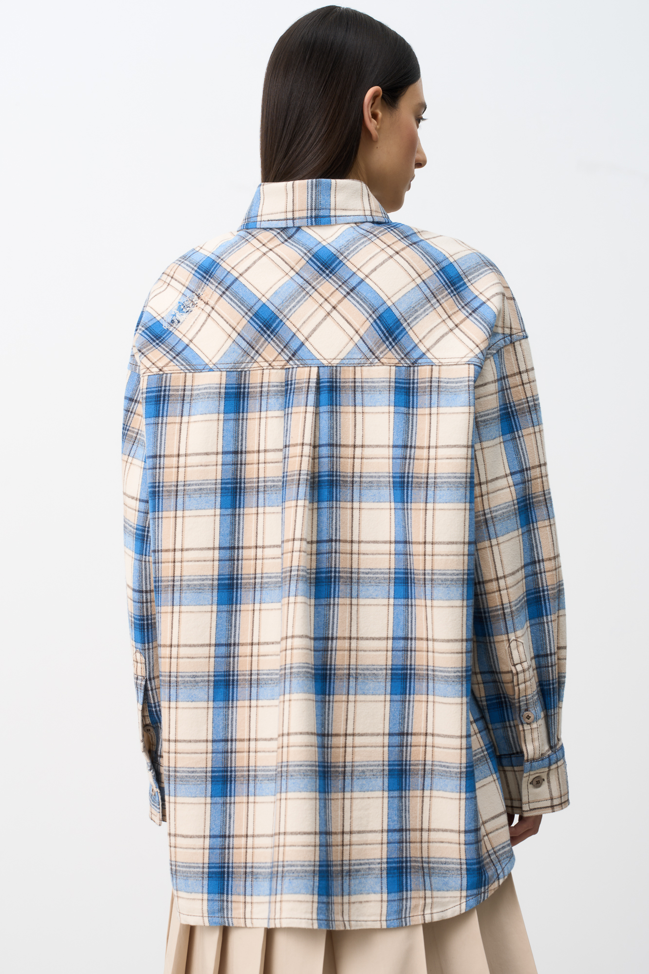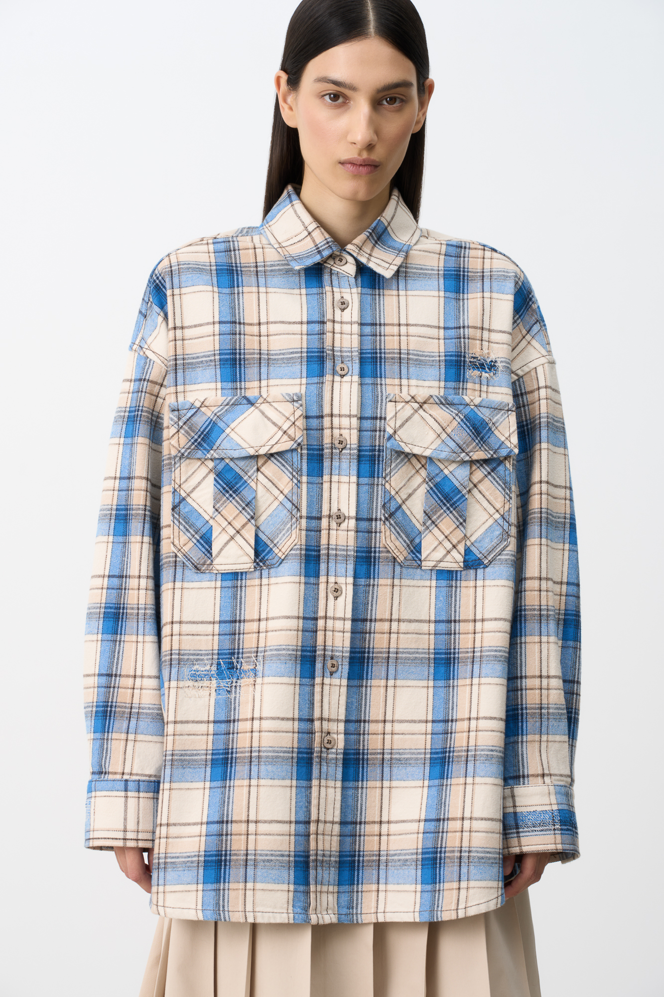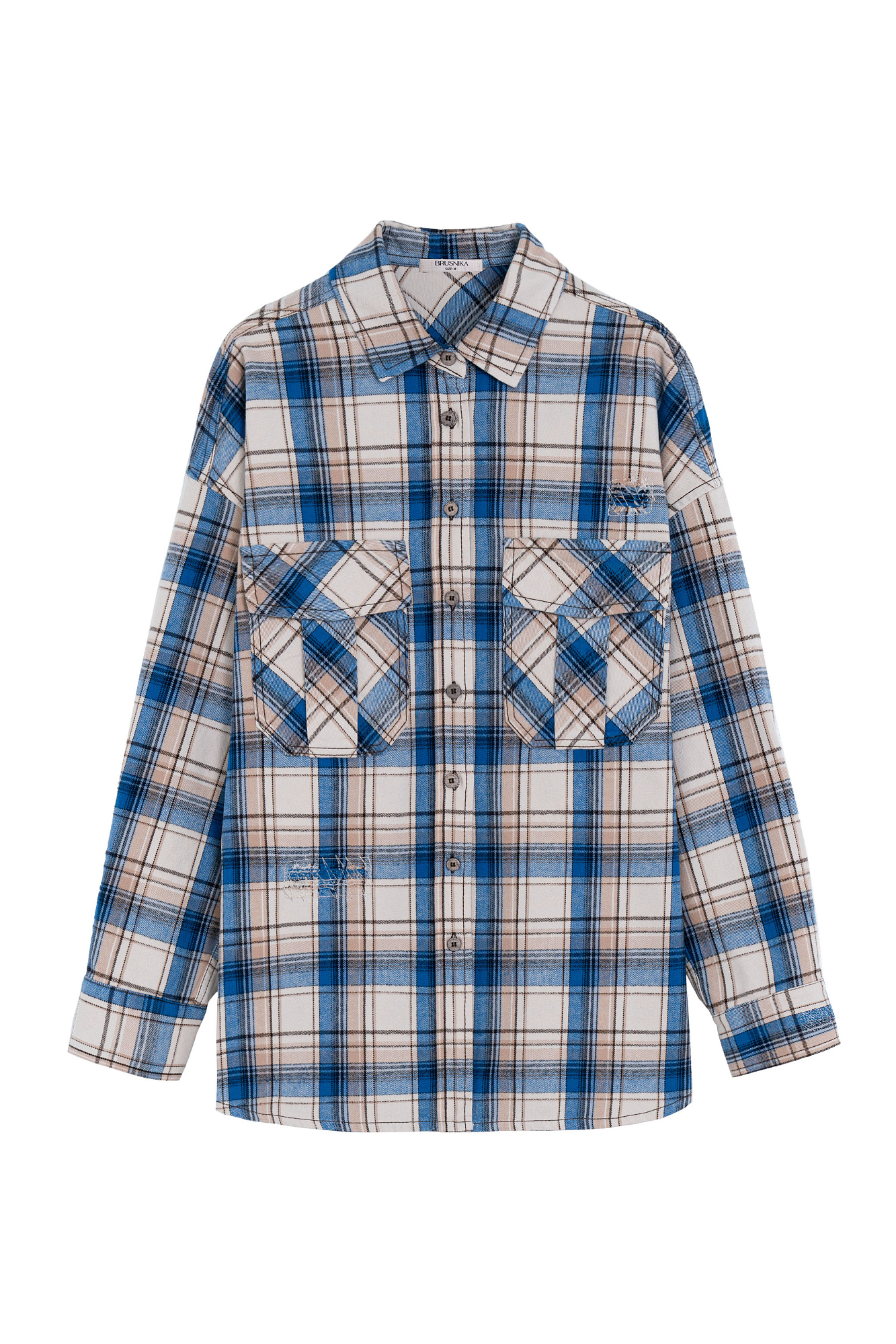 Рубашка в клетку с накладными карманами на груди. Модель свободного силуэта со спущенной линией плеча.