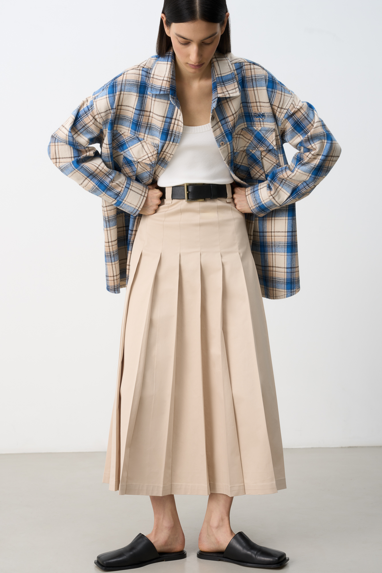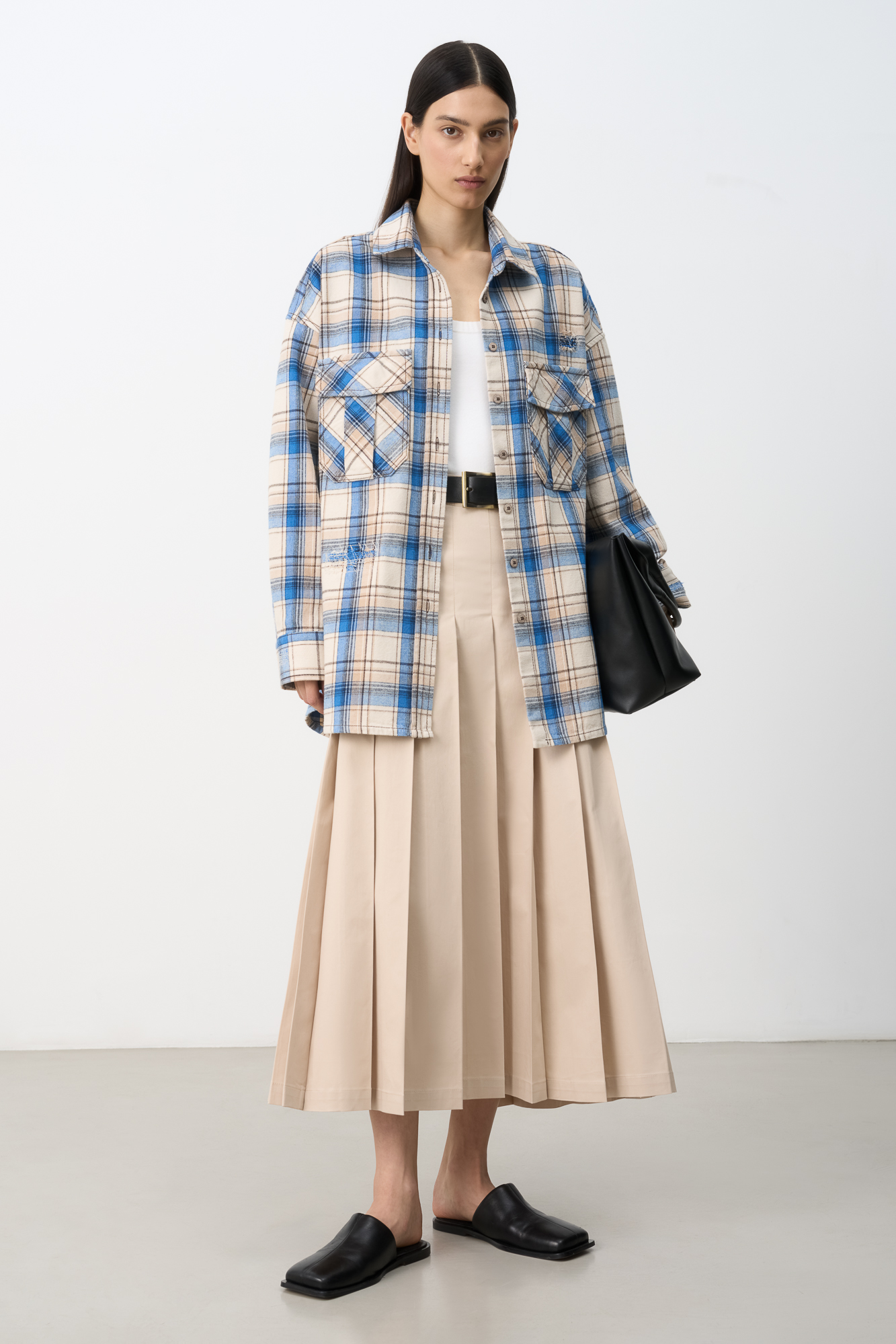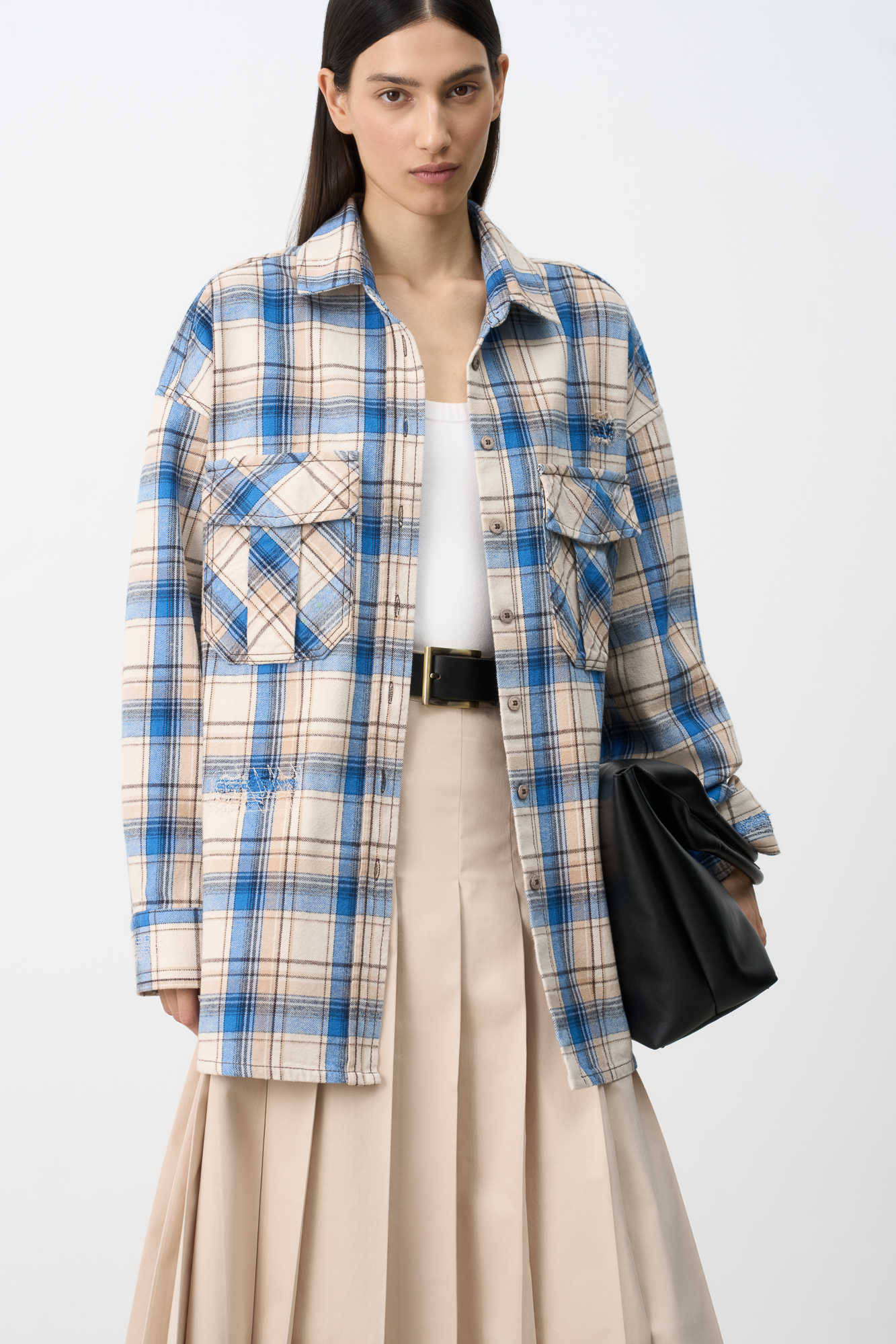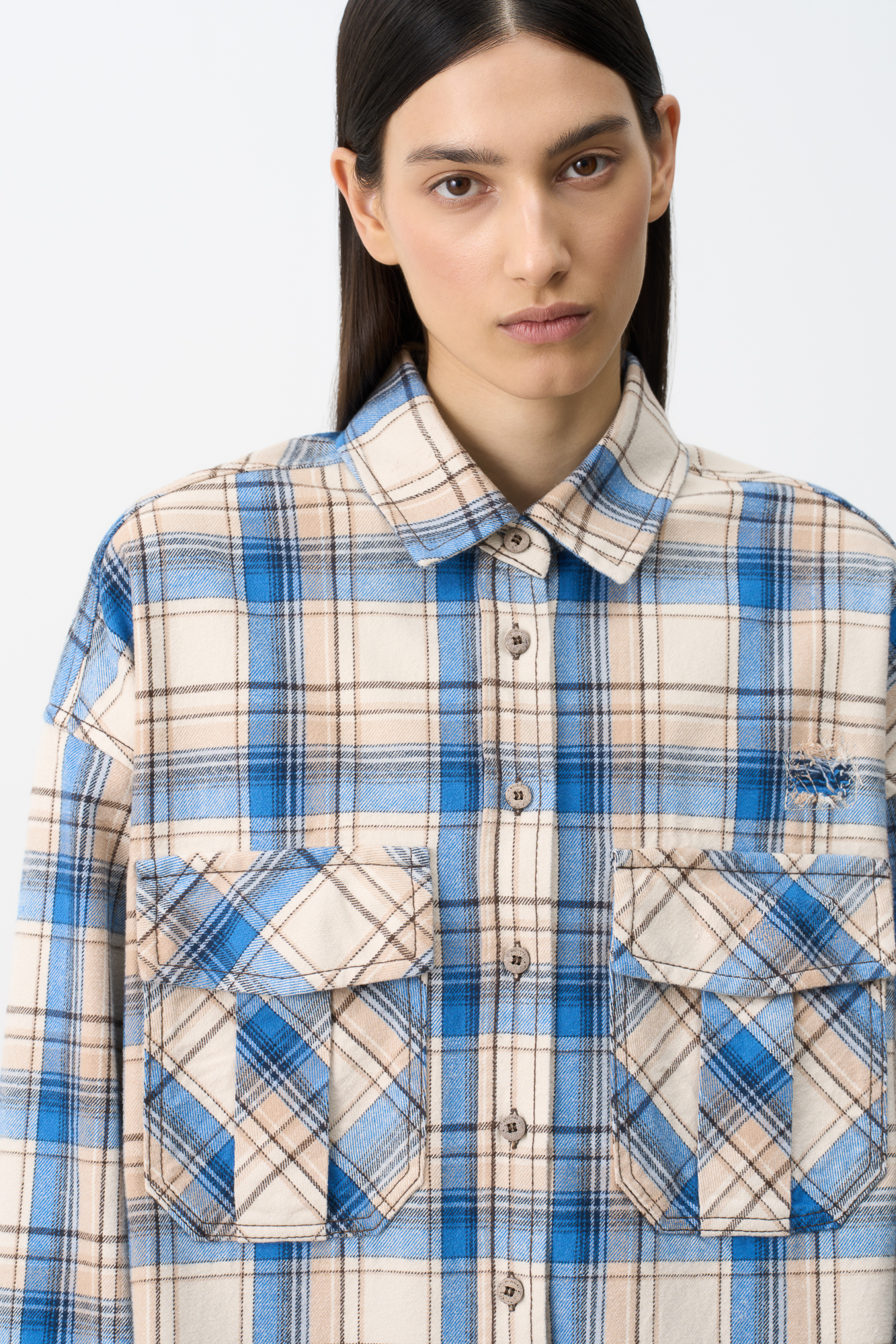 Рубашка в клетку с накладными карманами на груди. Модель свободного силуэта со спущенной линией плеча.