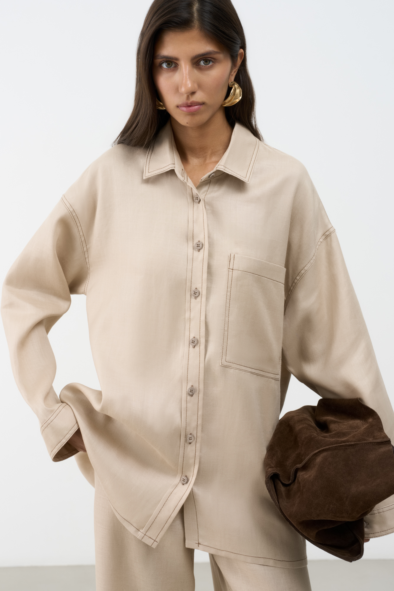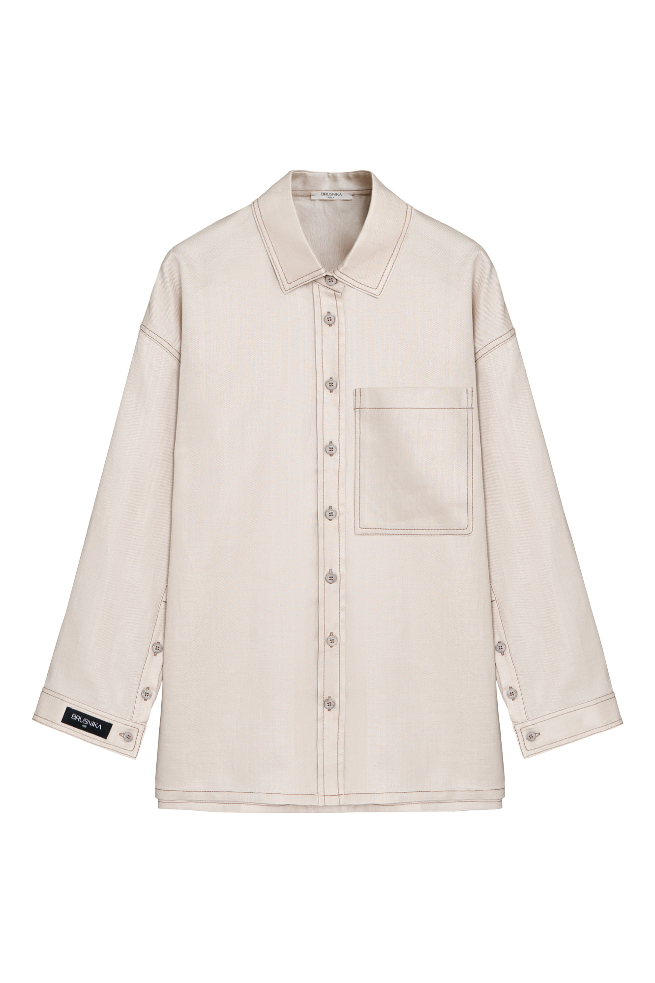 Льняная рубашка с накладным карманом на груди и брендированным ярлыком. Модель свободного силуэта со спущенной линией плеча. Манжеты на пуговицах.