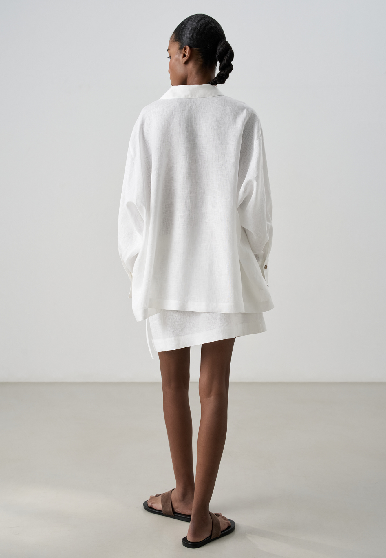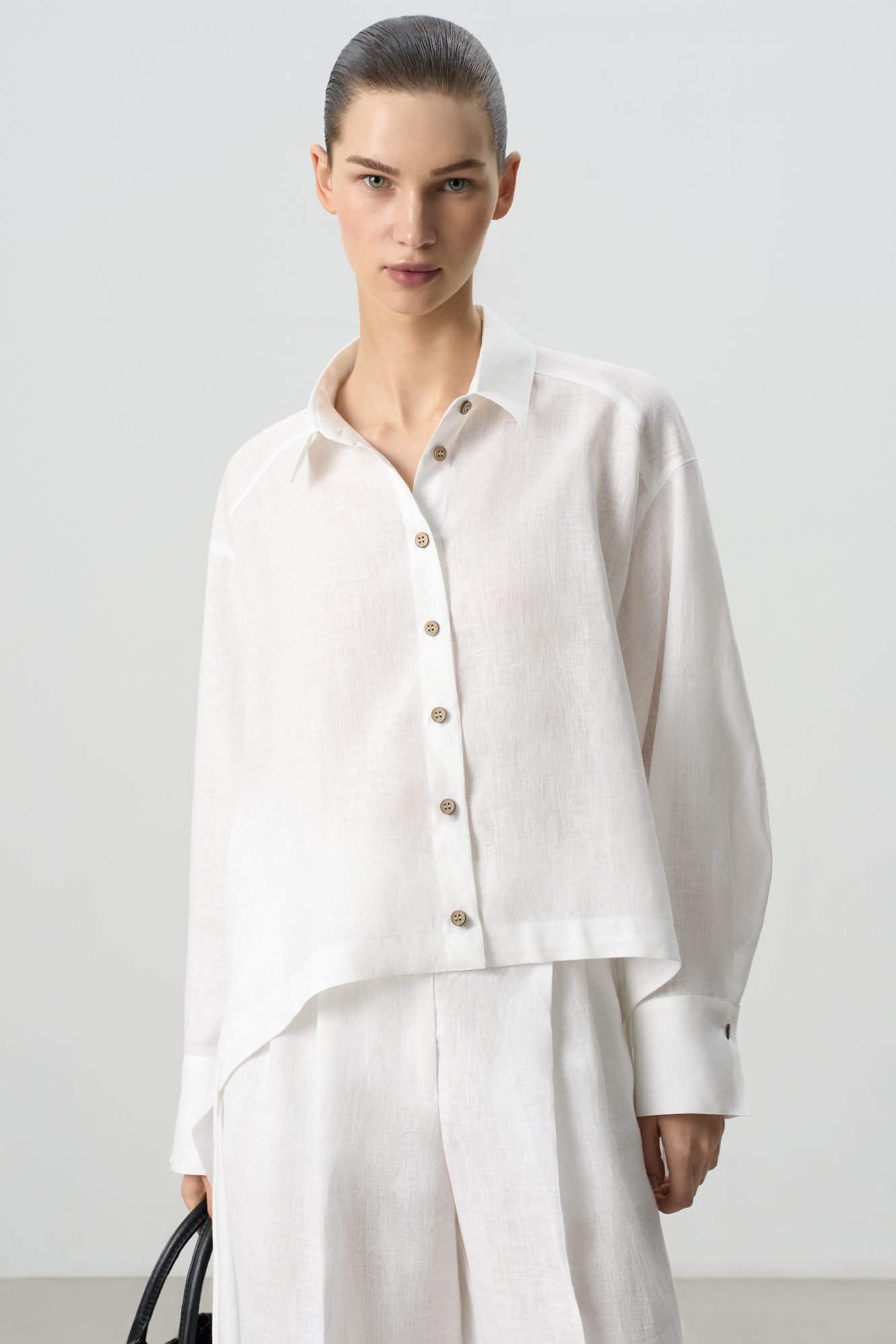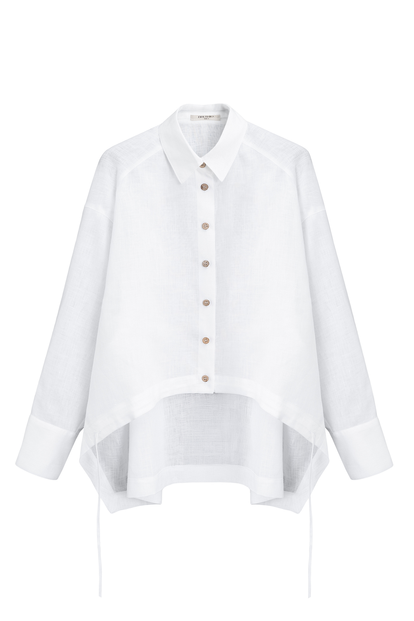 Рубашка из 100% льна. Модель прямого кроя, с длинными рукавами, отложным воротникомна и регулируемой кулиской по низу. Застежка на пуговицы.