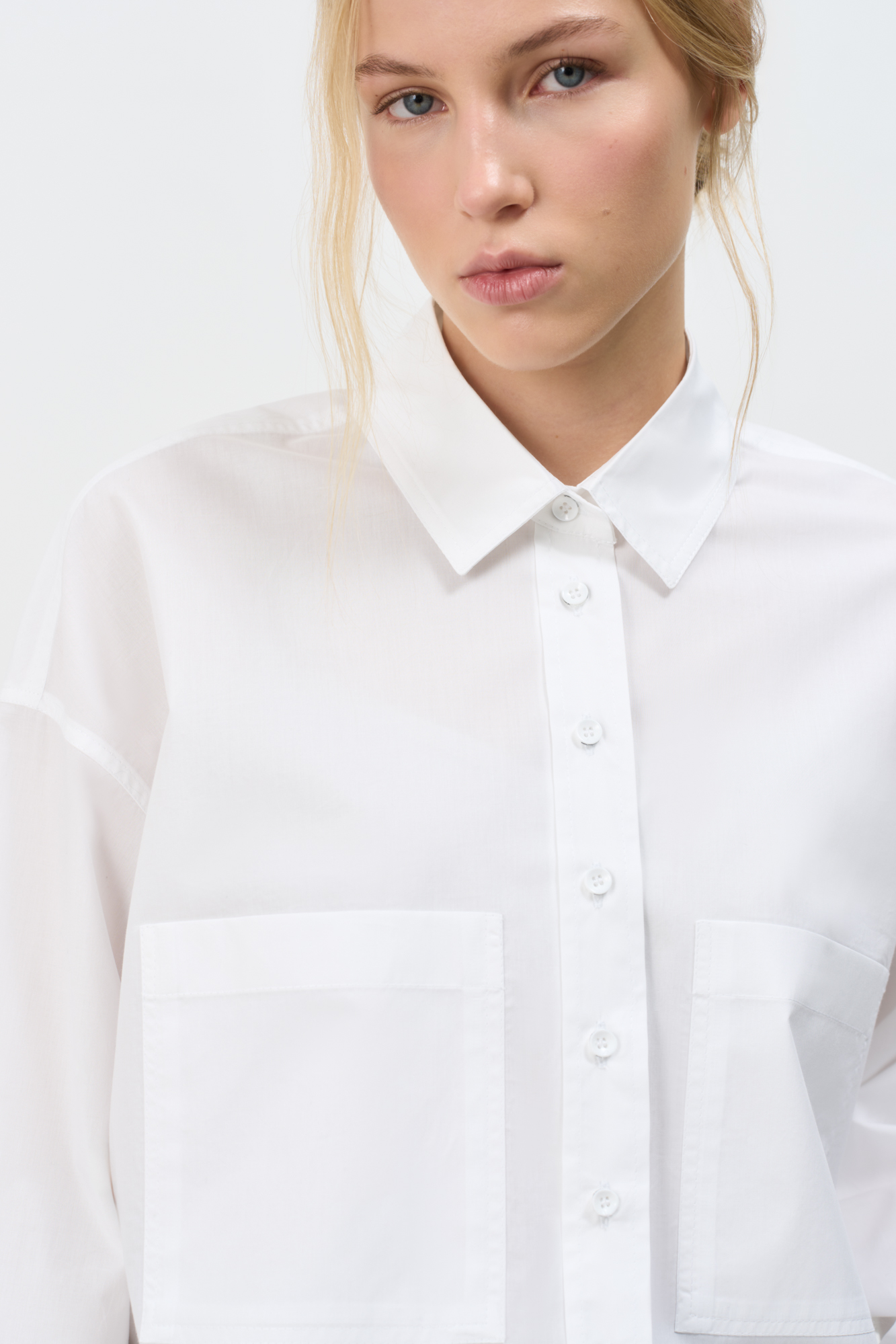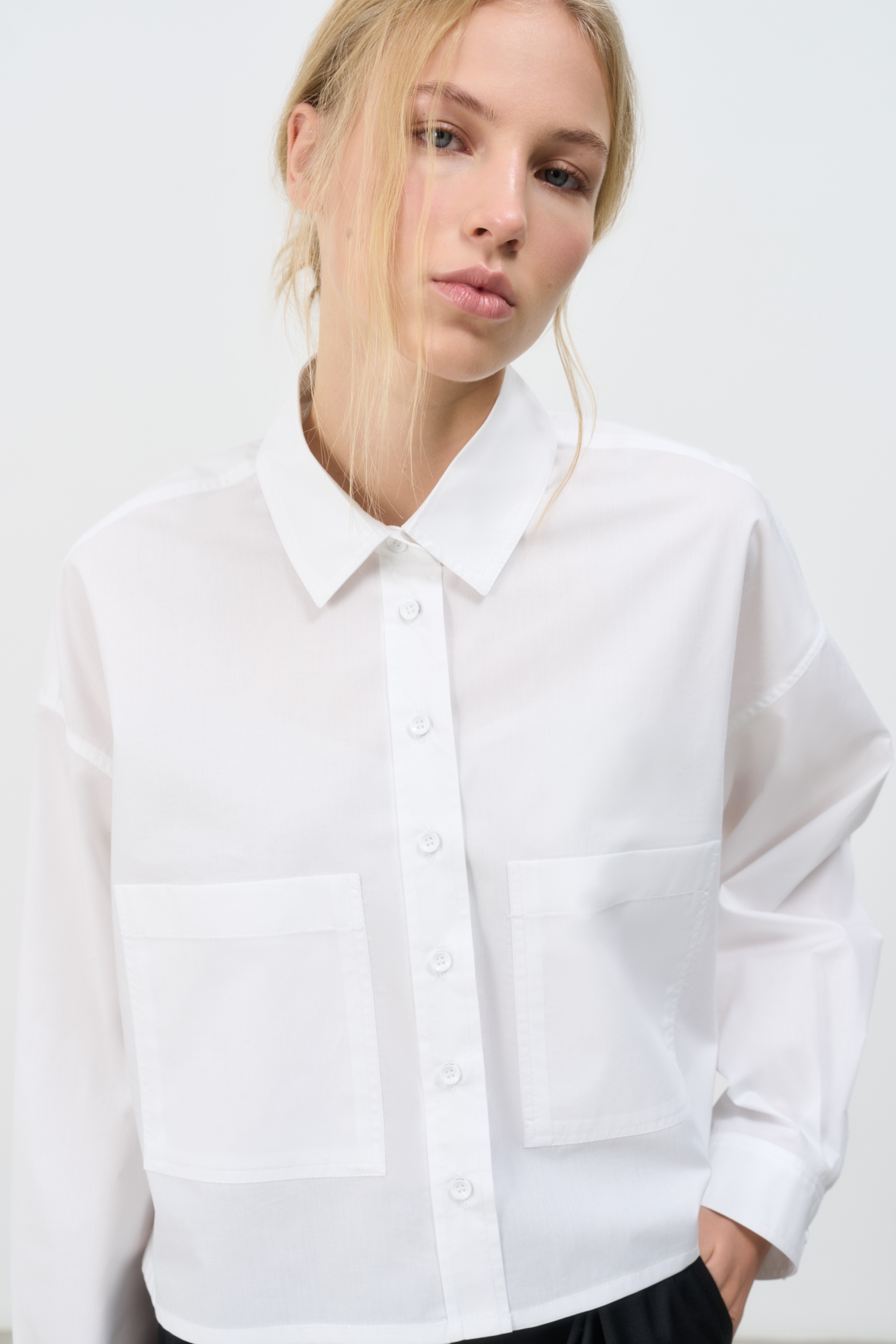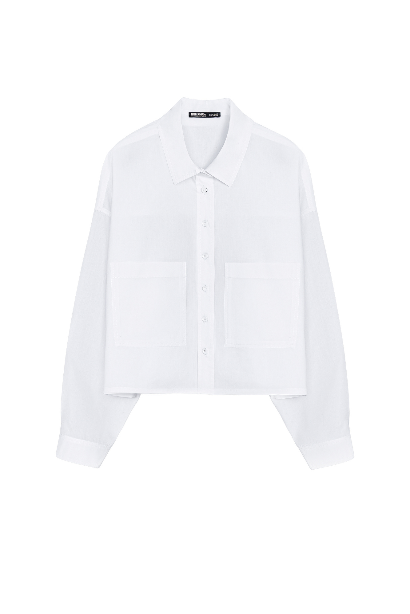 Укороченная рубашка с накладными карманами. Модель свободного силуэта со спущенной линией плеча. Застежка на пуговицы.