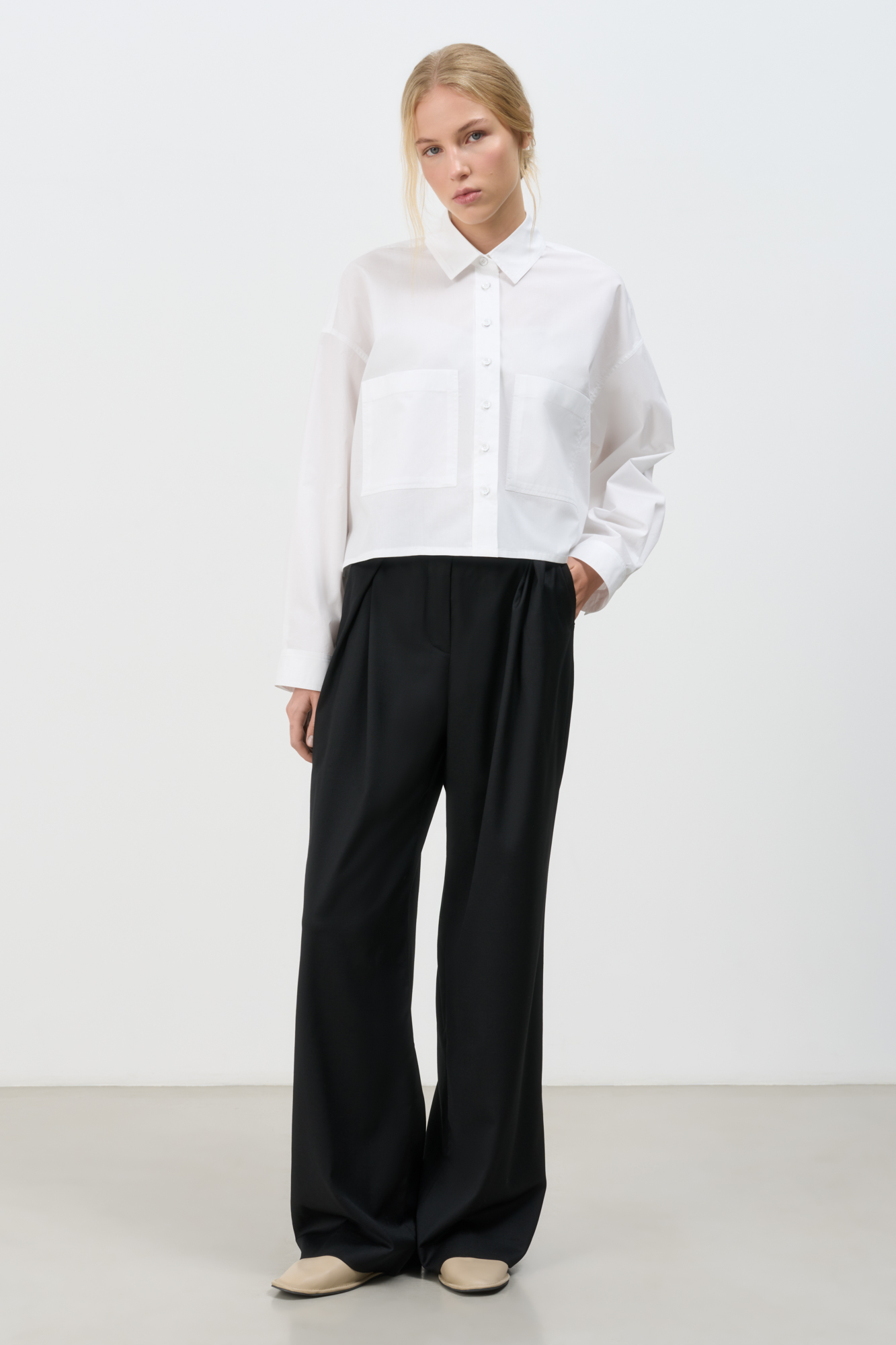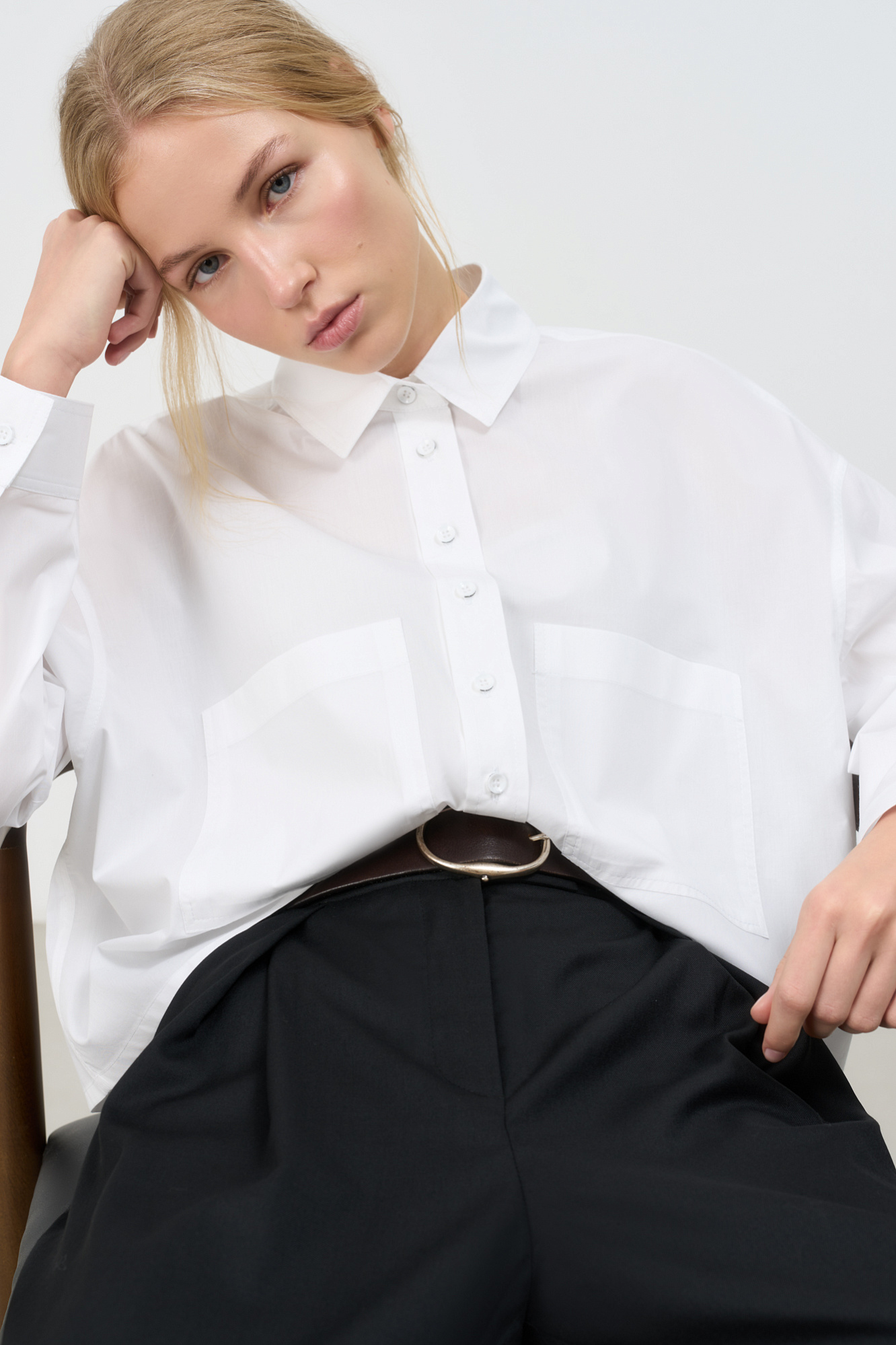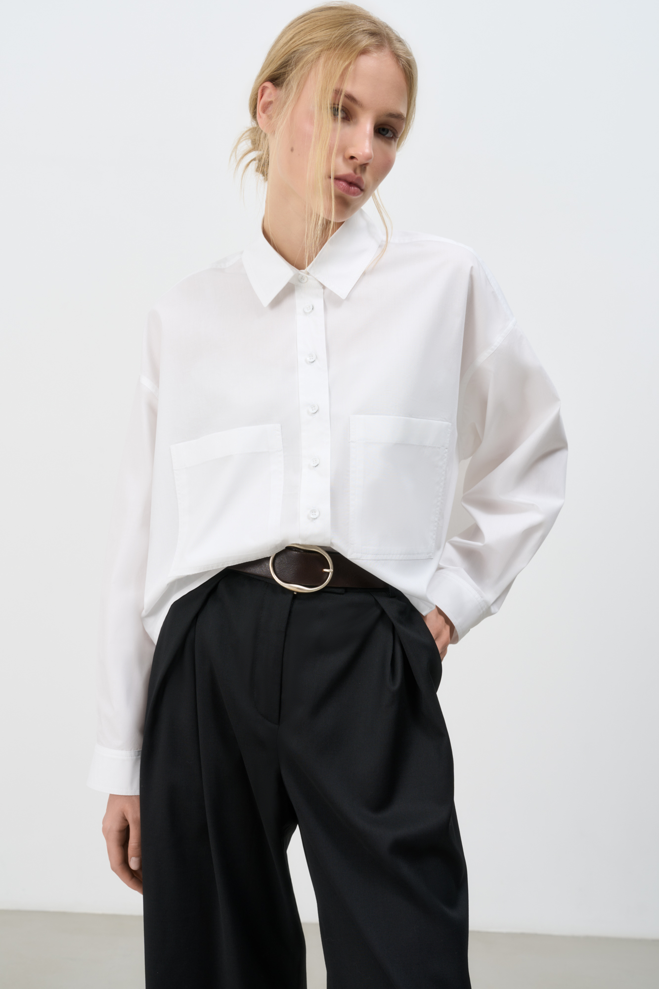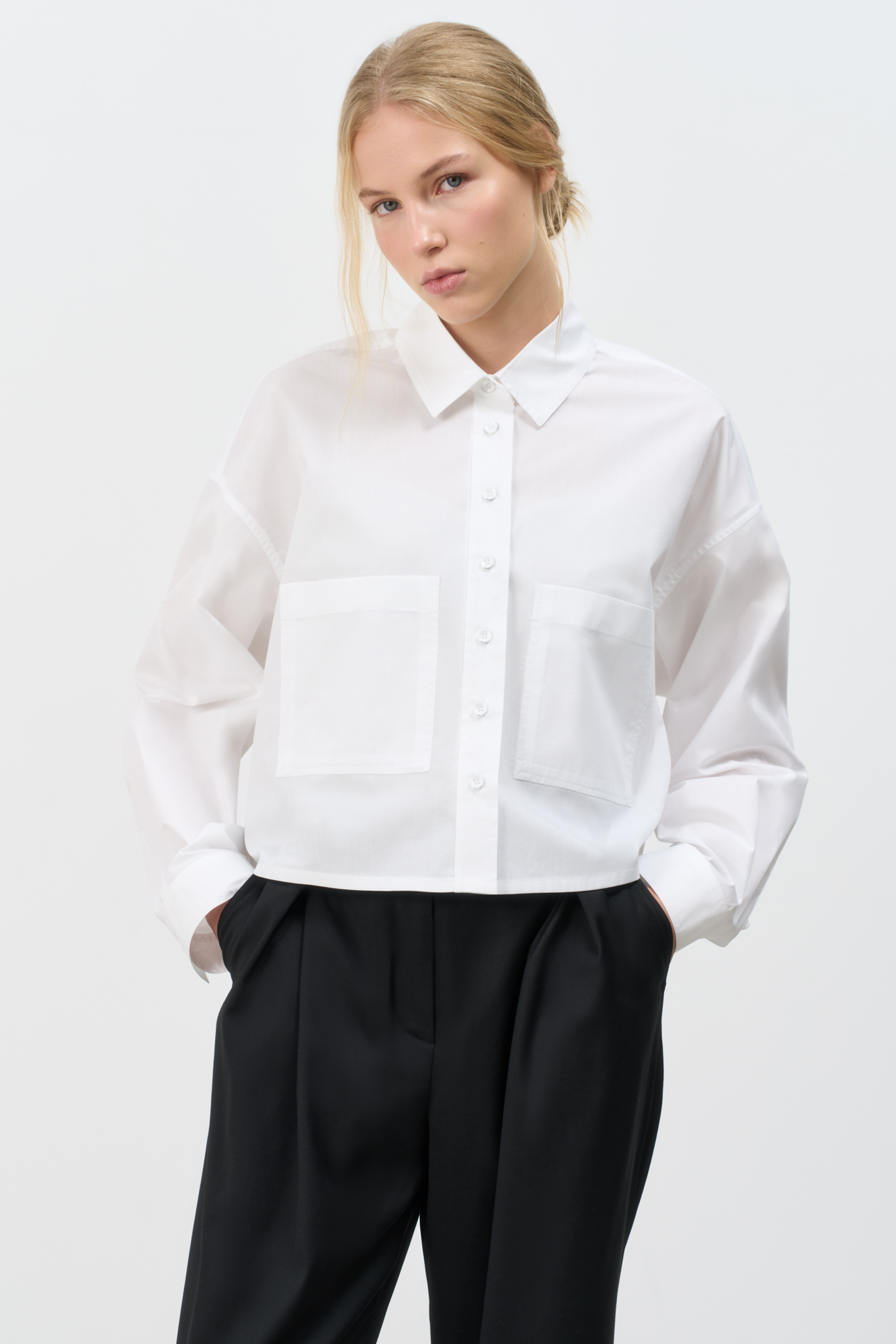 Укороченная рубашка с накладными карманами. Модель свободного силуэта со спущенной линией плеча. Застежка на пуговицы.