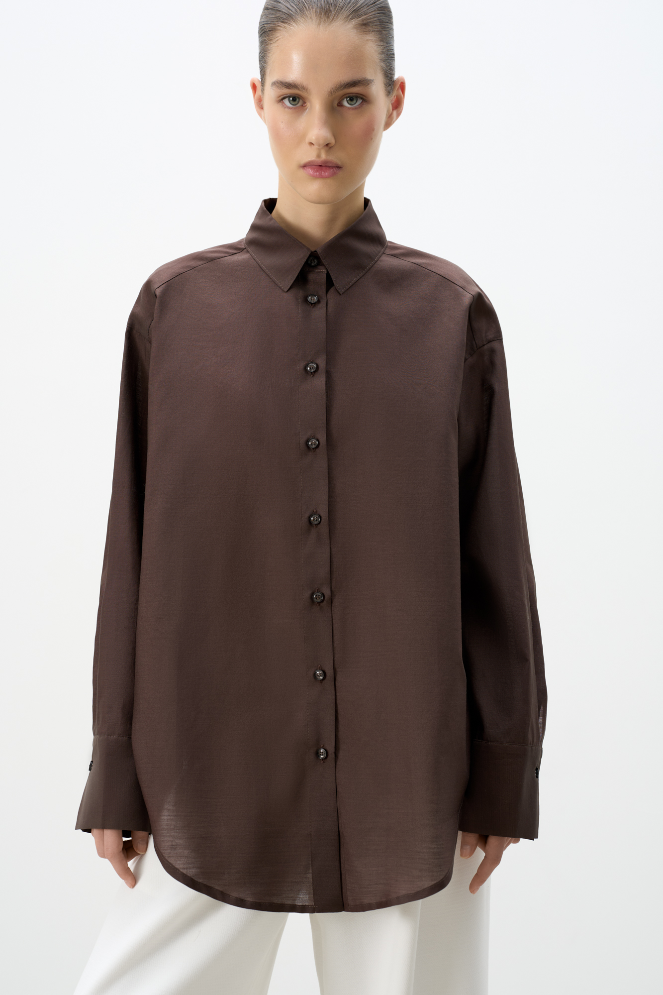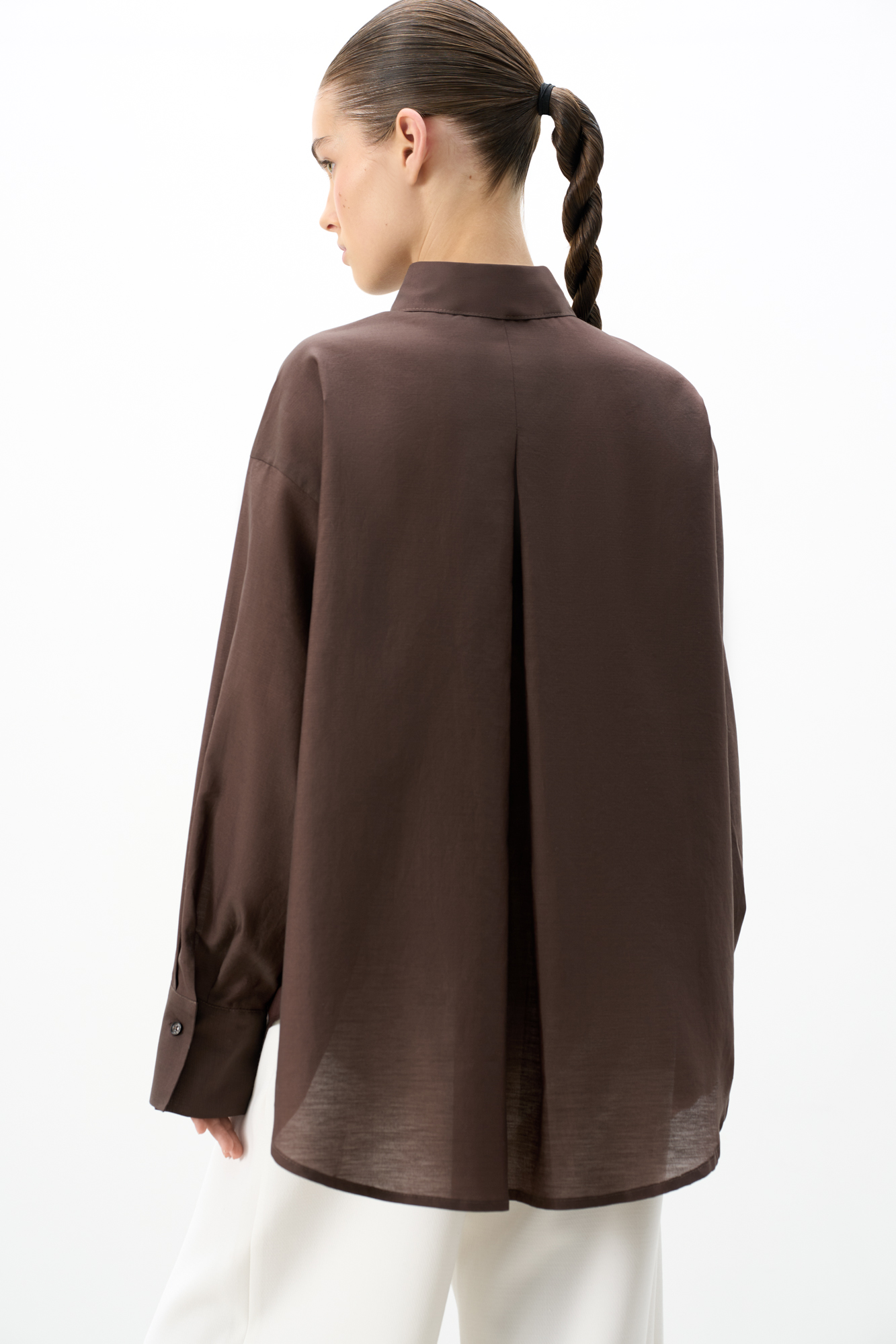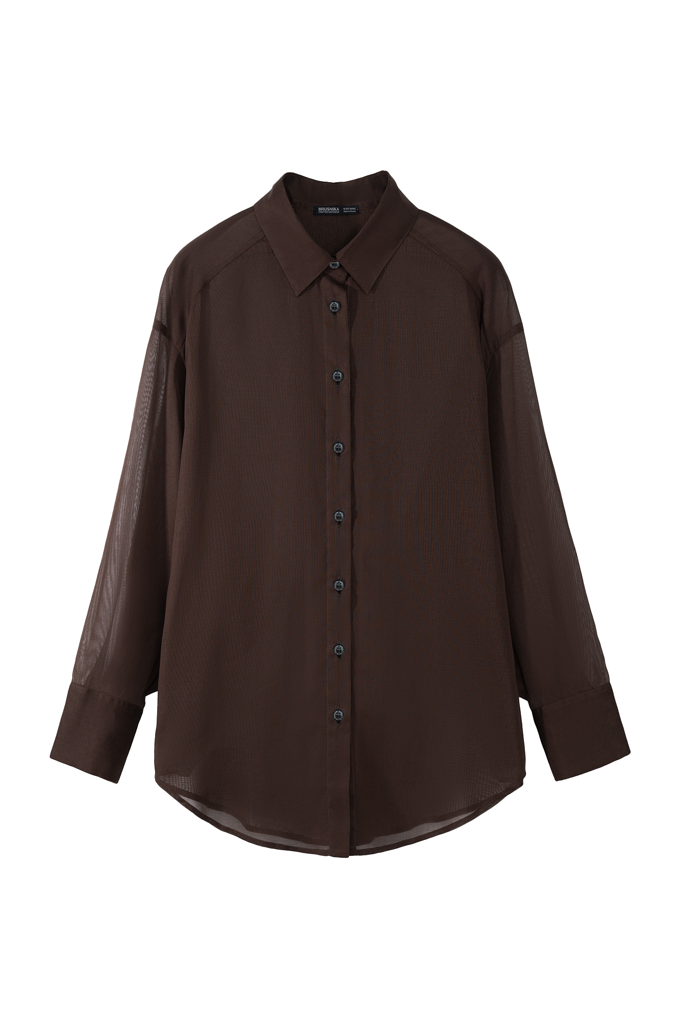 Классическая рубашка из тонкого шелка и хлопка. Модель свободного кроя, с отложным воротником, длинными рукавами с манжетами на пуговицах. Нижний край изделия выполнен полукругом. Застежка на пуговицы.