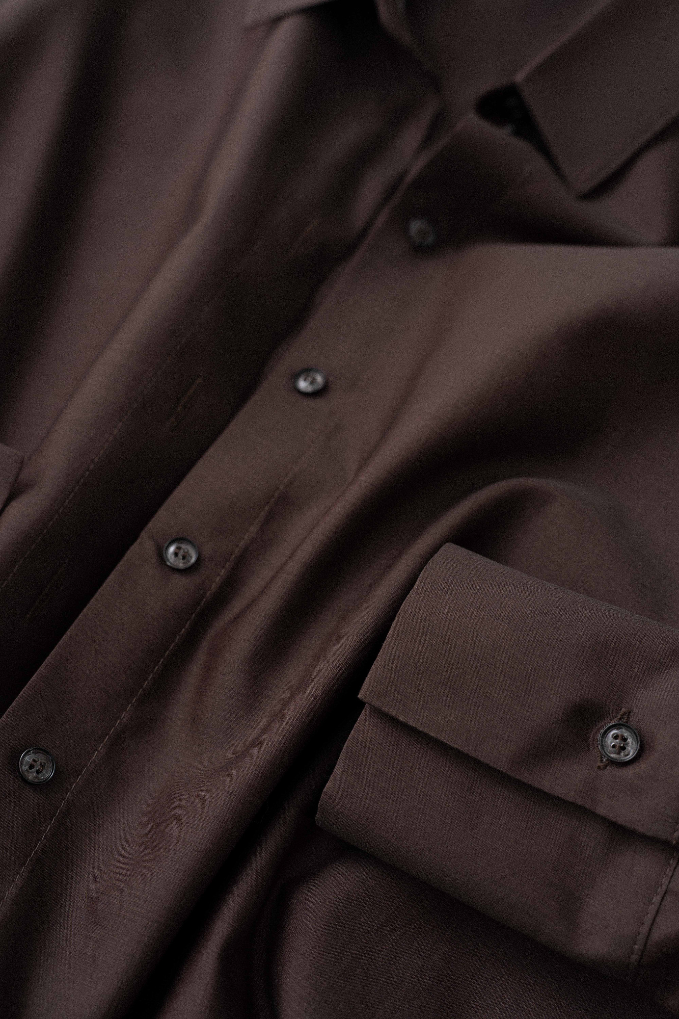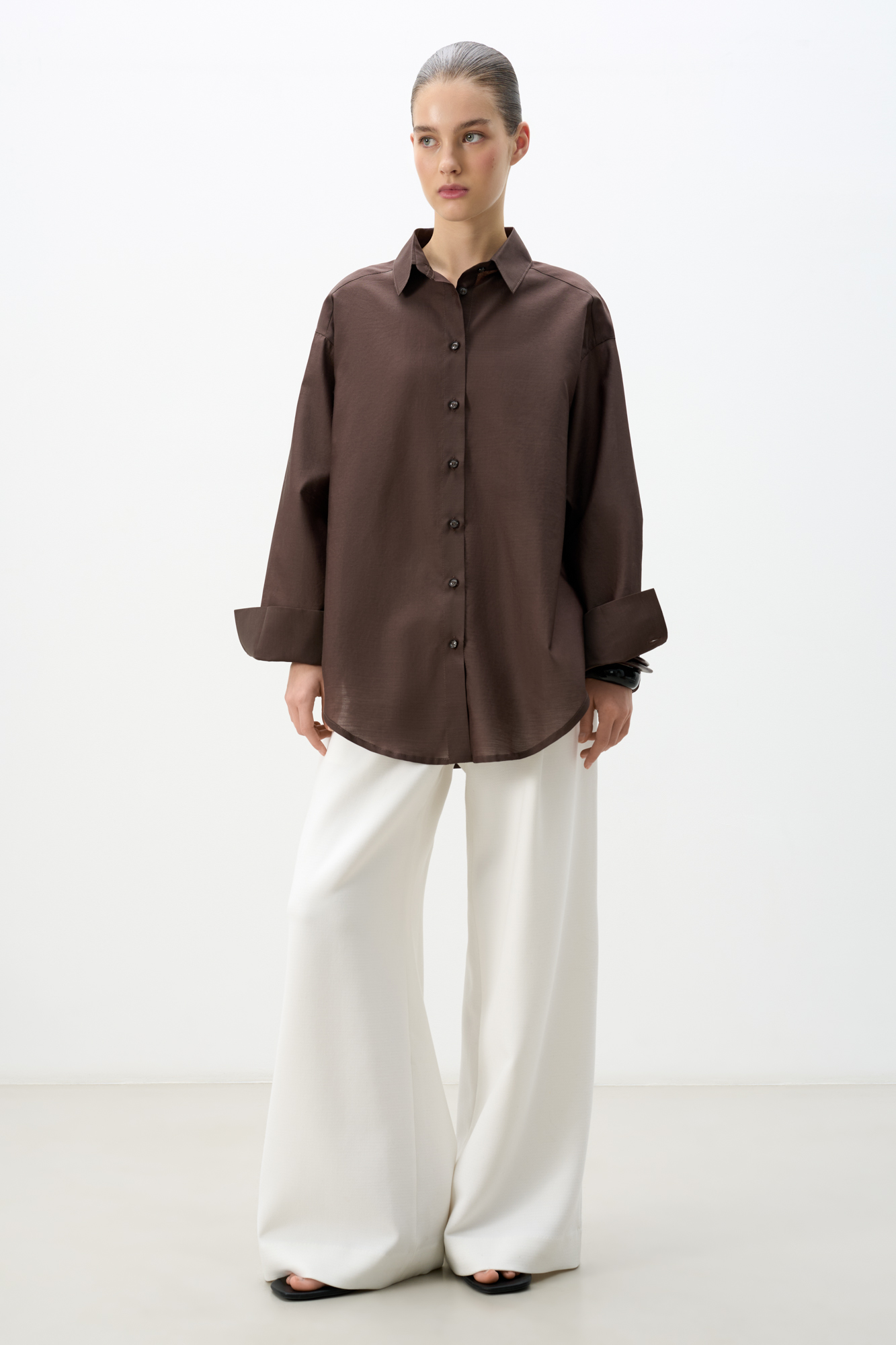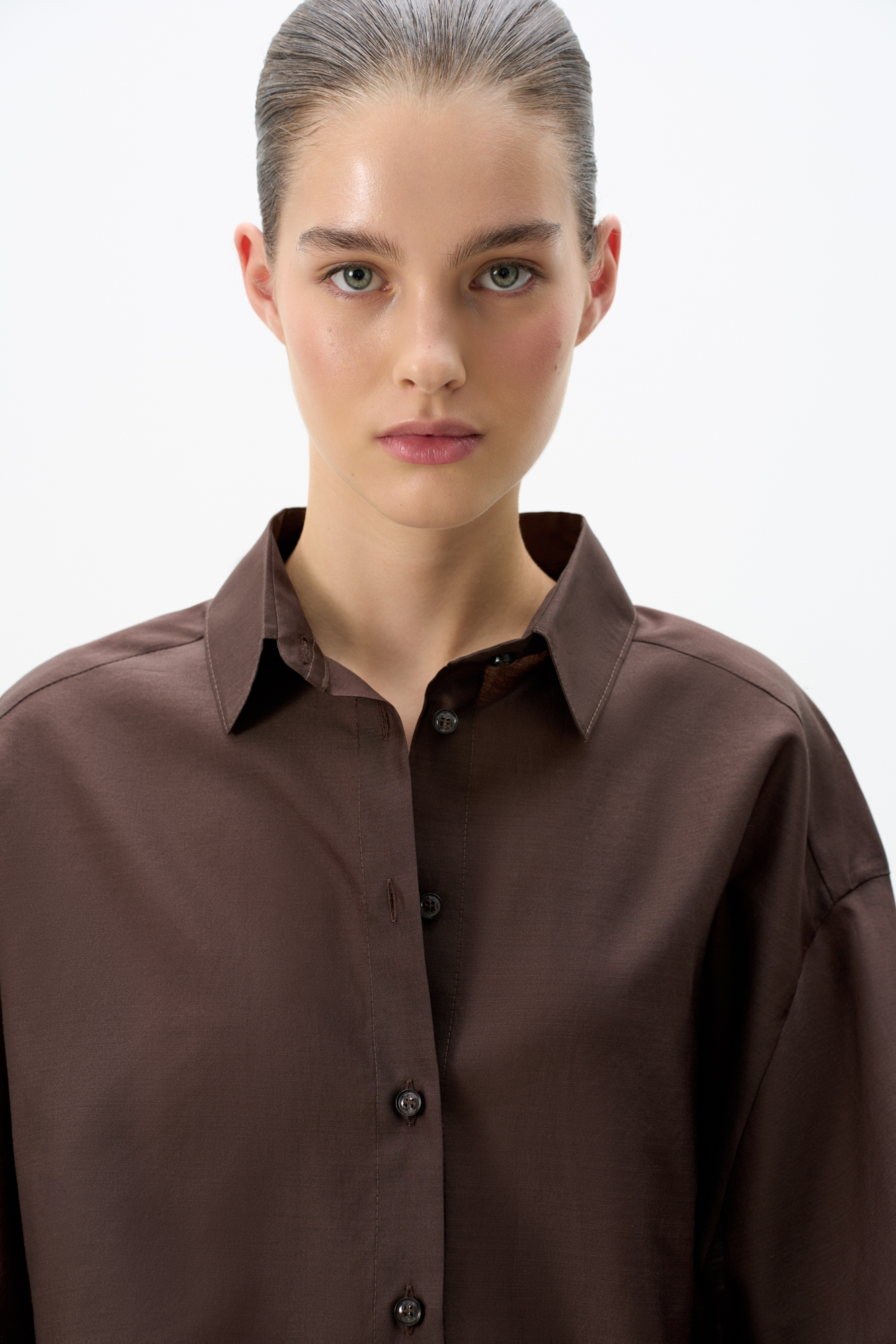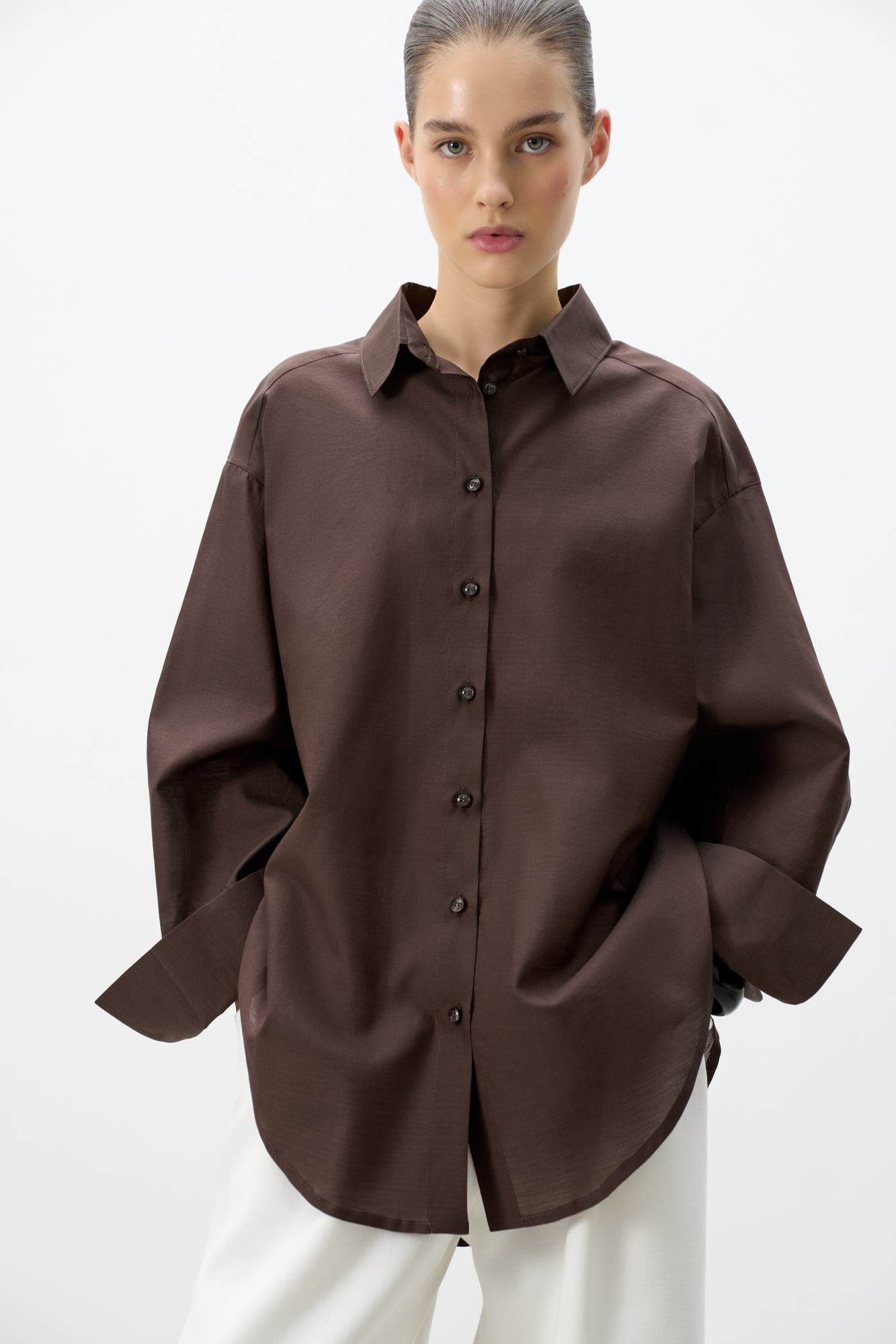 Классическая рубашка из тонкого шелка и хлопка. Модель свободного кроя, с отложным воротником, длинными рукавами с манжетами на пуговицах. Нижний край изделия выполнен полукругом. Застежка на пуговицы.