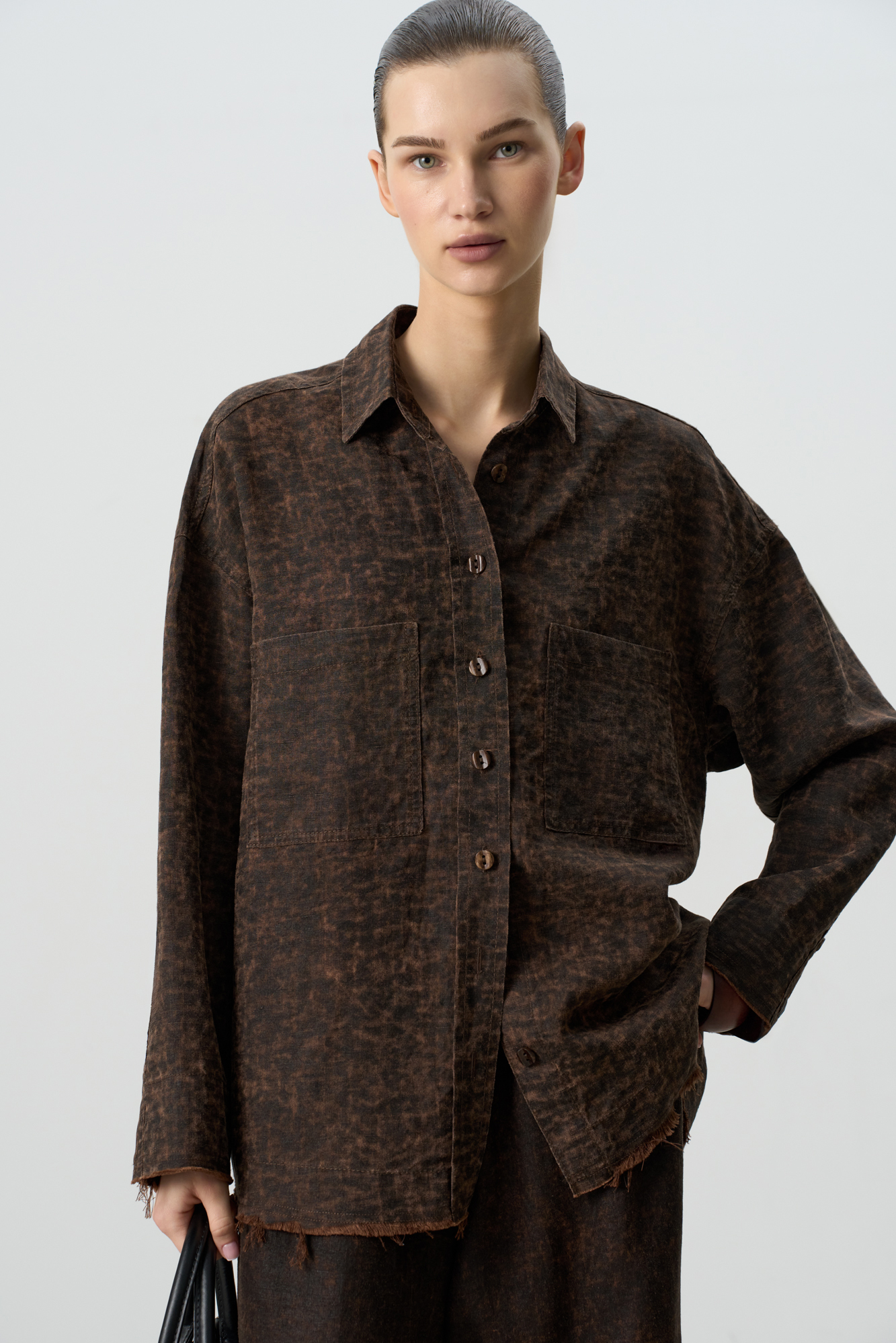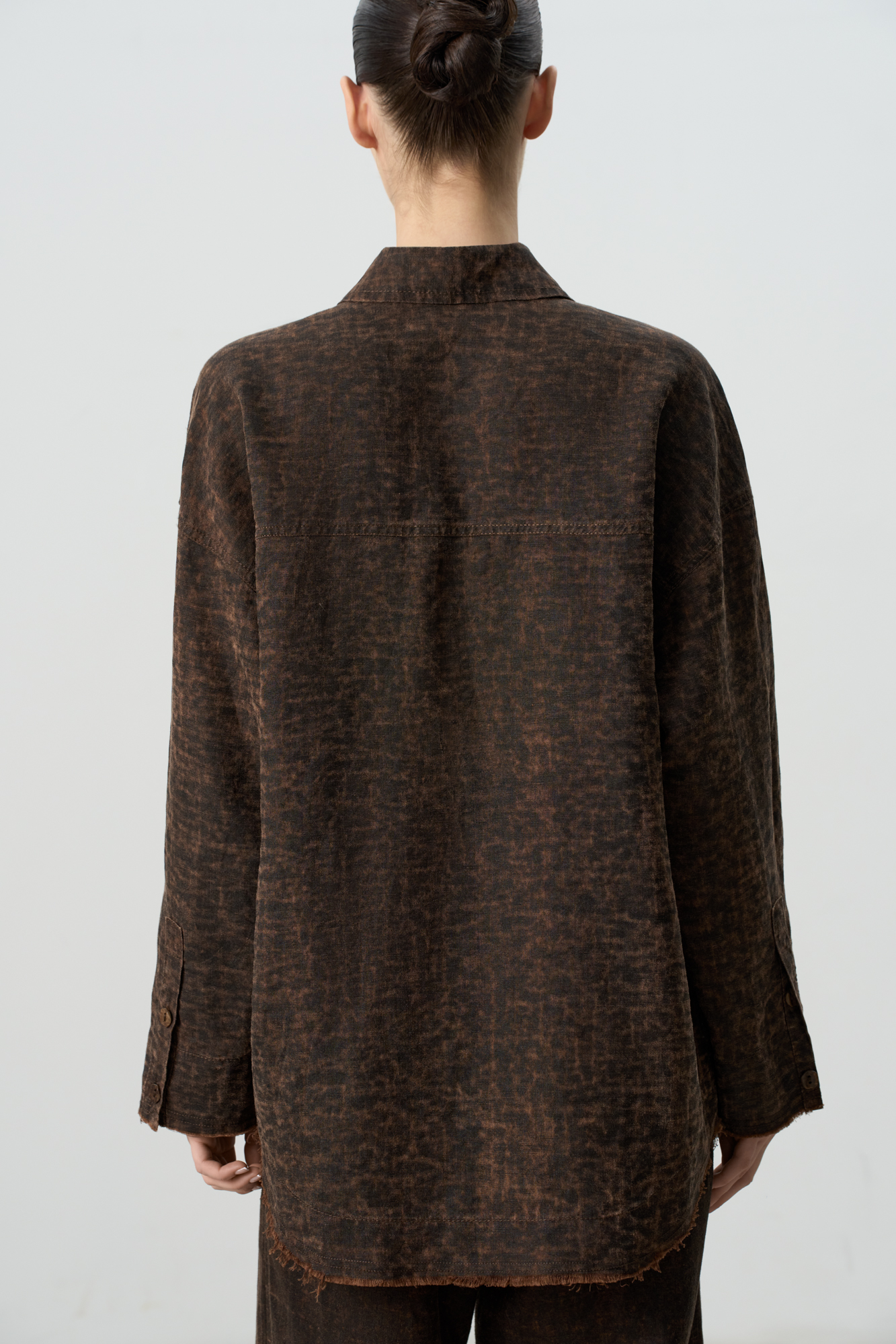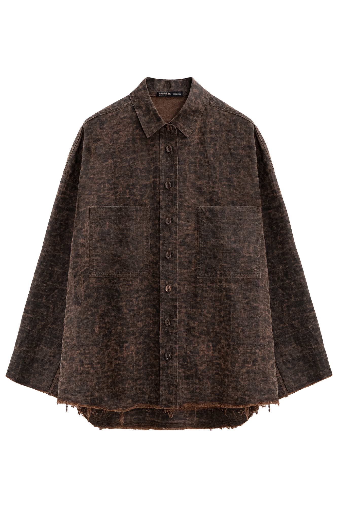 Рубашка изо льна с добавлением волокна крапивы. Модель свободного кроя, с длинными рукавами, классическим отложным воротником, двумя нагрудными карманами и застежкой на пуговицы. Изделие выполнено с эффектом необработанного края.