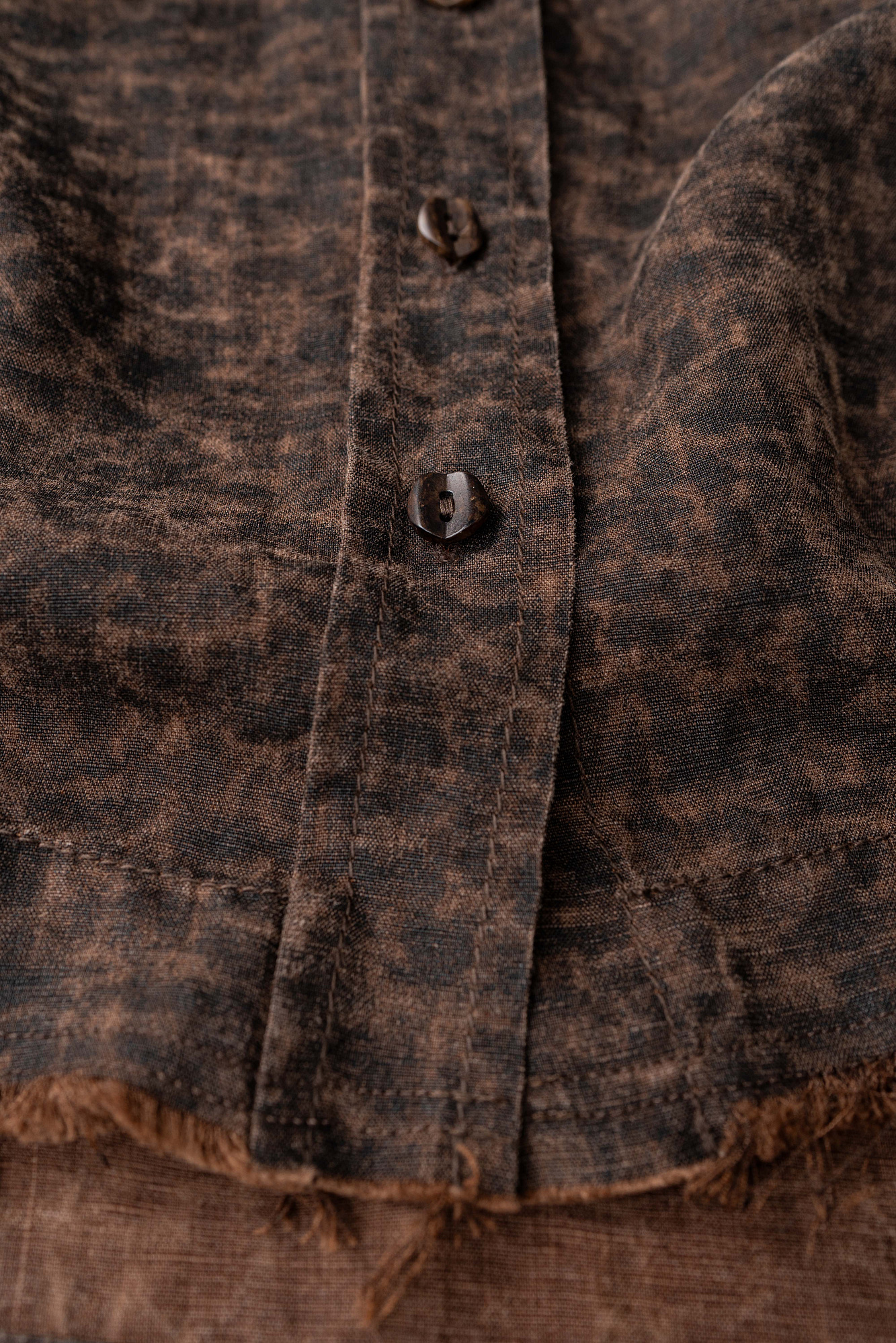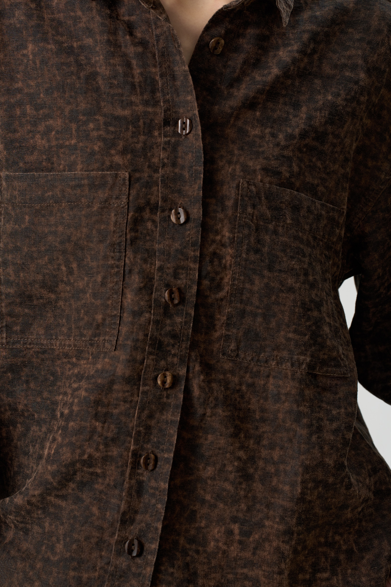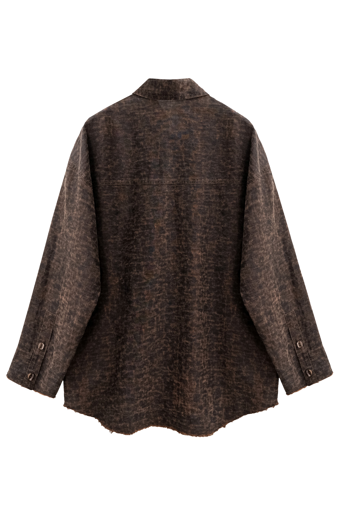 Рубашка изо льна с добавлением волокна крапивы. Модель свободного кроя, с длинными рукавами, классическим отложным воротником, двумя нагрудными карманами и застежкой на пуговицы. Изделие выполнено с эффектом необработанного края.